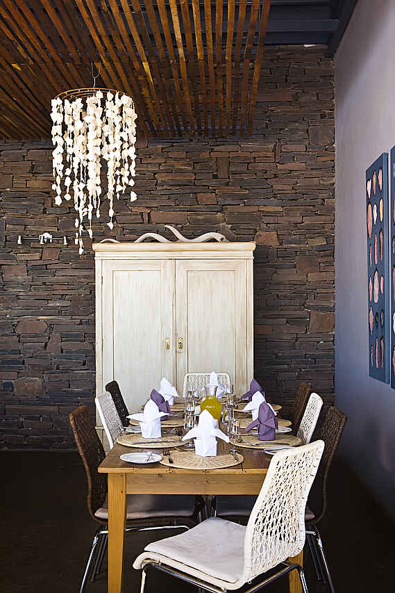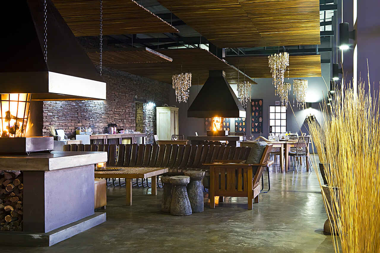 Hauptbereich mit Lounge und Feuerstelle, Essbereich im Inneren, sowie auf der großräumigen Terrasse, Bar, Bibliothek, traditioneller Handwerks- und Souvenirshop, sowie Swimmingpool mit integrierter Bar. Die Einrichtung besticht durch den Kontrast aus modernen Elementen, sowie durch von einheimischen Naturvölkern wie den San People hergestellten Accessoires und Einrichtungsgegenständen.