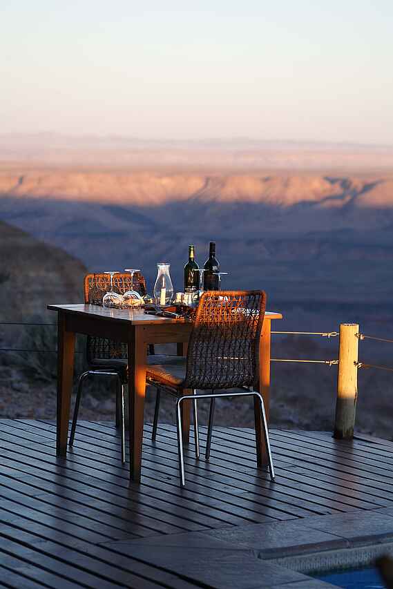 Vollpension: alle 3 Mahlzeiten werden zusammen mit den anderen Gästen der Lodge eingenommen. Frisch zubereitete traditionelle Mahlzeiten in Buffetform können im Innenbereich des Hauptgebäudes oder aber auf der Außenplattform verzerrt werden, mit Blick auf die Panoramalandschaft des Fish River Canyons.