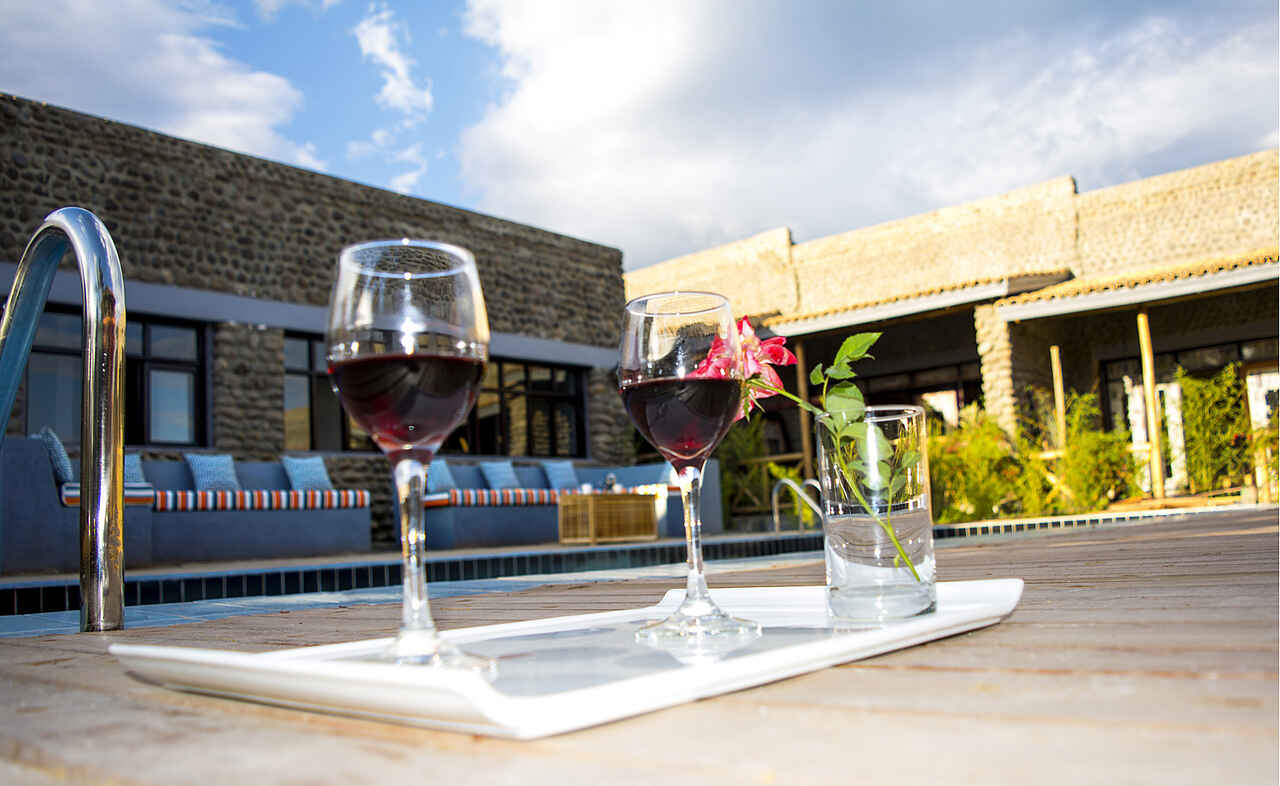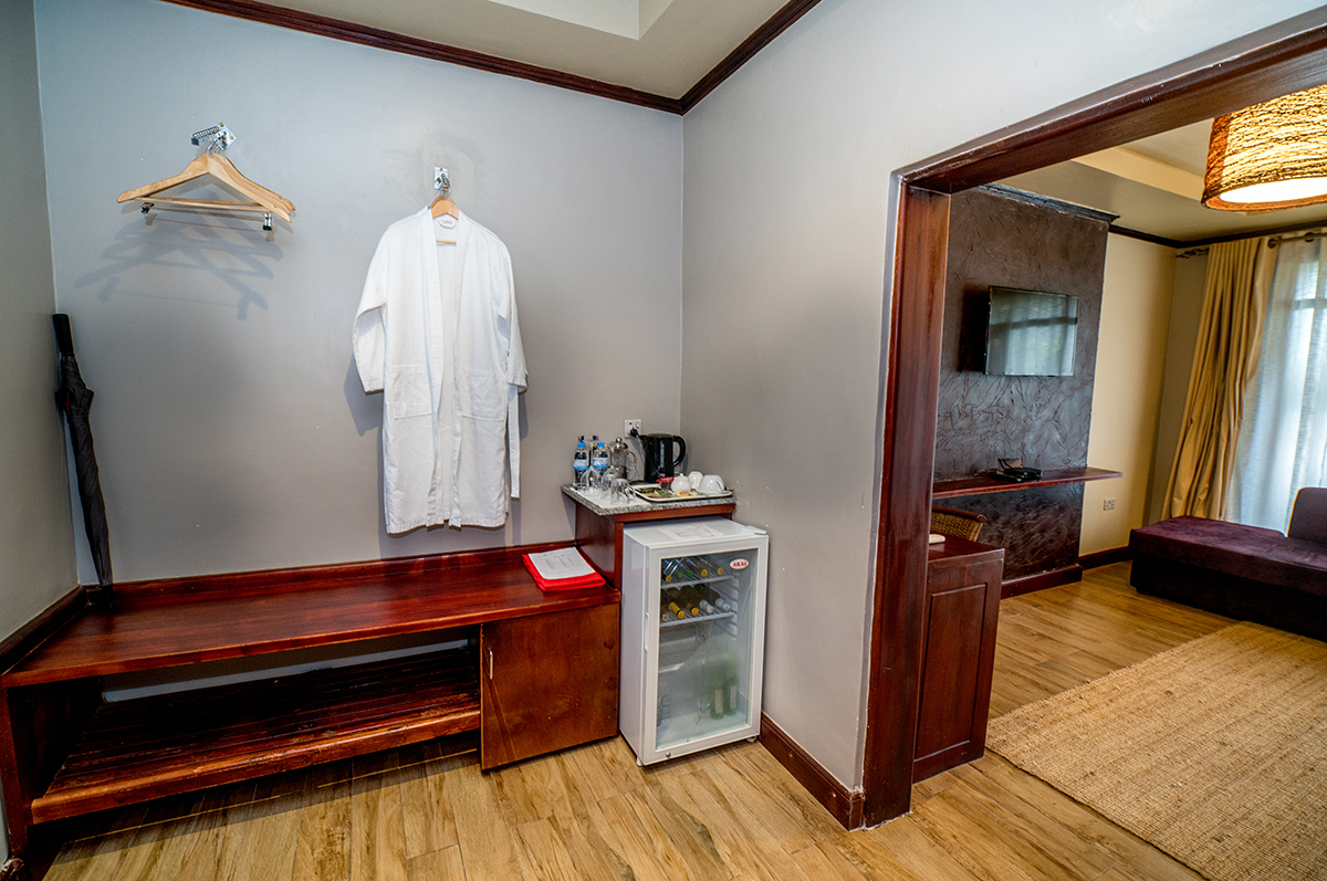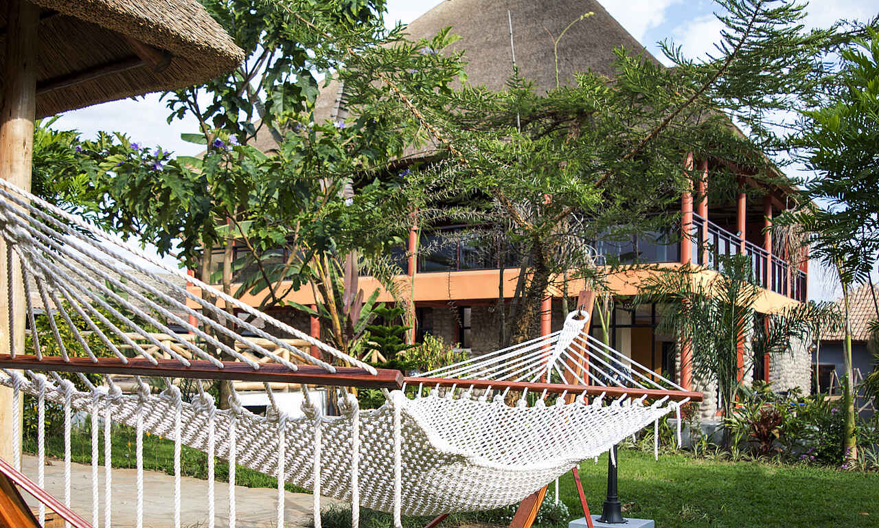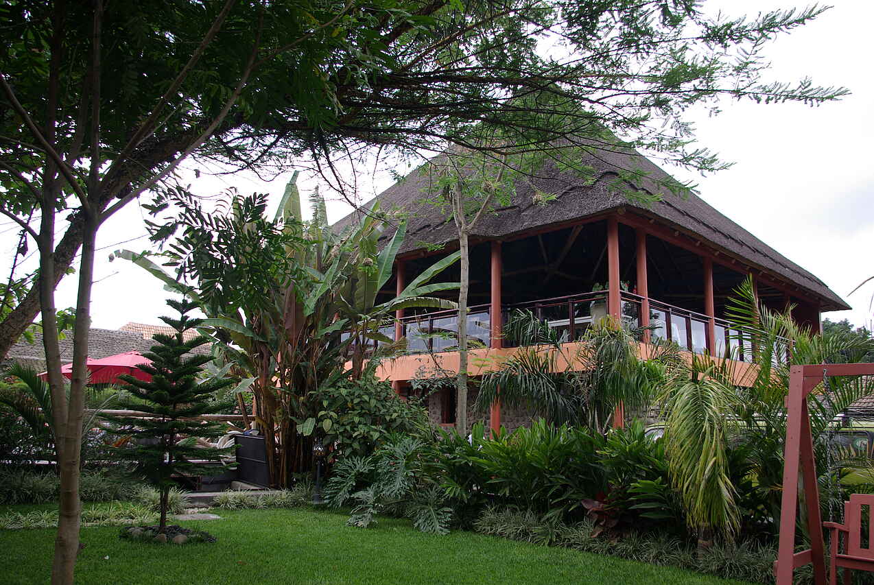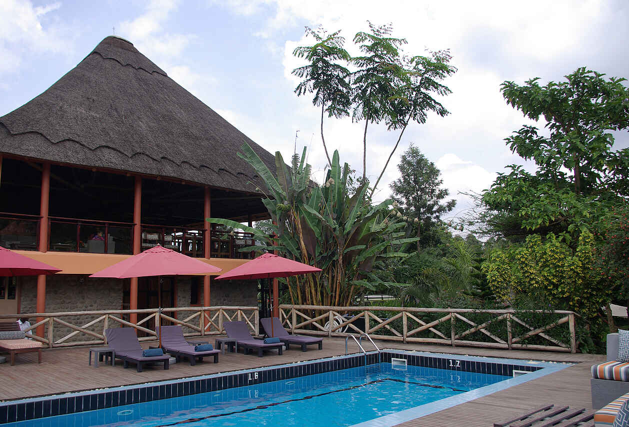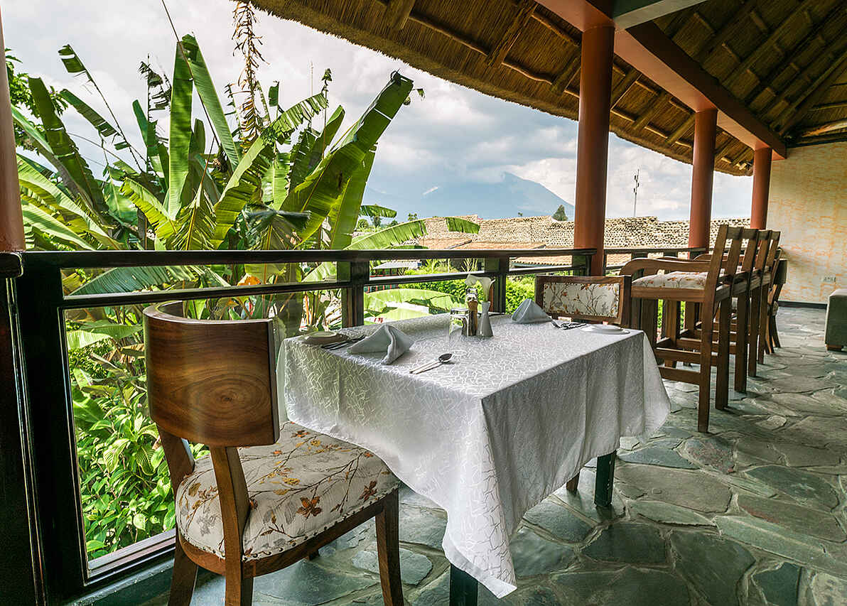 Das Hauptgebäude des Hotels hat im Erdgeschoss einen kleinen Empfang. Das große Restaurant und ein Gemeinschaftsbereich des Hotels befindet sich im ersten Stock. Die Lounge ist modern dekoriert und einem Fernseher und bequemen Sofas ausgestattet. Durch die großen Fenster hat meinen einen Ausblick auf das Schwimmbad, die Gärten und einen Panoramablick auf die Virguna-Vulkane.