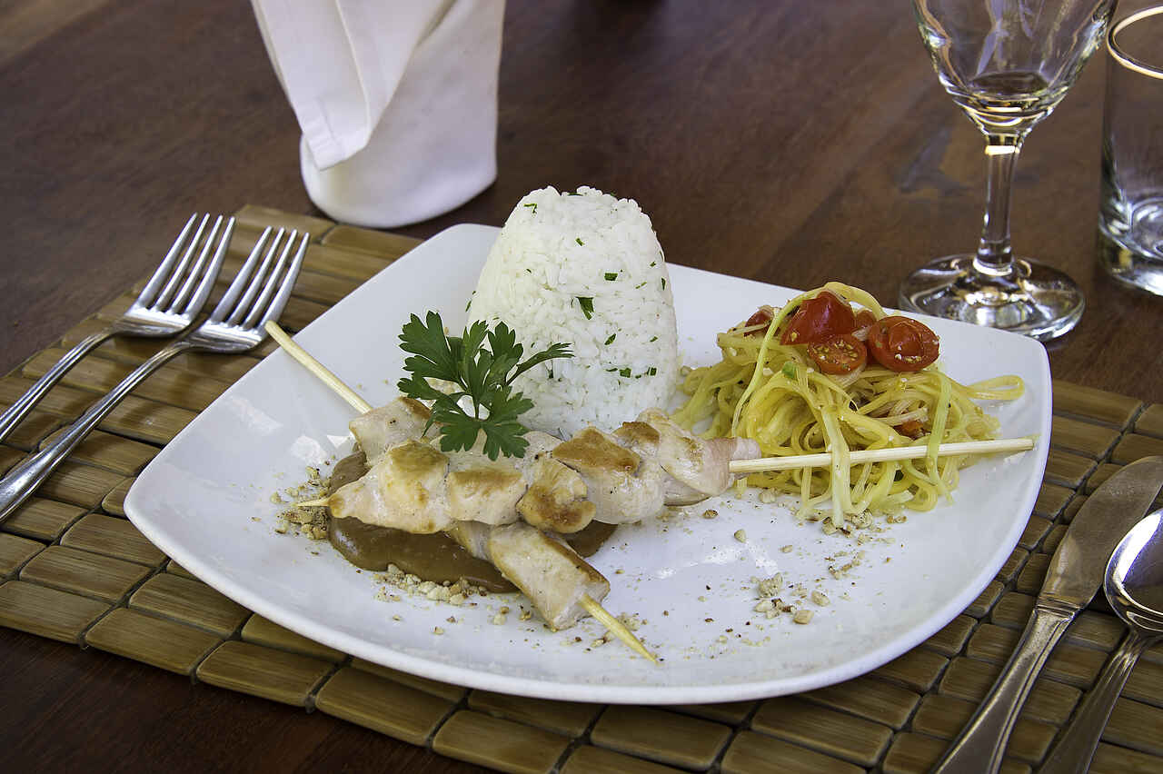 Main Area mit a la carte Restaurant und angeschlossener Bar und Swimming Pool. Die individuell eingerichteten Gästeunterkünfte sind um die Main Area herum angeordnet. Funk-, Mobifunk- und Internetempfang.