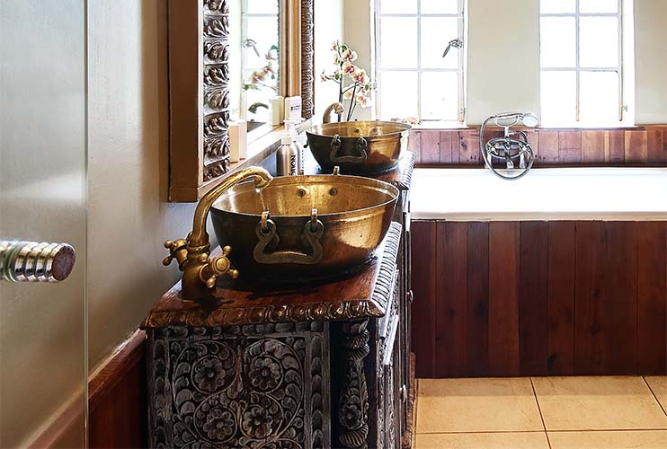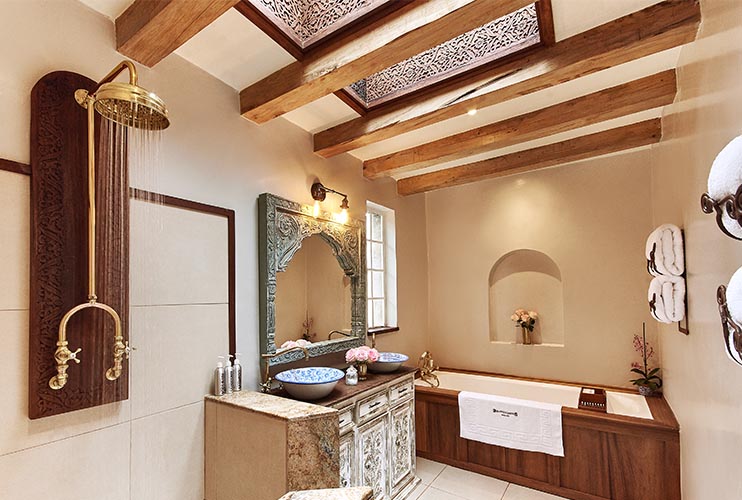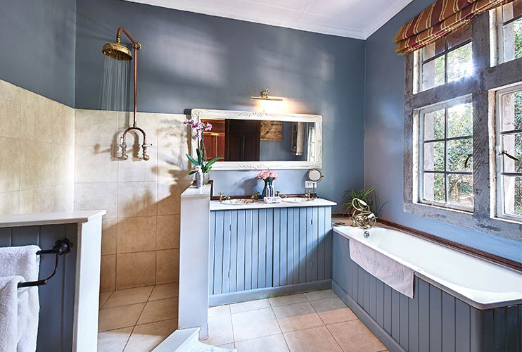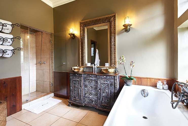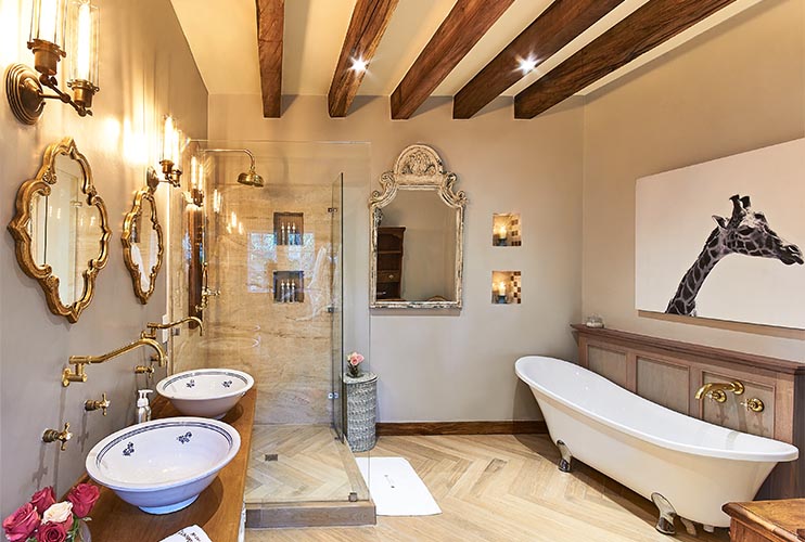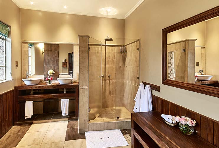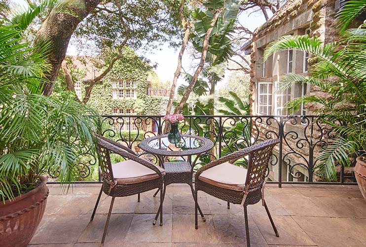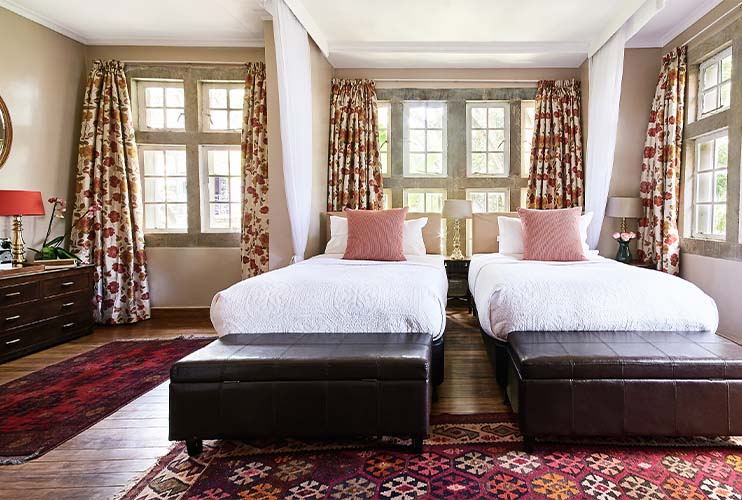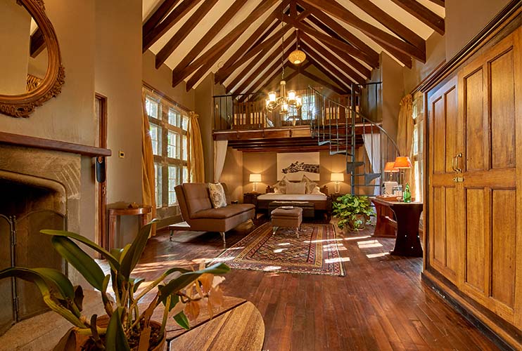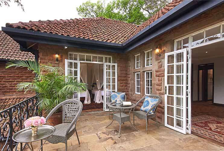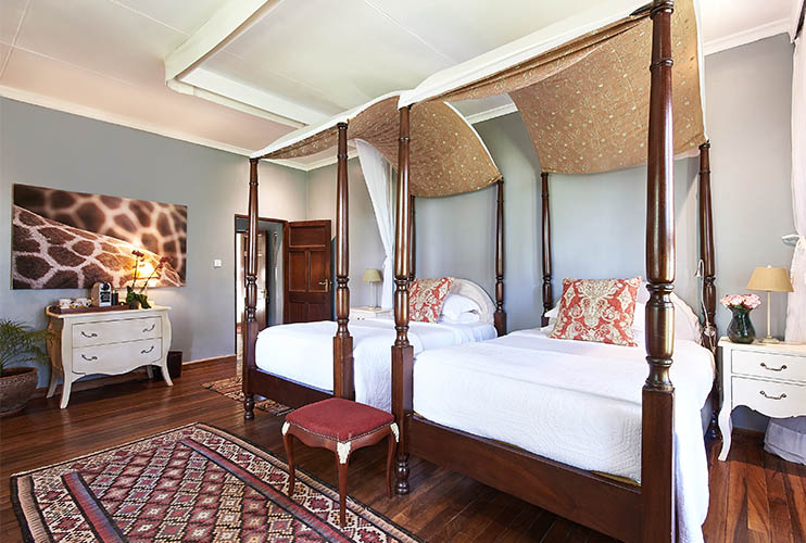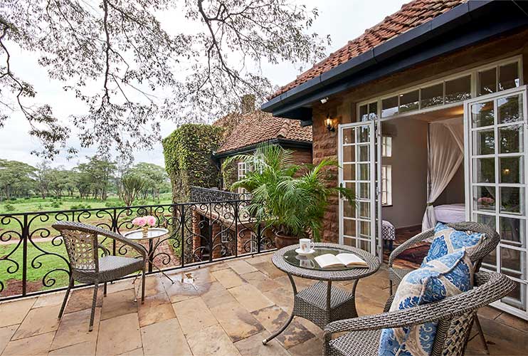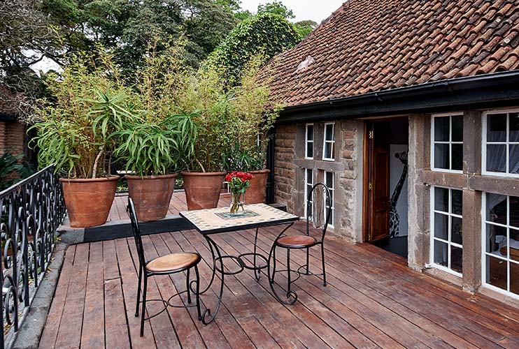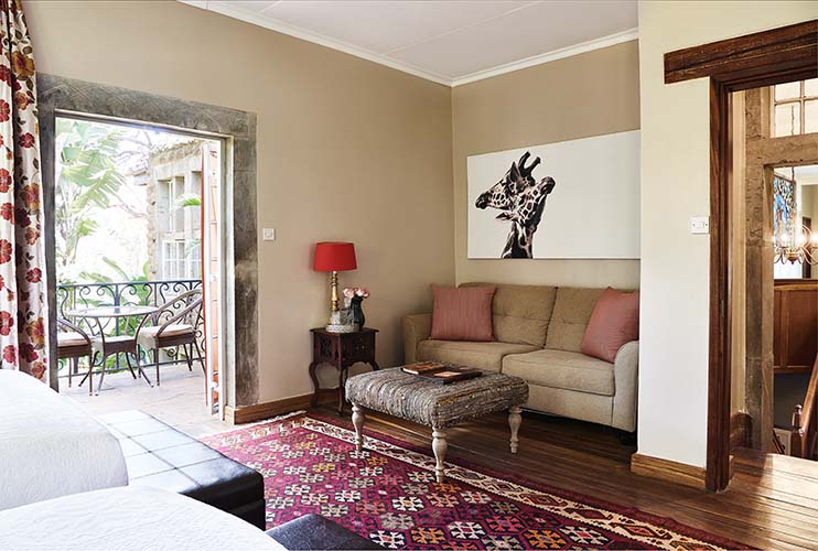 Das Hotel besteht aus 2 Hauptgebäuden im Stil der 30er Jahre mit mehreren Gebäudeflügeln. Die Fassade ist mit Efeu bewachsen. Die Räume sind im Kolonialstil eingerichtet. Es gibt eine zentrale Lounge mit Sitzgelegenheiten, ein Restaurant, eine Hotelbar. Der sonnendurchflutete Früchstücksraum mit antiken Möbeln und Teppichen ist morgens der erste Ort zum Kennenlernen der Giraffen, die die Hälse zum Fenster hineinstecken und auf Fütterung mit bereitgelegten Pellets warten. Eine weitere Gelegenheit zum Kontakt mit den Langhälsen besteht beim Afternoon Tea, der auf den Sonnenterrassen des Hotels serviert wird.