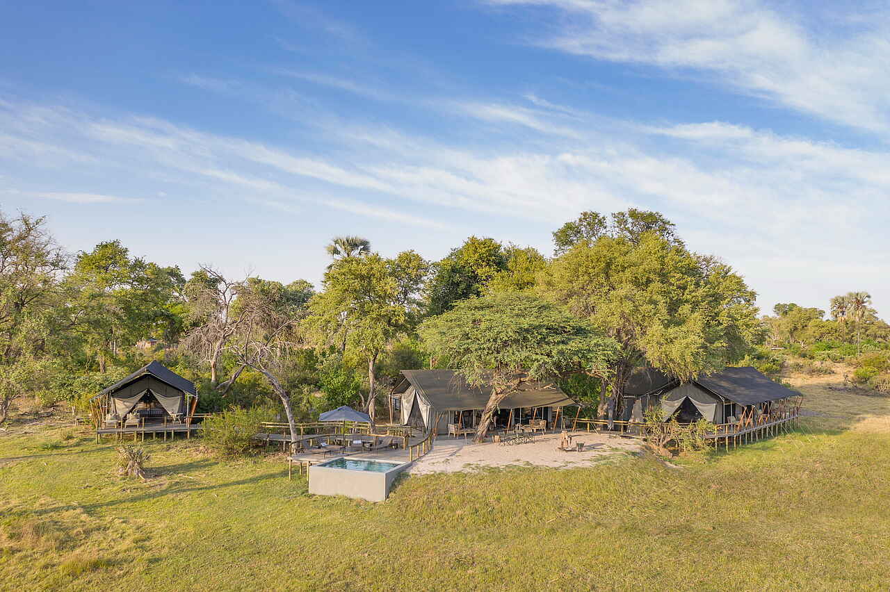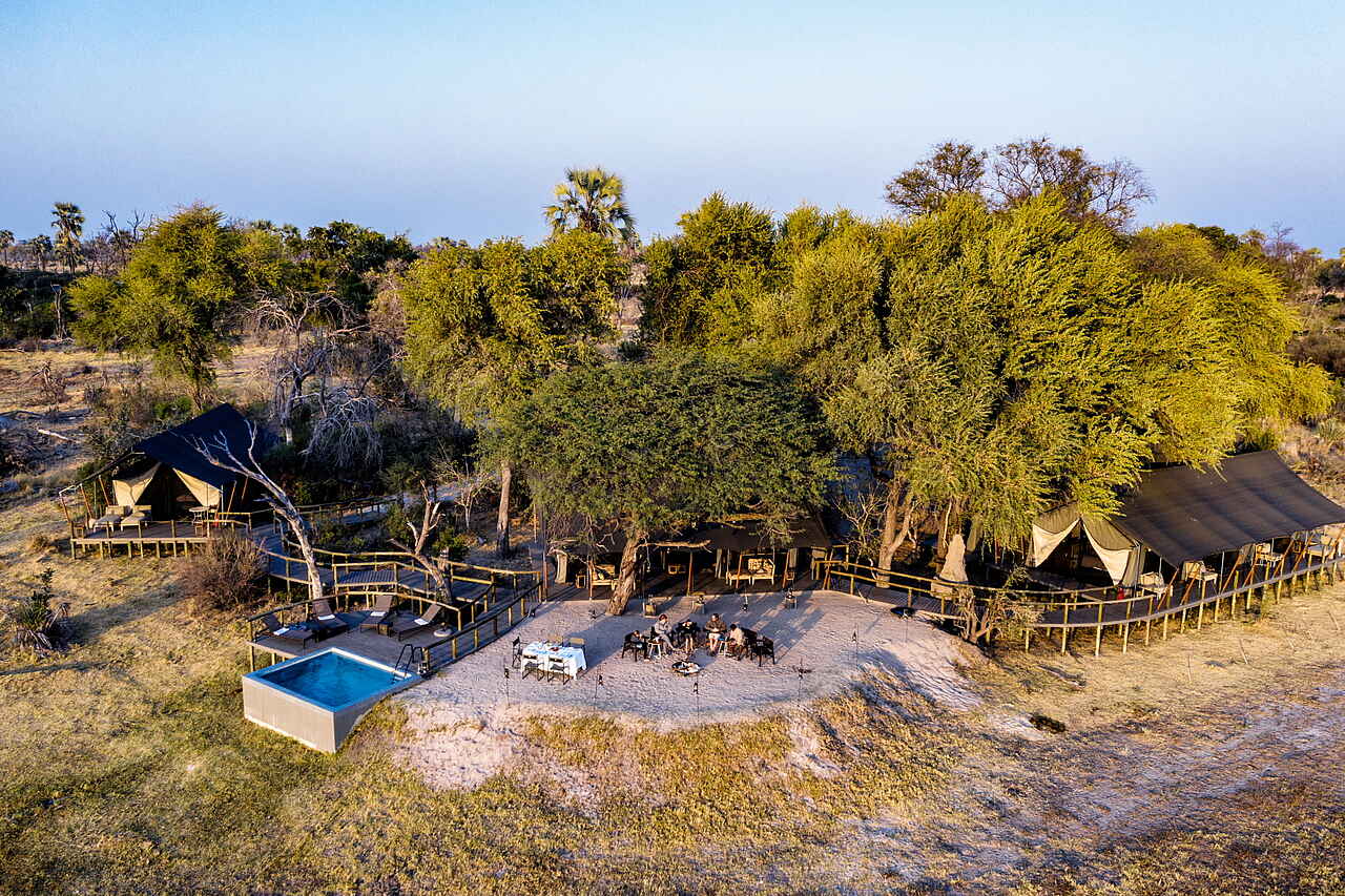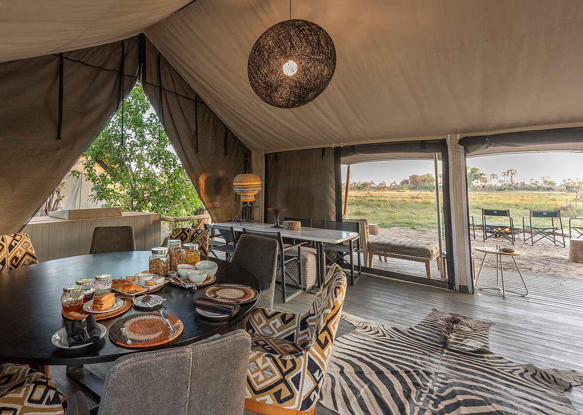 Die zentralen Einrichtungen des Gomoti Private Camps sind offen und übersichtlich gestaltet. Mittelpunkt ist der kleine Lounge- und Essbereich mit bequemen Sitzmöbeln, Teppichen und einer Bar. Von hier öffnet sich die Terrasse zum Flusslauf und bietet einen ruhigen Rahmen für Mahlzeiten und Pausen zwischen den Safaris. Ein Plunge Pool sorgt während der warmen Tagesstunden für Erfrischung, ergänzt durch schattige Sitzbereiche zum Zurücklehnen und Abschalten. Am Abend trifft man sich häufig an der Feuerstelle zu einem Aperitif und zum Austausch über die Erlebnisse des Tages. Die Atmosphäre ist bewusst ungezwungen, ohne feste Zeiten oder formelle Abläufe. WLAN steht in den Zelten zur Verfügung.