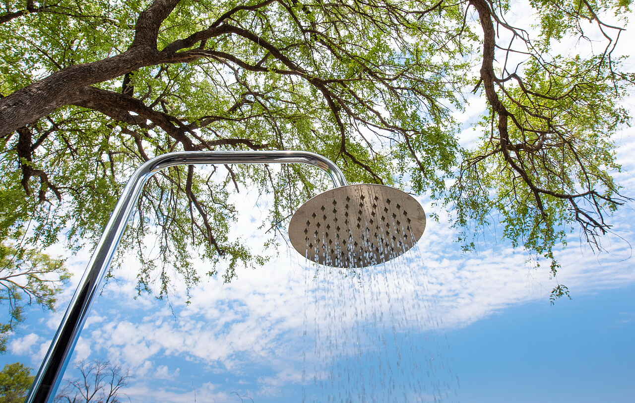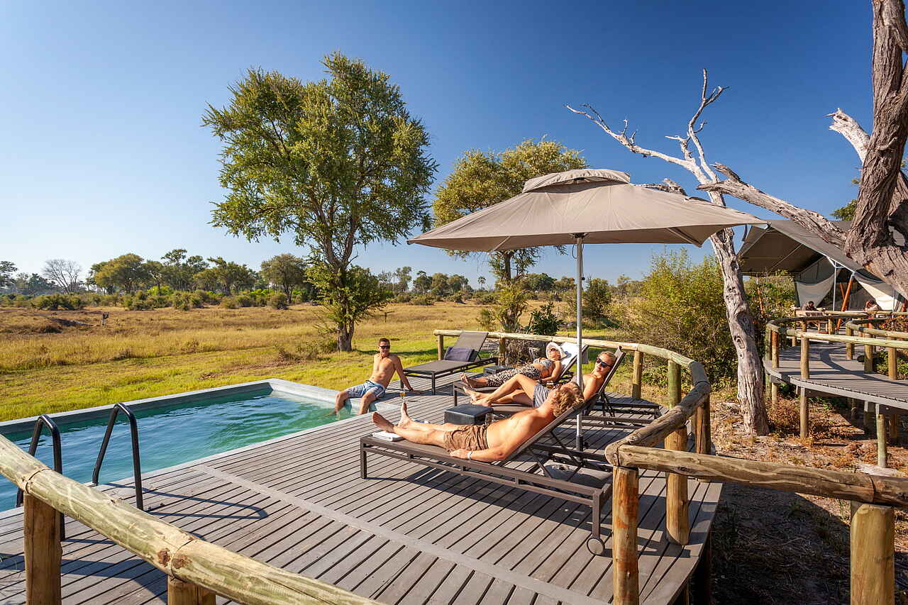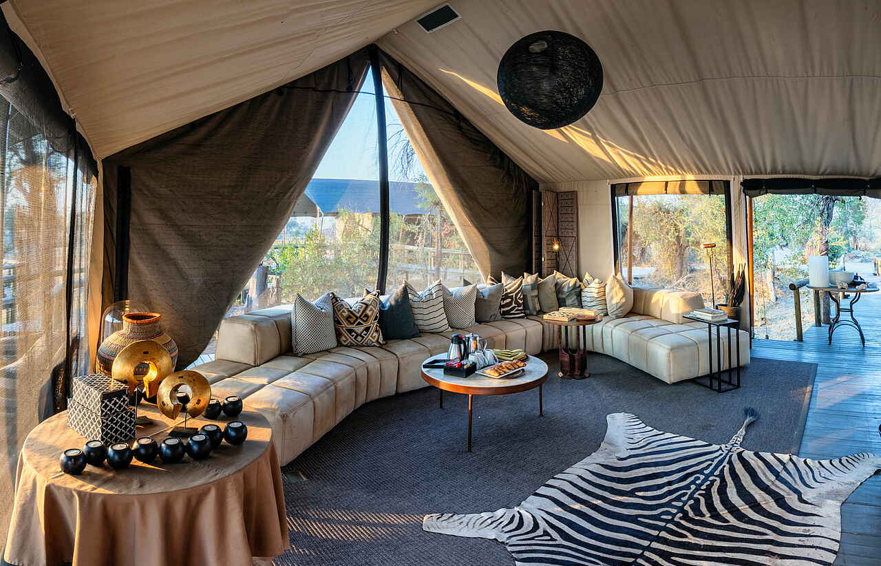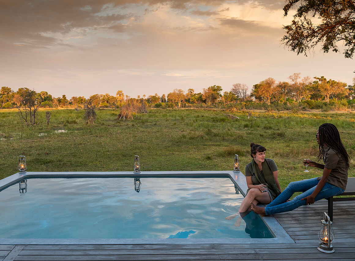 Die zentralen Einrichtungen des Gomoti Private Camps sind offen und übersichtlich gestaltet. Mittelpunkt ist der kleine Lounge- und Essbereich mit bequemen Sitzmöbeln, Teppichen und einer Bar. Von hier öffnet sich die Terrasse zum Flusslauf und bietet einen ruhigen Rahmen für Mahlzeiten und Pausen zwischen den Safaris. Ein Plunge Pool sorgt während der warmen Tagesstunden für Erfrischung, ergänzt durch schattige Sitzbereiche zum Zurücklehnen und Abschalten. Am Abend trifft man sich häufig an der Feuerstelle zu einem Aperitif und zum Austausch über die Erlebnisse des Tages. Die Atmosphäre ist bewusst ungezwungen, ohne feste Zeiten oder formelle Abläufe. WLAN steht in den Zelten zur Verfügung.