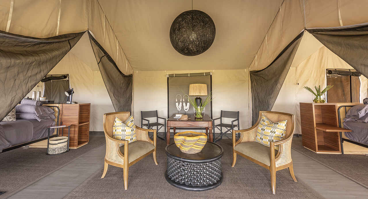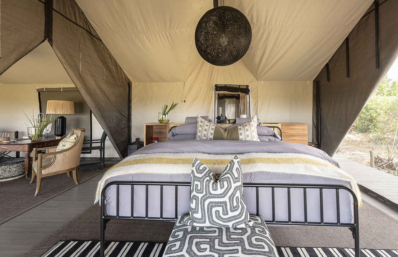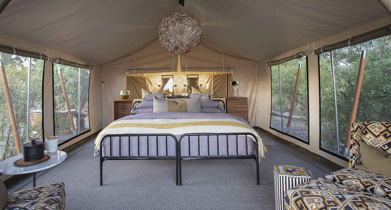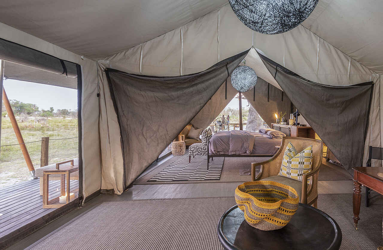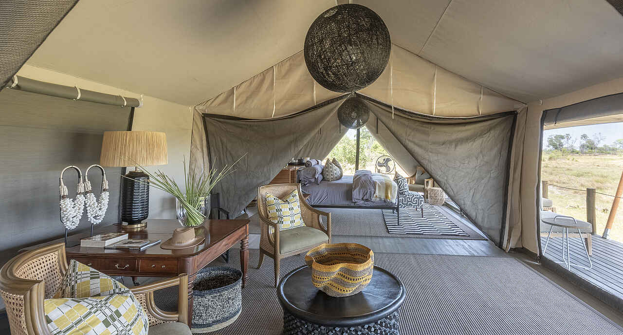 Die zwei Zeltsuiten des Gomoti Private Camps sind großzügig gestaltet und bieten viel Platz zum Wohlfühlen. Doppelbetten mit hochwertigen Matratzen, Nachttische, Sitzgelegenheiten und ausreichend Stauraum sorgen für einen angenehmen Komfort. Große Türen öffnen sich zur eigenen Terrasse mit Sitzmöbeln und Tagesbetten und schaffen eine offene, entspannte Atmosphäre. Zur Ausstattung gehören eine Minibar, Kaffee- und Teezubereitungsmöglichkeiten und Ventilatoren. Die geräumigen En-suite-Badezimmer verfügen über eine Spültoilette, Doppelwaschbecken, eine Dusche sowie eine separate Outdoor-Badewanne. Handtücher und Pflegeprodukte stehen zur Verfügung. Eine der Suiten ist etwas größer und als Familiensuite ausgelegt. Sie bietet zwei separate Schlafzimmer, jeweils mit eigenem En-suite-Badezimmer.