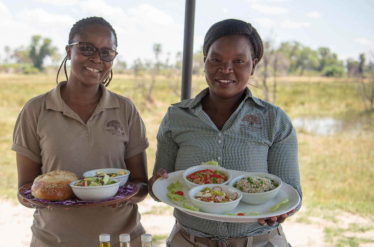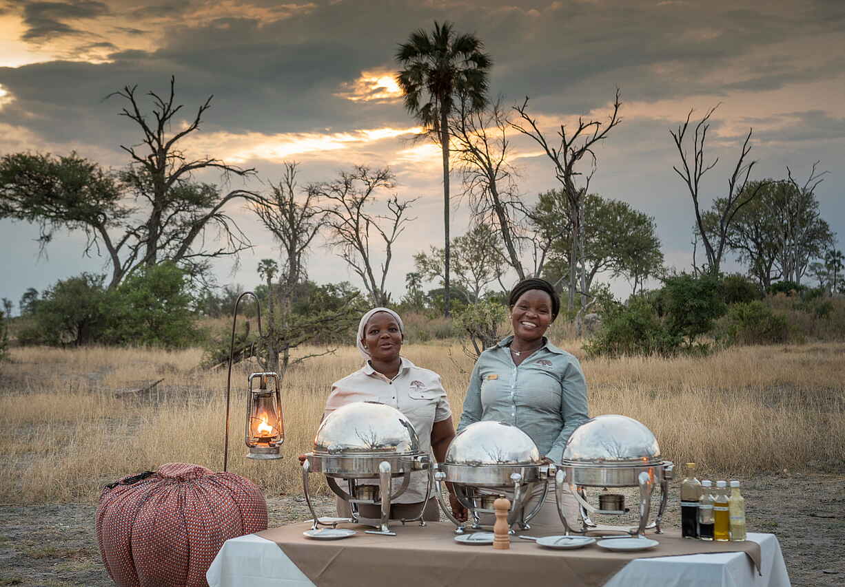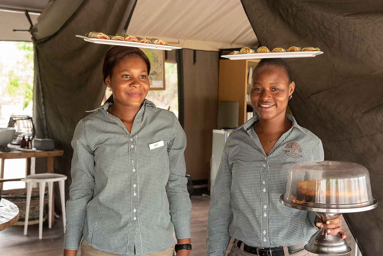 Serviert werden frisch zubereitete Mahlzeiten mit internationalen und regionalen Einflüssen, die je nach Tagesablauf im Camp, auf der Terrasse oder als Picknick während längerer Safaris eingenommen werden. Alle Mahlzeiten sowie Softdrinks, lokale Weine, Bier und ausgewählte Spirituosen sind inklusive. Besondere Ernährungswünsche werden nach vorheriger Absprache gerne berücksichtigt. Durch die private Nutzung des Camps lassen sich Essenszeiten flexibel an die geplanten Aktivitäten anpassen.