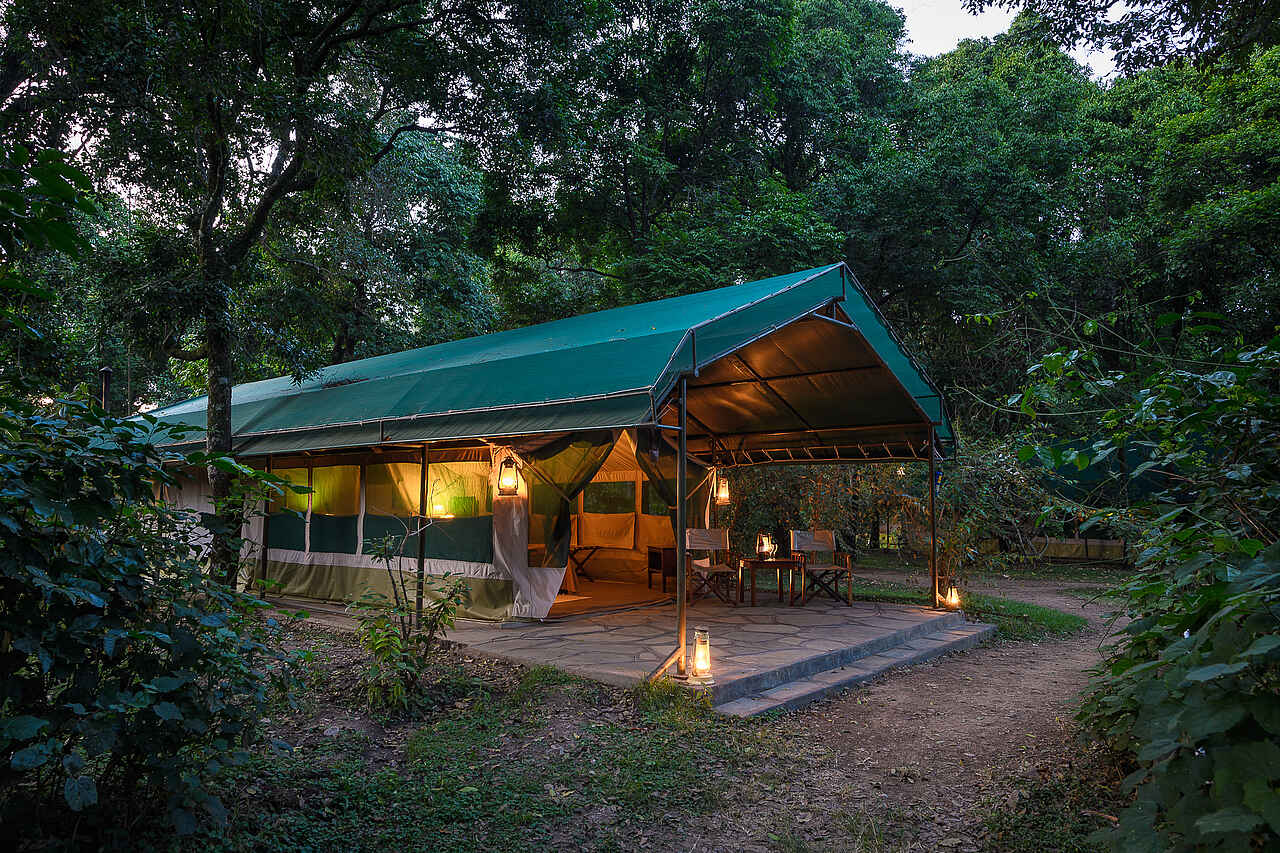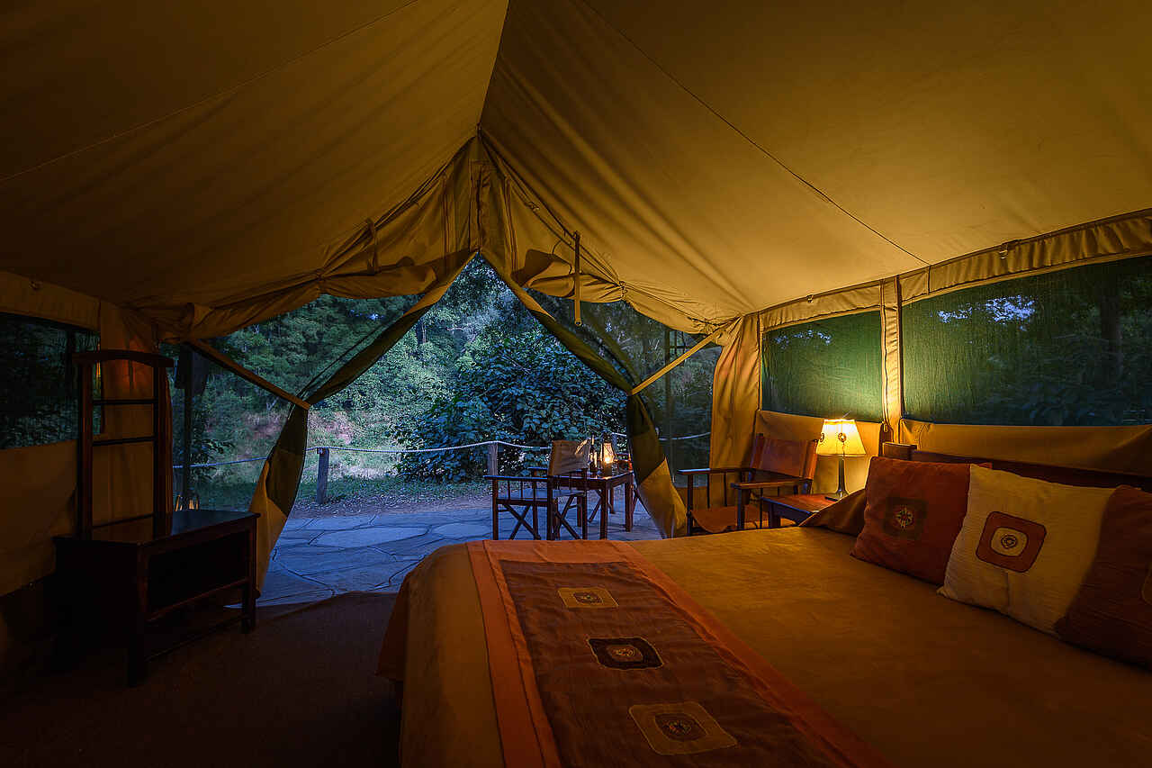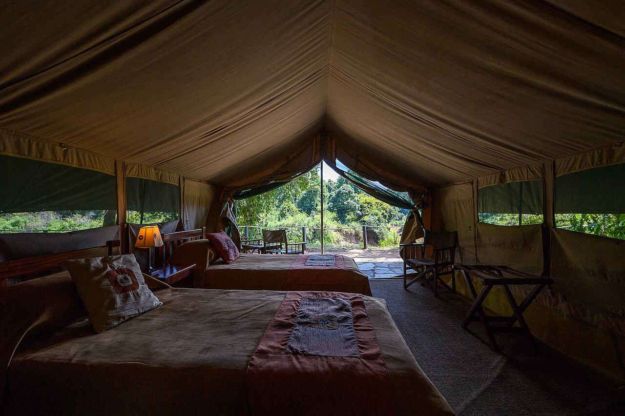 24 Zelte mit 2 Einzelbetten, 12 Zelte mit Doppelbetten, 1 Suite; alle Zelte mit eigener Veranda und En-Suite-Badezimmern mit Waschbecken, Dusche, Spültoilette, heißem und kalten Wasser.
