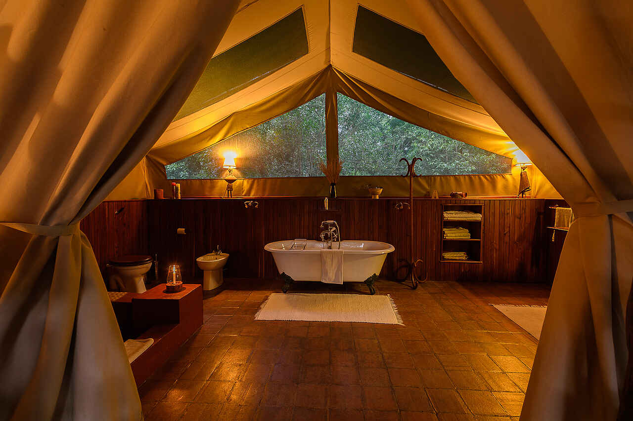 10 geräumige Luxus-Zelte mit eigenem Badezimmer (Badewanne, Dusche, Doppelwaschbecken, Spültoilette, heißes und kaltes Wasser) und privater Veranda bieten Platz für 20 Gäste. Die offene Bar und der separate Restaurantbereich stehen allen Gästen zur Verfügung.