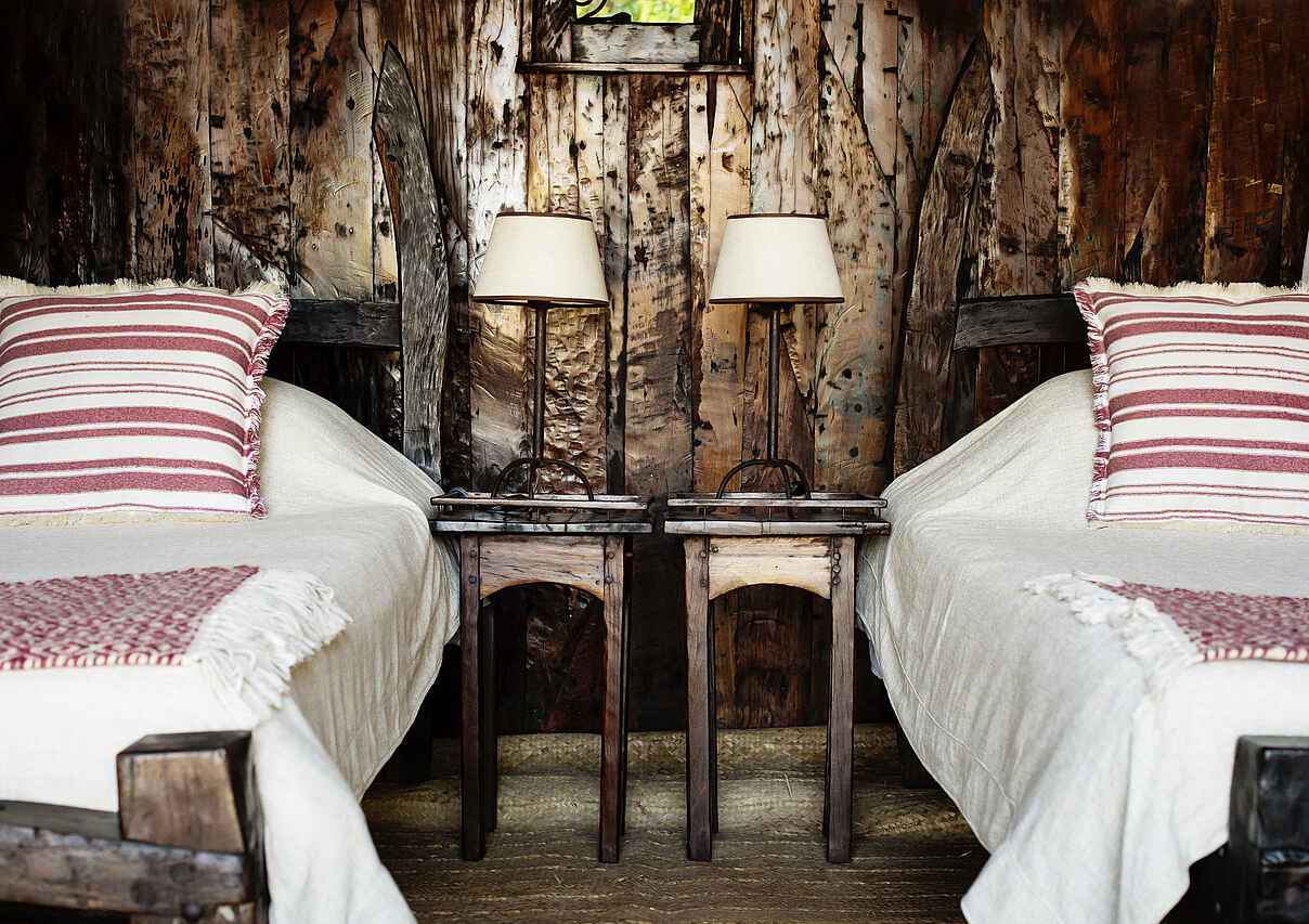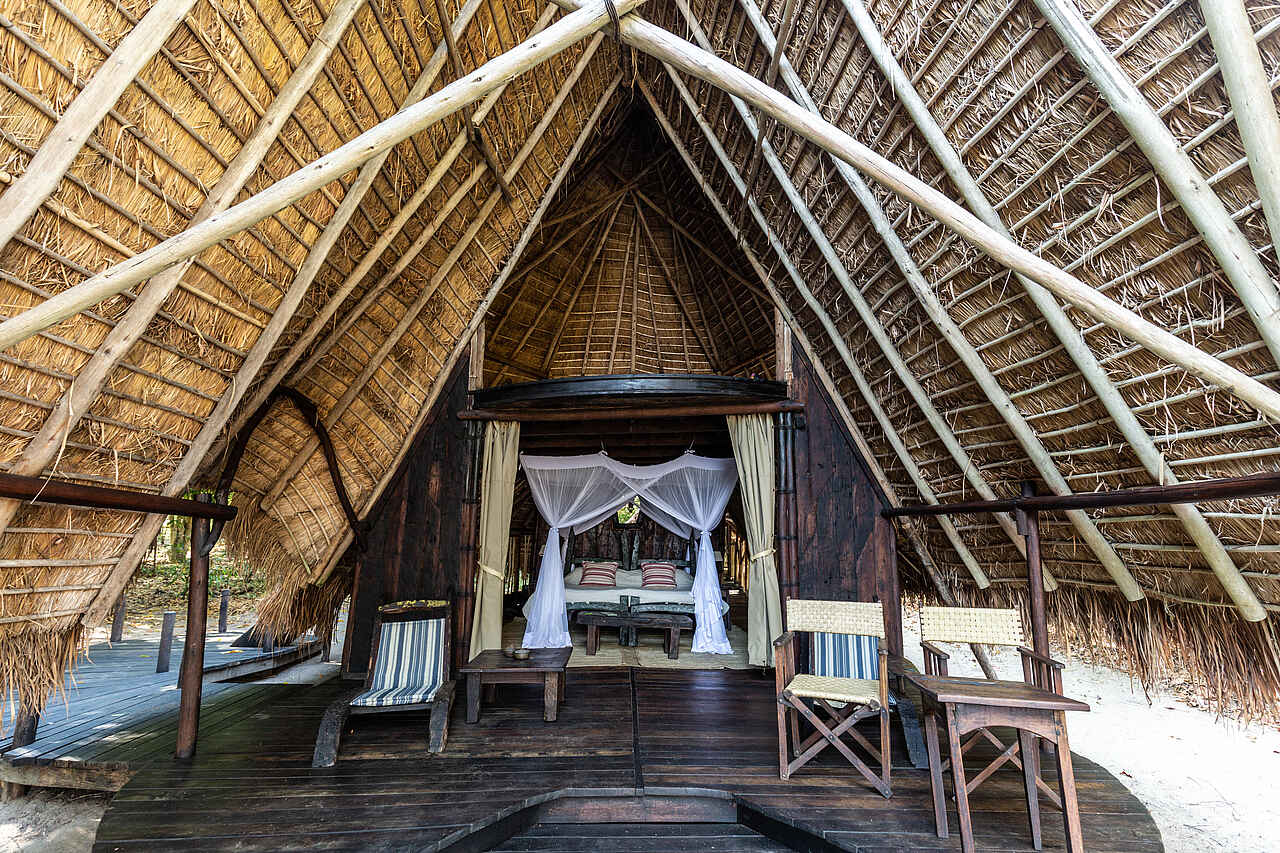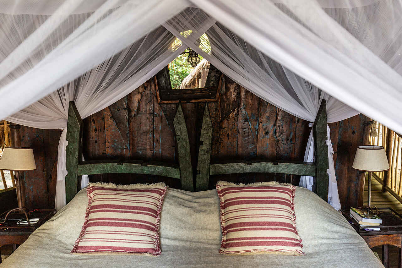 Die acht Bandas der Greystoke Mahale Lodge sind offen gestaltete Holz- und Strohbauten, die sich dezent in den Hang am Rand des Waldes einfügen. Sie bieten viel Privatsphäre und eröffnen einen weiten Blick über den weißen Sandstrand hinweg auf den Tanganyika-See. Der Schlafbereich ist großzügig geschnitten und mit einem Doppelbett oder zwei Einzelbetten unter einem schützenden Moskitonetz ausgestattet. Ergänzt wird die Einrichtung durch einen kleinen Schreibtisch, Regale und gemütliche Sitzgelegenheiten. Wände aus Holzstämmen und Segeltuch lassen sich je nach Wetterlage öffnen oder schließen und sorgen so für eine enge Verbindung zur umgebenden Natur. Jedes Banda verfügt über ein halboffenes Badezimmer mit Spültoilette, Waschbecken und einer Dusche mit fließendem Wasser, bei der sich während des Duschens der Blick ins dichte Grün genießen lässt.