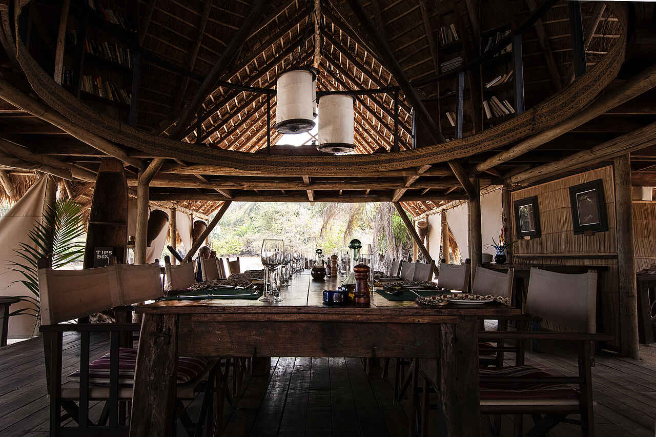 Das offen gestaltete Hauptgebäude der Greystoke Mahale Lodge liegt direkt am Ufer und eröffnet einen weiten Blick über den Tanganyika-See und die umgebende Natur. Die offene Bauweise mit hohem Palmstrohdach lässt Licht und Luft ungehindert einströmen und schafft eine entspannte, naturnahe Atmosphäre. Im Inneren befinden sich der Speisebereich sowie gemütliche Sitzecken mit Informationsmaterial zur Tierwelt und zur Schimpansenforschung im Mahale-Gebirge. Weiche Sitzkissen, Gesellschaftsspiele und eine Auswahl an Büchern laden zum Lesen, Spielen oder einfach zum Verweilen ein. Eine kleine Boutique bietet handverlesene Souvenirs und stilvolle Geschenke. Etwas zurückgezogen auf einem Felsvorsprung am Rand des Strandes befindet sich die Sunset Bar, ein stimmungsvoller Ort für einen Aperitif mit Blick auf den See.