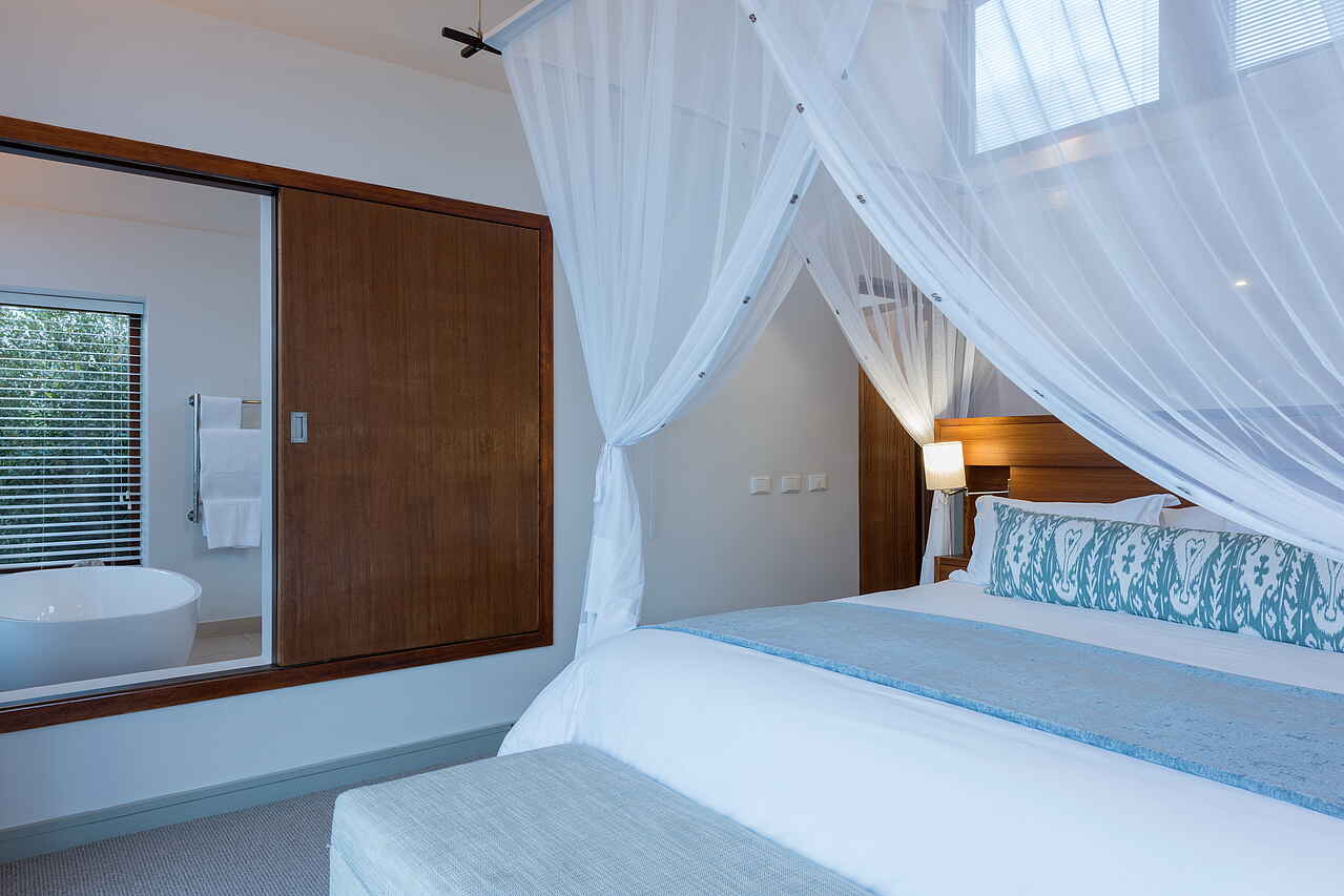 Die Forest Lodge bietet insgesamt 16 exquisite Suiten, die über gepflasterte Wege durch den Milkwood-Wald mit dem Gemeinschaftsgebäude verbunden sind. Die luxuriösen Suiten sind geräumig und bestehen aus einem Schlafzimmer, einem separaten Wohnzimmer, zwei Badezimmern und einer Außenveranda. Natürliche Texturen und Farben prägen das Innere der Suiten. Jedes Schlafzimmer verfügt über ein großes Himmelbett, umgeben von Moskitonetzen. Von hier aus können Gäste durch raumhohe Glasschiebetüren auf die private Veranda mit Außendusche treten und die herrliche Aussicht genießen.