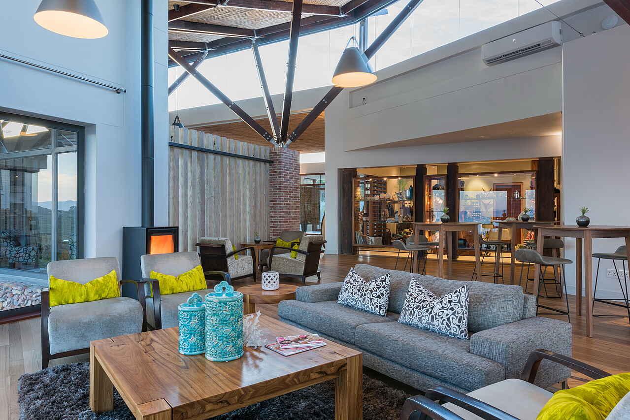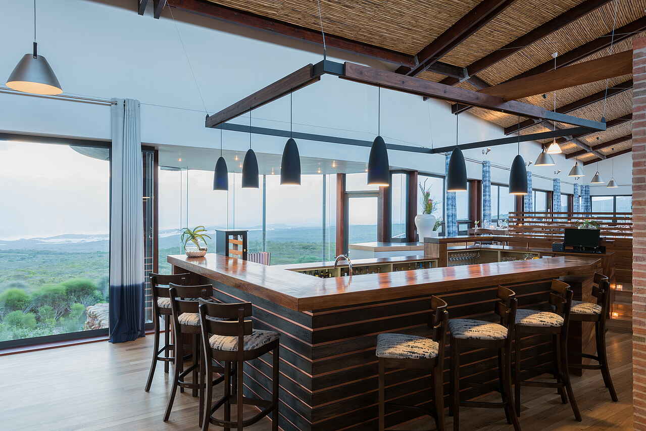 Der Name Grootbos bedeutet "großer Wald" und verweist auf den eindrucksvollen, uralten Milkwood-Wald mit seinen knorrigen Bäumen und dem süßlichen Duft, der die Umgebung der Forest Lodge prägt. Die Lodge wurde mit viel Eleganz und Raffinesse aus lokalem Sandstein und nachhaltigem Holz erbaut. Der großzügige und moderne Hauptbereich besticht durch seine Helligkeit und Luftigkeit, wobei raumhohe Fenster einen atemberaubenden Blick über die mit Fynbos bewachsenen Hänge, die Dünen, die Walker Bay und an klaren Tagen sogar bis zum Cape Point bieten. Zentraler Punkt ist die einladende Rezeption, flankiert von einer gemütlichen Lounge mit Kamin und Bar auf der einen Seite sowie einem eleganten Speisesaal auf der anderen Seite.