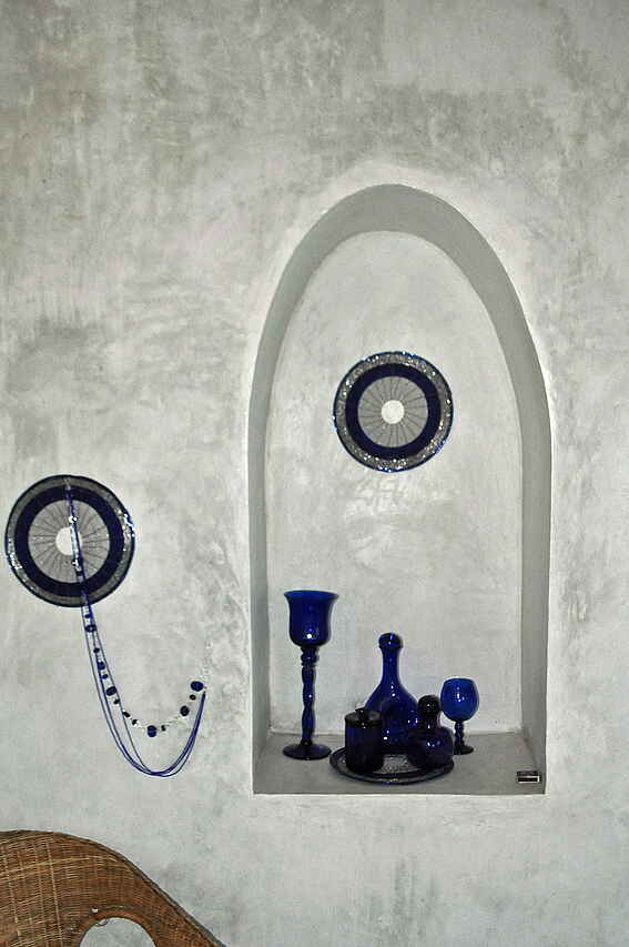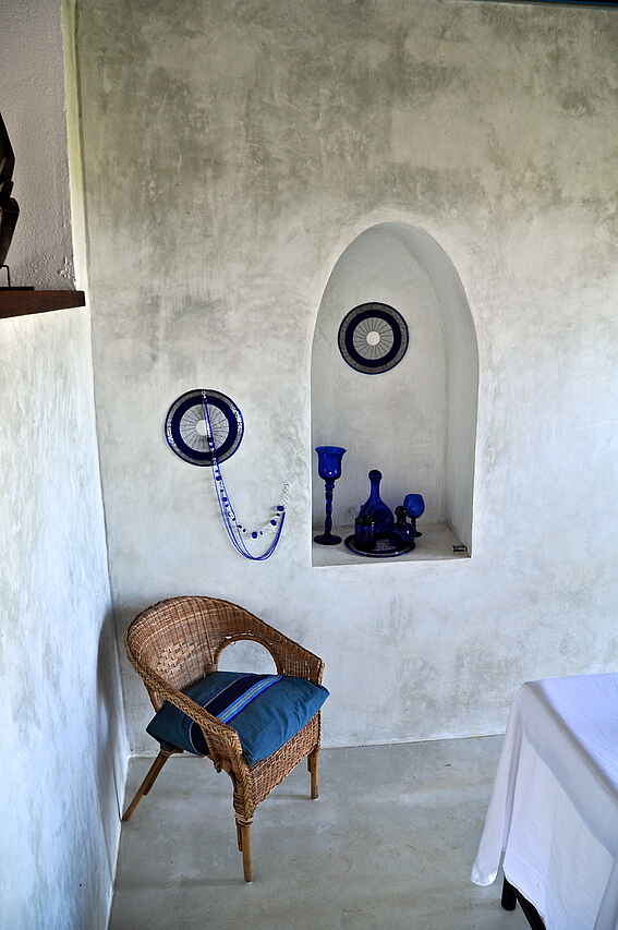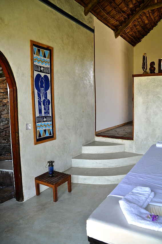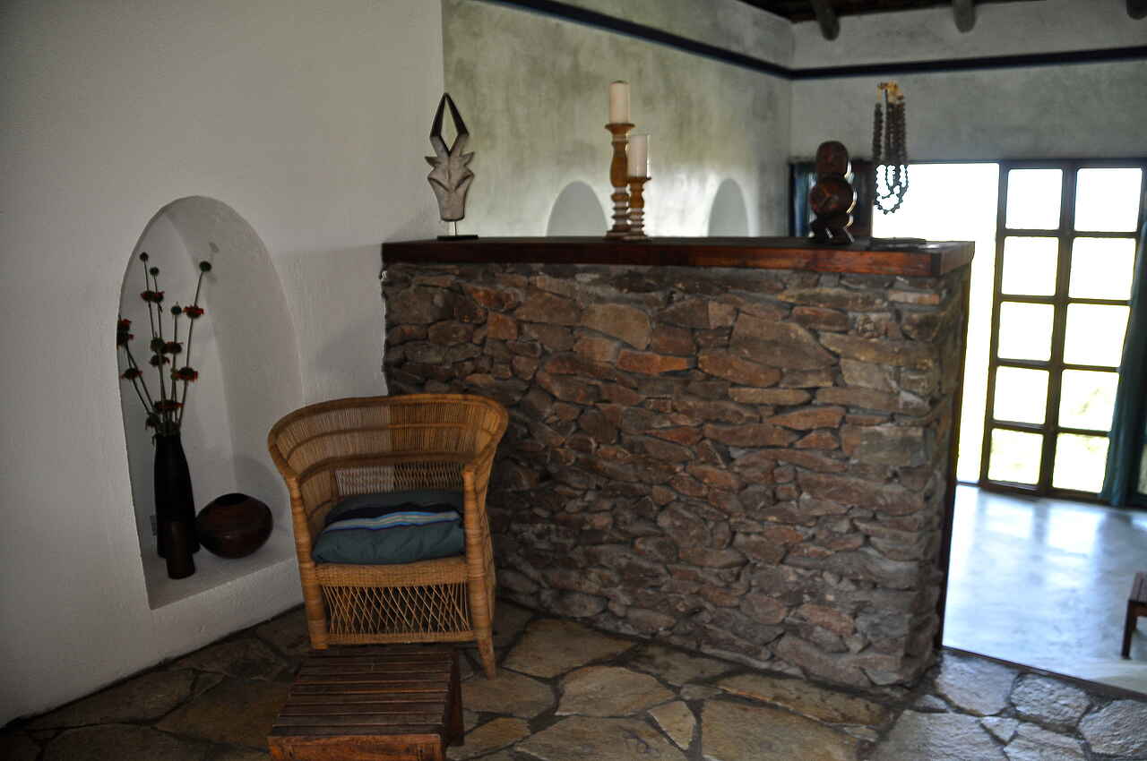 Der Hauptbereich bestehend aus Loungebereich mit integrierter Bar, Speisesaal, kleiner Innenhofterrasse, kleiner Honeymoon-Terrasse und großer offener Außenterrasse am Rande der Anhöhe ist aus Stein gebaut und mit Gras gedeckt. Alle Möbel sind aus Holz, gusseisernem Metall oder Korb hergestellt. Hier gibt es Wifi-Zugang. Daneben findet sich ein in den Felsen eingelassener Pool mit Sonnenterrasse, Poolhaus, Toiletten, Umkleideräumen und einem Massageraum.