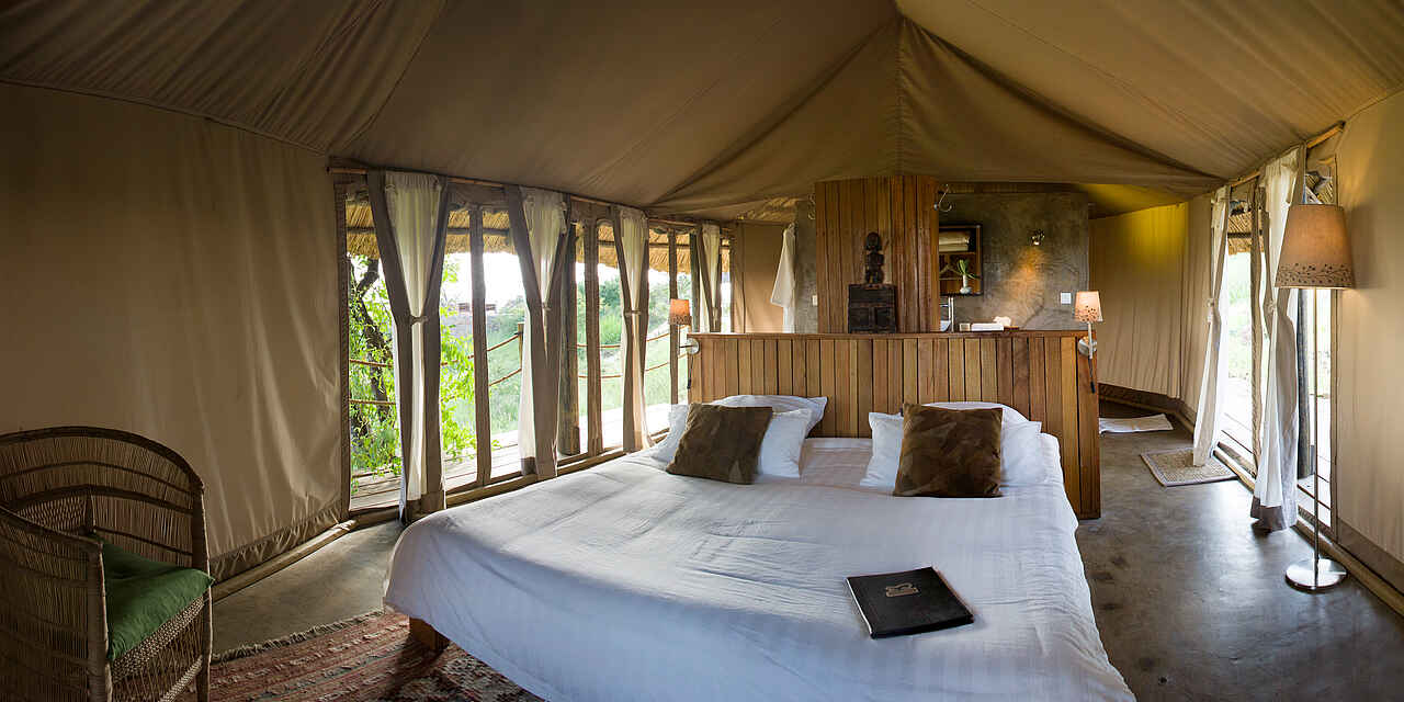 Die 16 Gästezelte stehen alle auf aus Naturstein gemauerten Plattformen mit einem Gras gedeckten Dach und umfassen auch eine private Terrasse mit zwei Regiestühlen aus Segeltuch und einem Beistelltisch. Im Inneren der Segeltuchwände befindet sich der Schlafbereich mit einem Doppelbett, einem Korbsessel, einer Truhe als Beistelltisch, einem Wandschrank und einem Klapphocker. Dahinter befindet sich ein en-suite Badezimmer mit Waschtisch, Spültoilette, Spiegel und Dusche. Das fließende Wasser kann 24 Stunden erhitzt werden, dies geschieht über Solarenregie und Generator, die auch für Elektrizität sorgen.