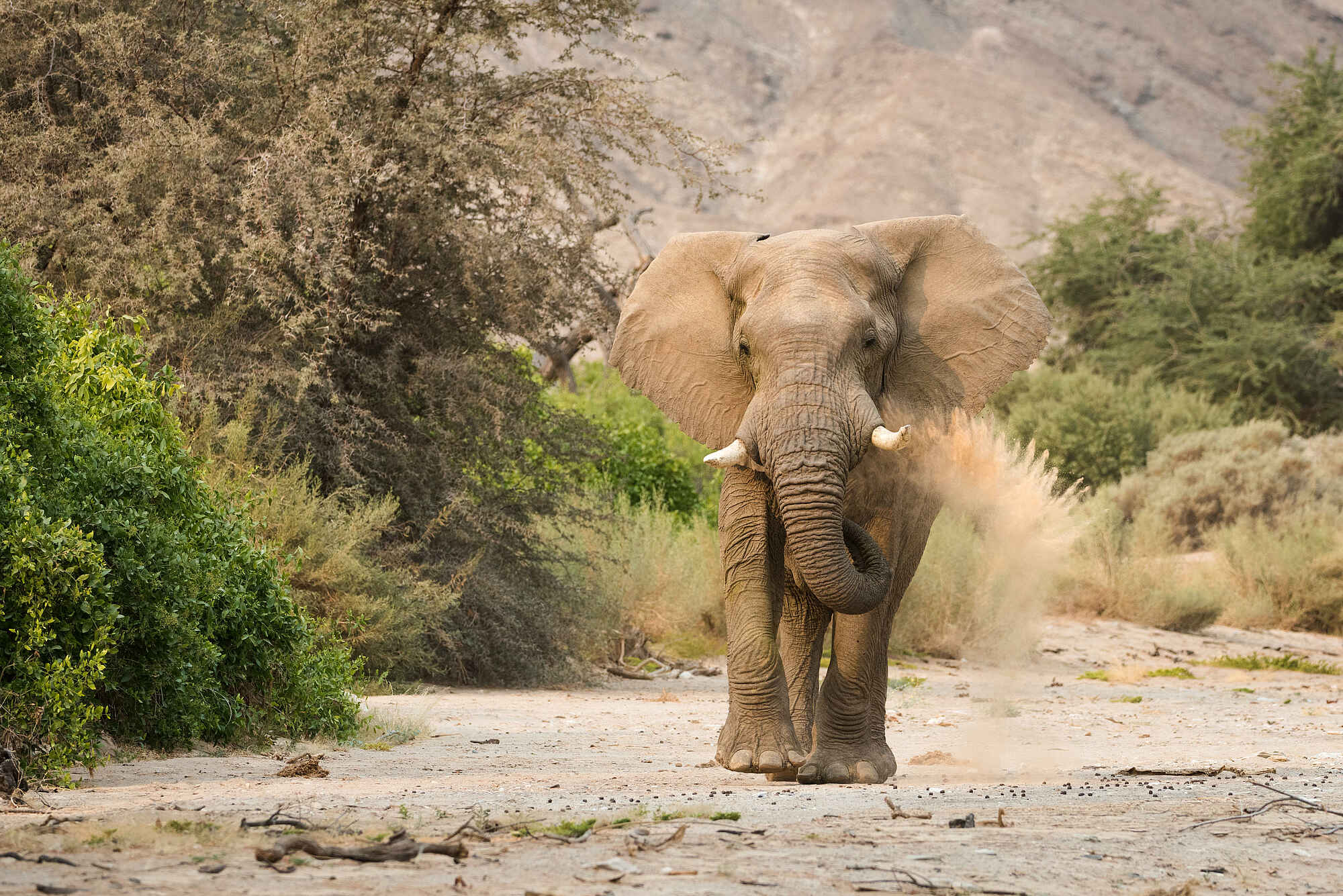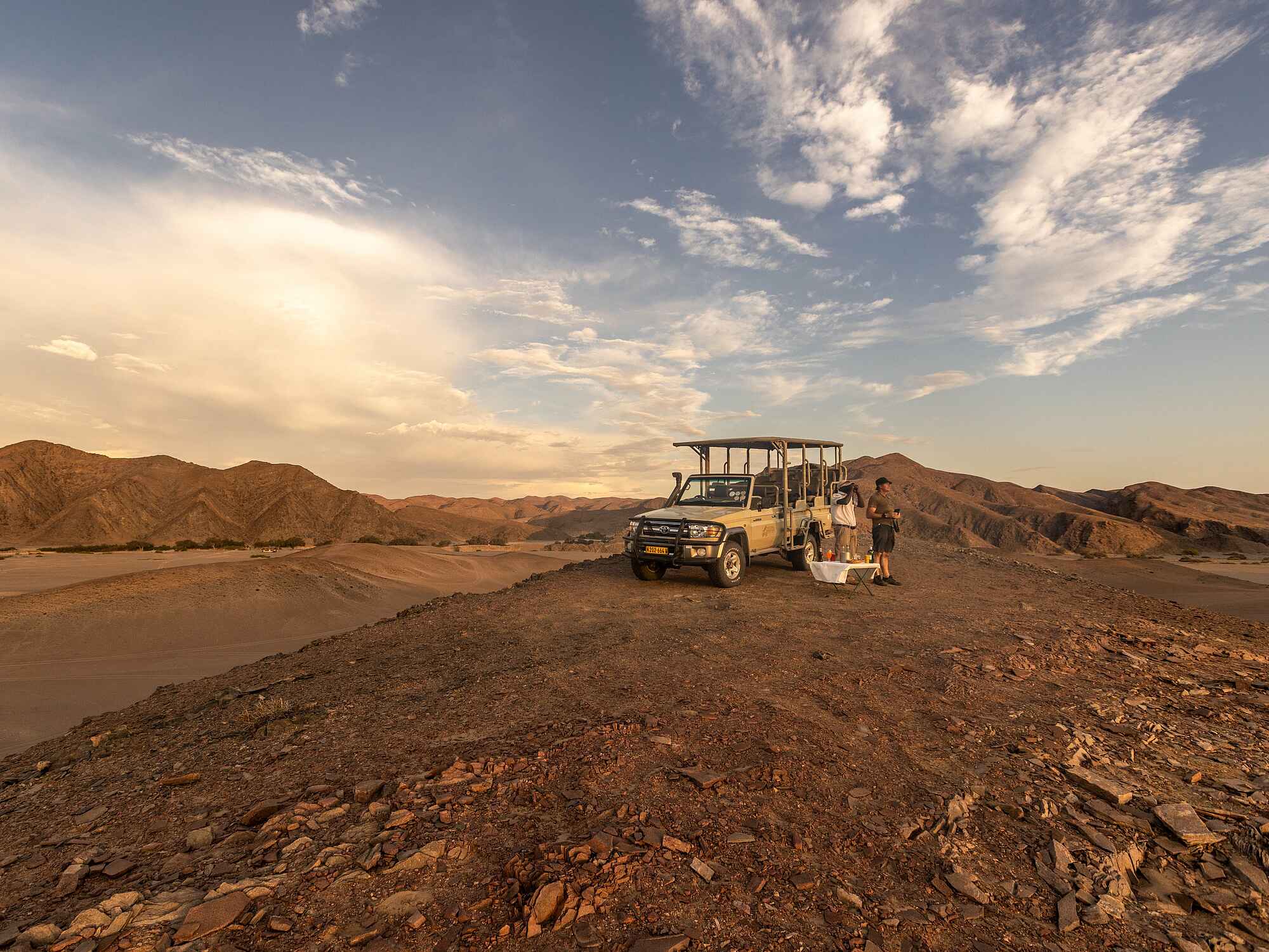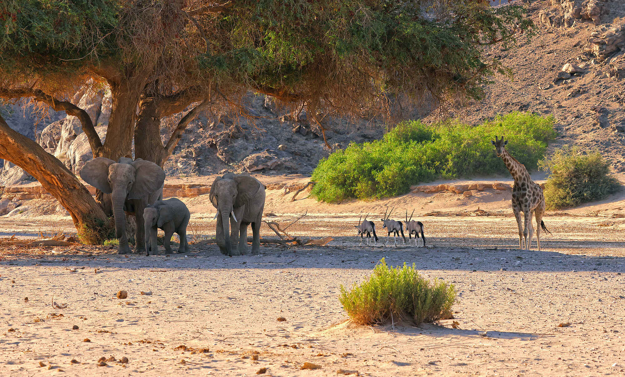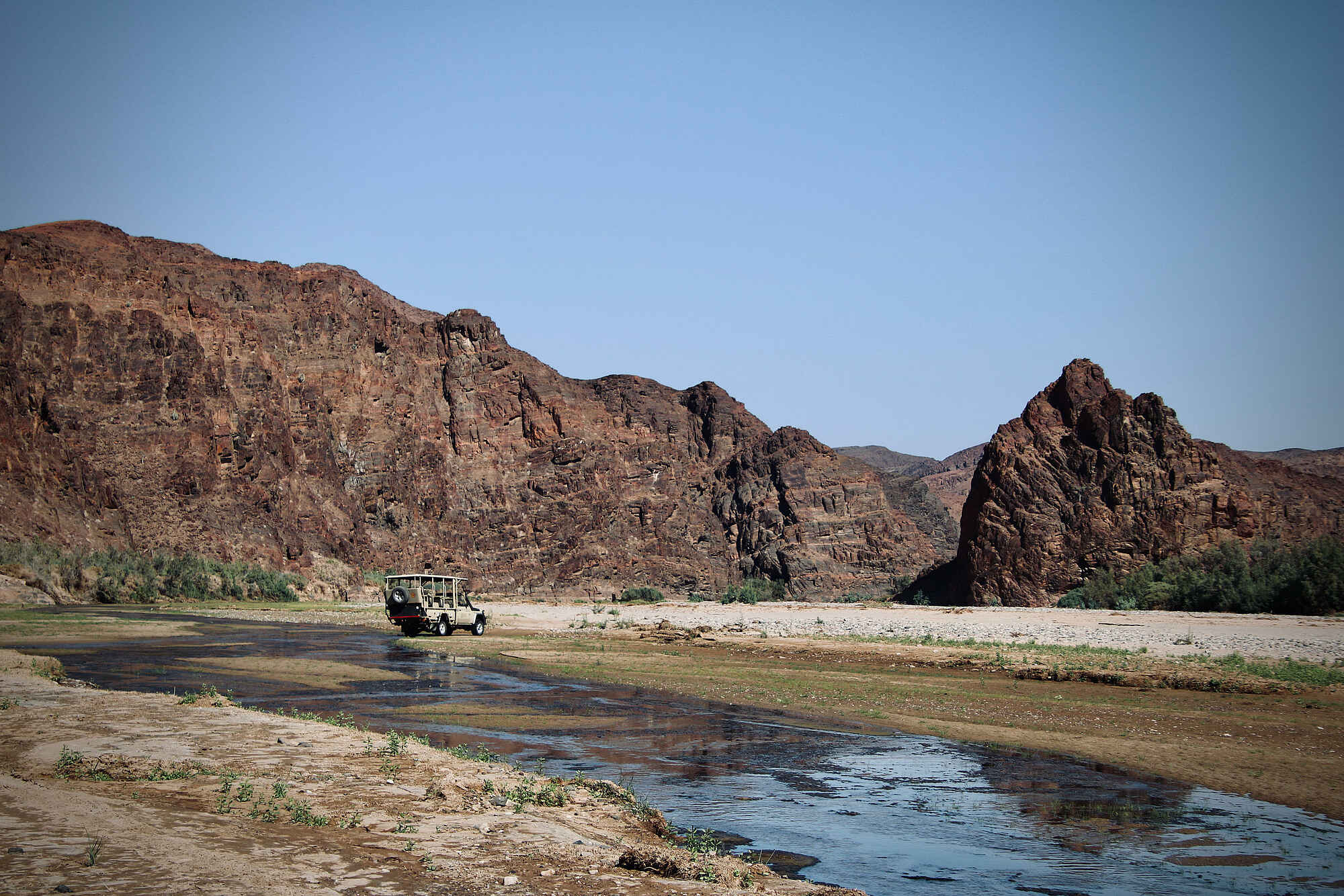 Das Hoanib Valley Camp bietet Pirschfahrten durch das Hoanib-Tal und seine Seitenarme. Die Routen führen durch trockene Flussbetten, über Ebenen und zwischen felsigen Hügeln hindurch. Wüstenelefanten gehören zu den wichtigsten Sichtungen, da sich die Tiere über Jahrzehnte an diese Umgebung angepasst haben und oft in kleinen Gruppen durch die Täler ziehen. Giraffen, Oryx, Springböcke, Schakale und Strauße gehören zu den regelmäßigen Beobachtungen. Mit etwas Glück lassen sich Wüstenlöwen oder Braunhyänen finden, deren Reviere sich über weite Distanzen erstrecken.