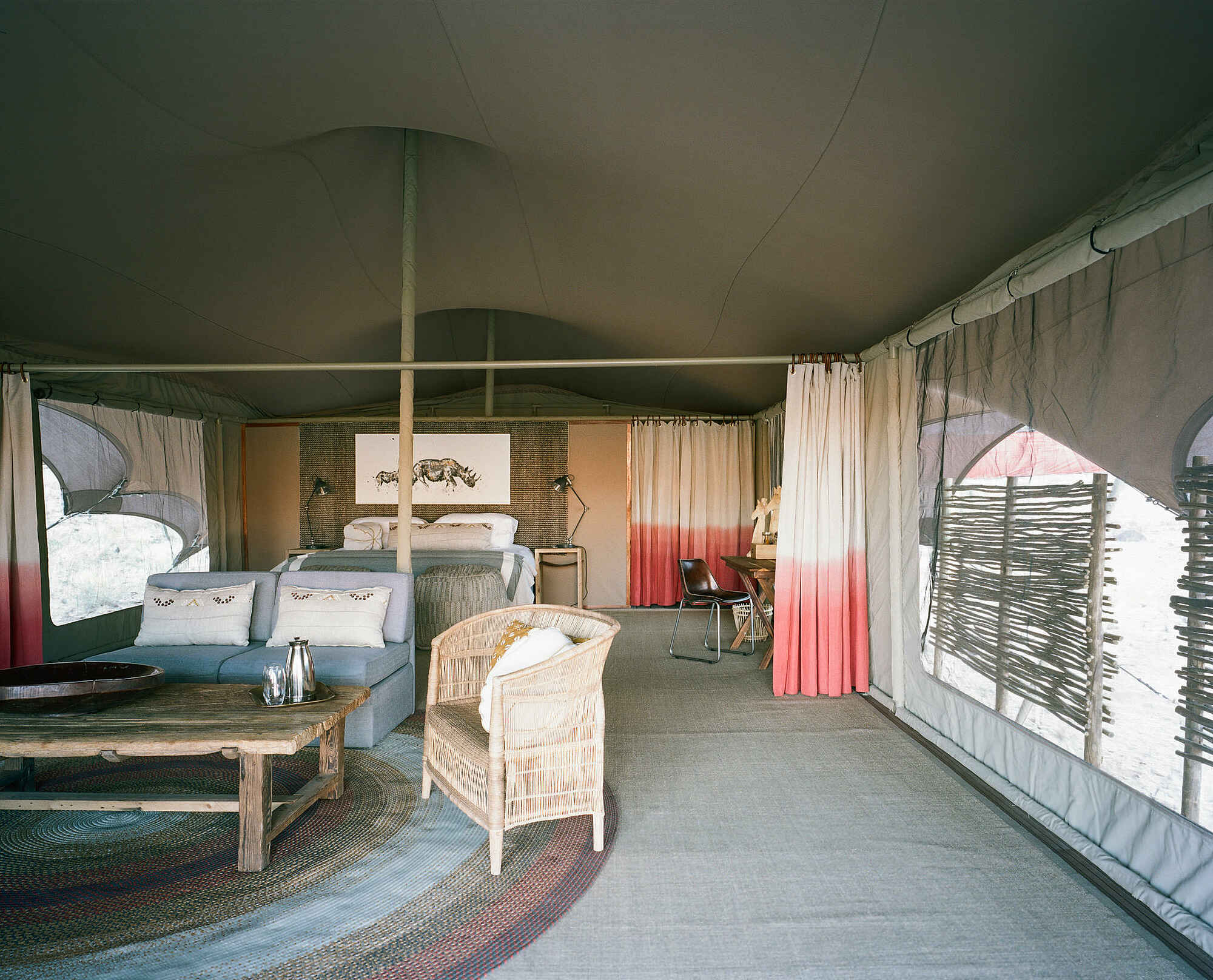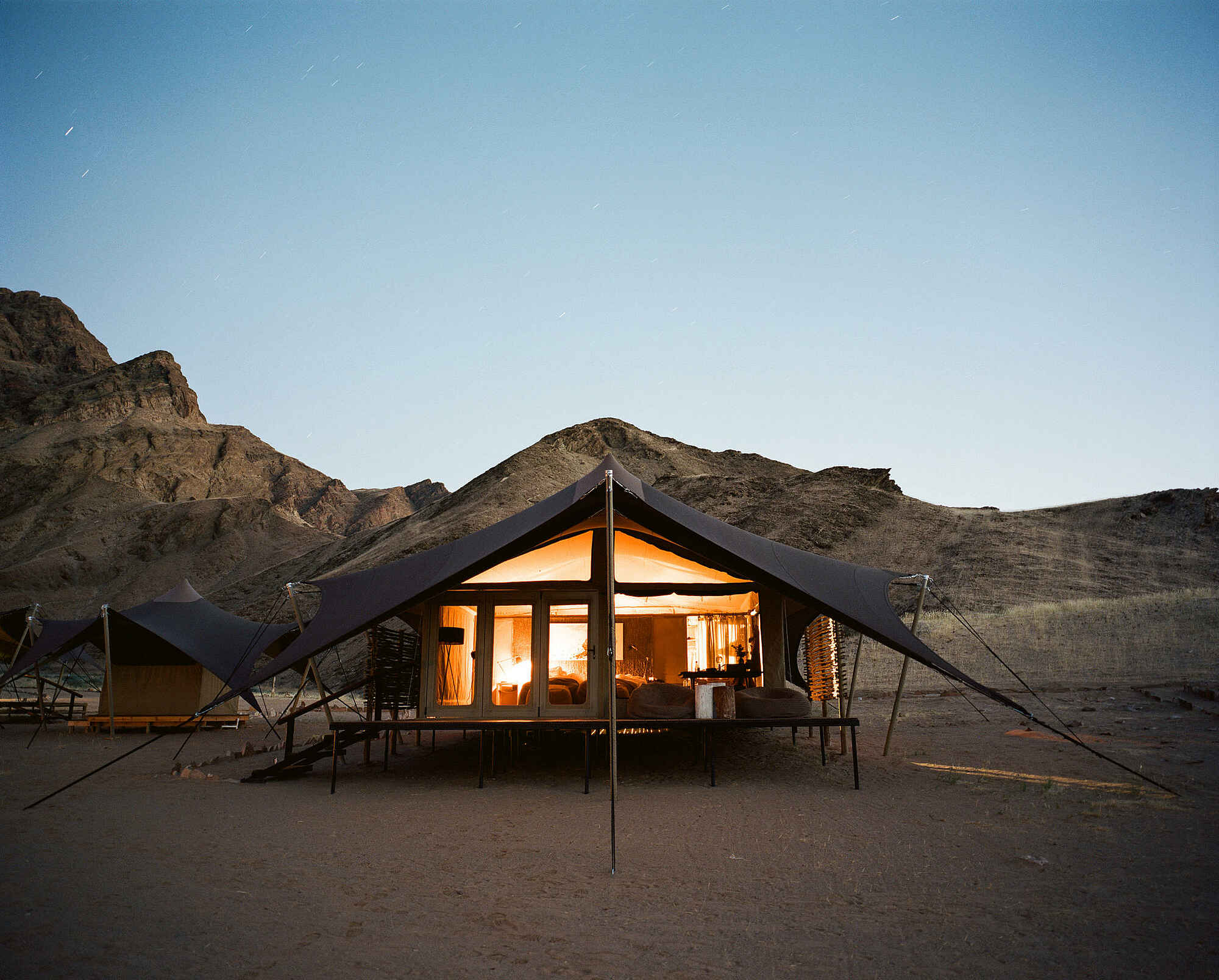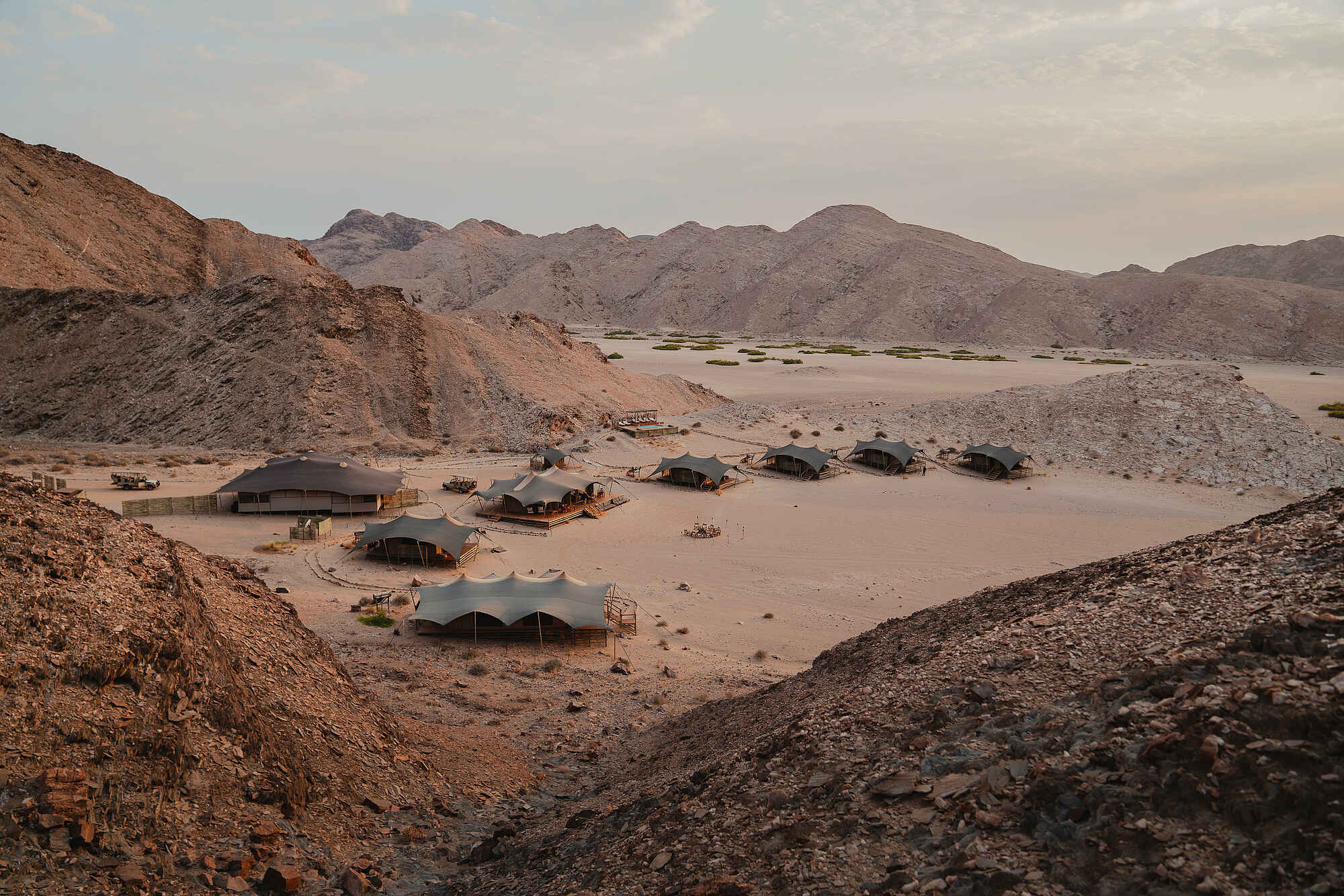 Das Camp verfügt über sechs Zeltsuiten, die auf Plattformen stehen und Ausblicke auf das Hoanib-Tal eröffnen. Die Räume sind offen gestaltet und verbinden Canvas, Holz und dezente Farben. Jede Suite bietet ein großes Bett mit Moskitonetz, einen Sitzbereich, Stauraum und eine Terrasse. Ein Schreibtisch, Steckdosen, Safe sowie Kaffee- und Teezubereitungsmöglichkeiten sorgen für Komfort. Die En-suite-Badezimmer verfügen über Dusche, Waschbecken, WC und hochwertige Pflegeprodukte. Handtücher und Haartrockner sind vorhanden. Eine Familieneinheit kombiniert zwei Zimmer mit gemeinsamem Zugang und bietet mehr Raum für Eltern und Kinder.