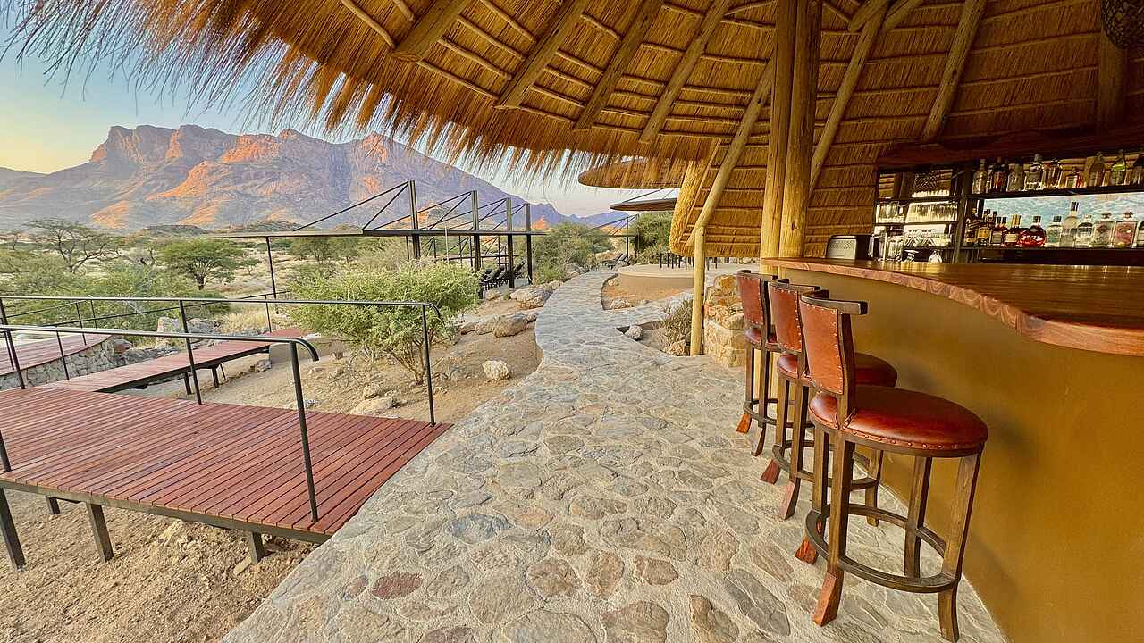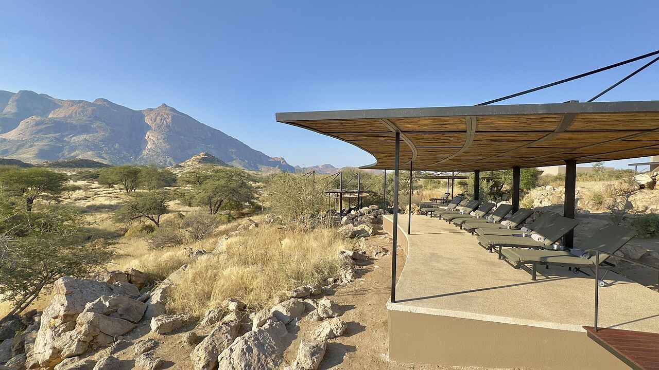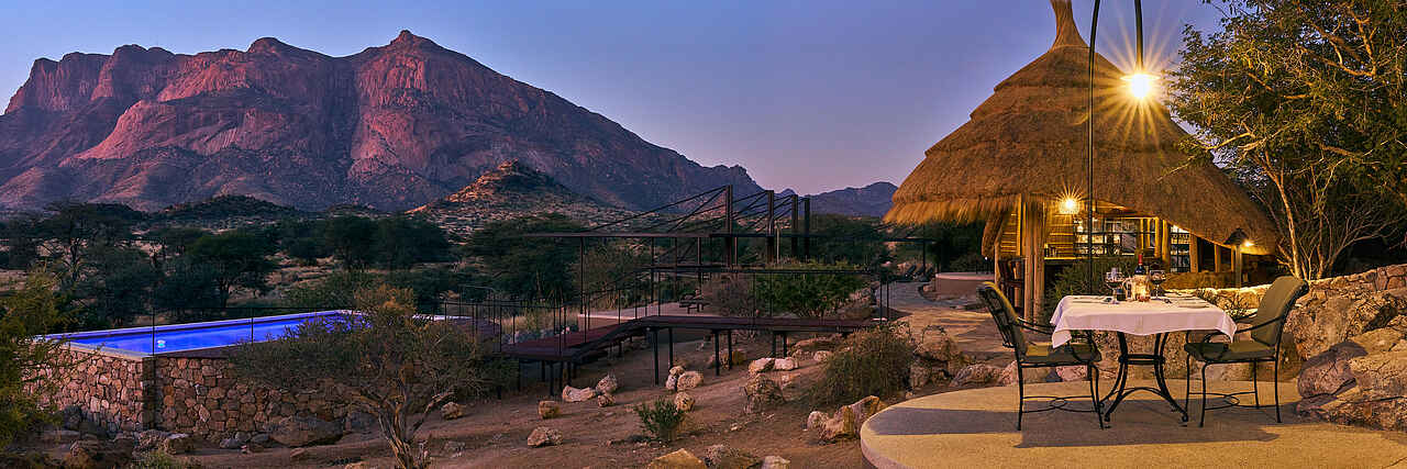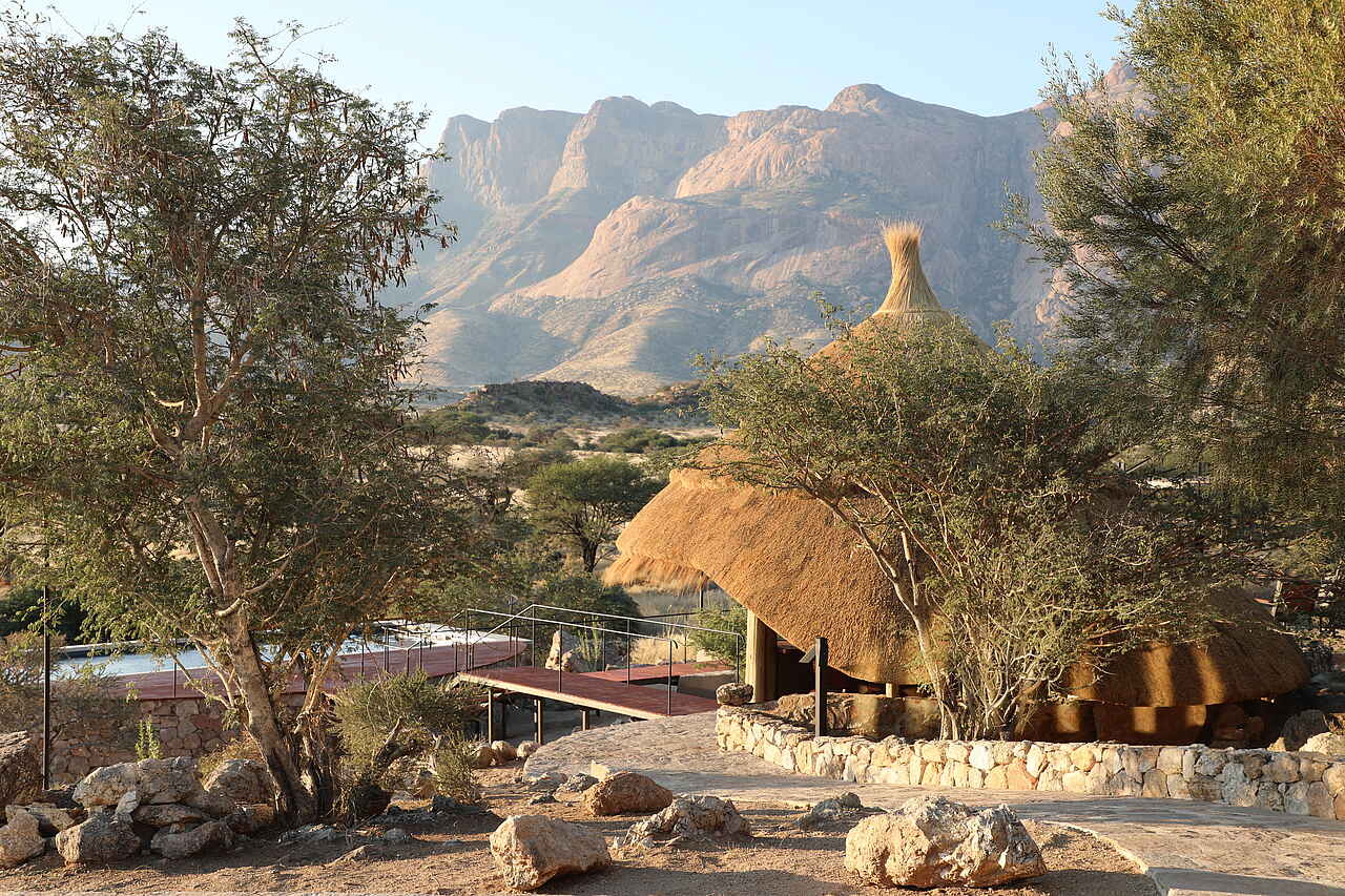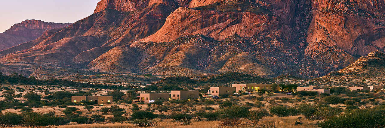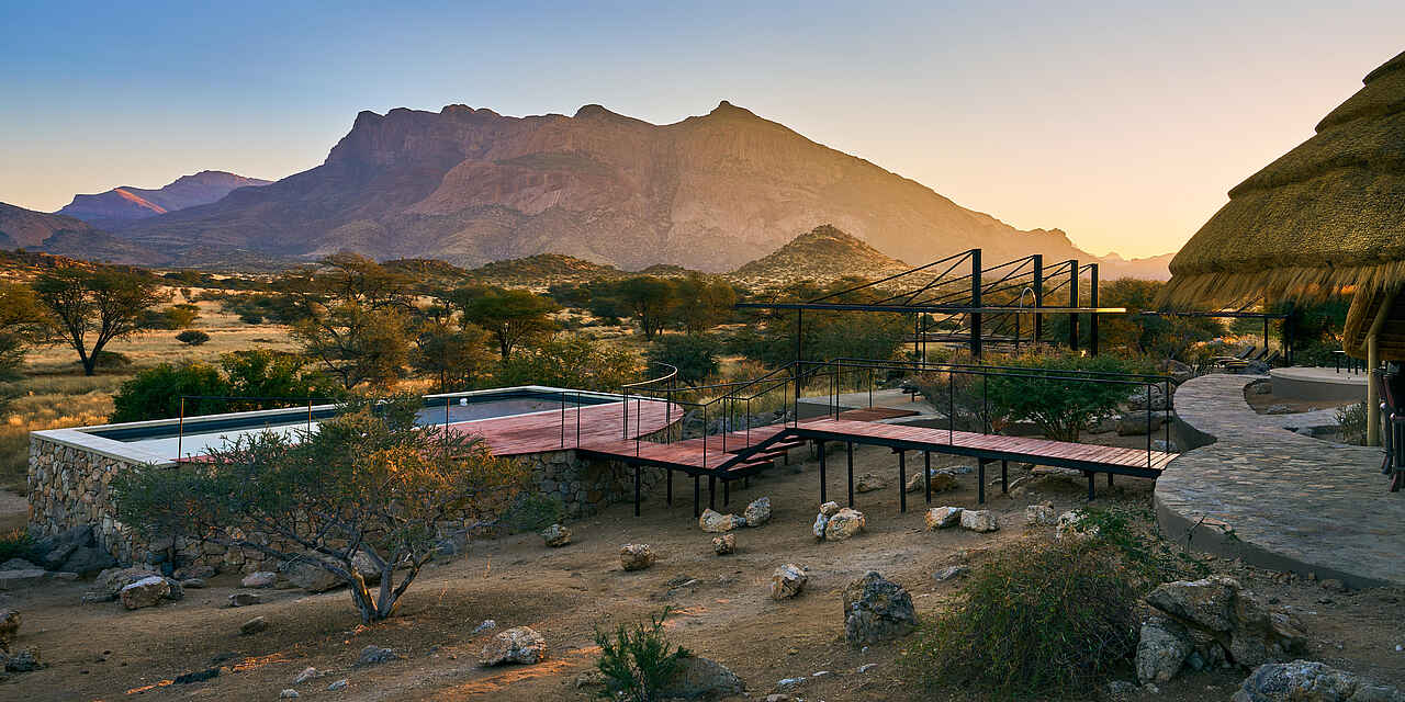 Die Hohenstein Lodge liegt im Westen Namibias, am Fuß des höchsten Gipfels des Erongo-Gebirges, dem 2.319 Meter hohen Hohenstein. Eingebettet in eine ursprüngliche Fels- und Savannenlandschaft eröffnet sich Gästen ein weiter Blick über die Ebenen bis zur Spitzkoppe. Die Lodge ist ein Rückzugsort für Reisende, die Namibia jenseits klassischer Routen erleben möchten. In der Umgebung lassen sich zahlreiche Vogelarten, Klippspringer, Kudus, Paviane und mit etwas Glück auch Leoparden beobachten. Besonders eindrucksvoll sind die Sonnenuntergänge, wenn das Gestein in warmes Licht getaucht wird. Die Lage eignet sich auch als Zwischenstopp zwischen dem Etosha-Nationalpark und Swakopmund oder in Kombination mit einem Aufenthalt in einem Safaricamp im Damaraland.