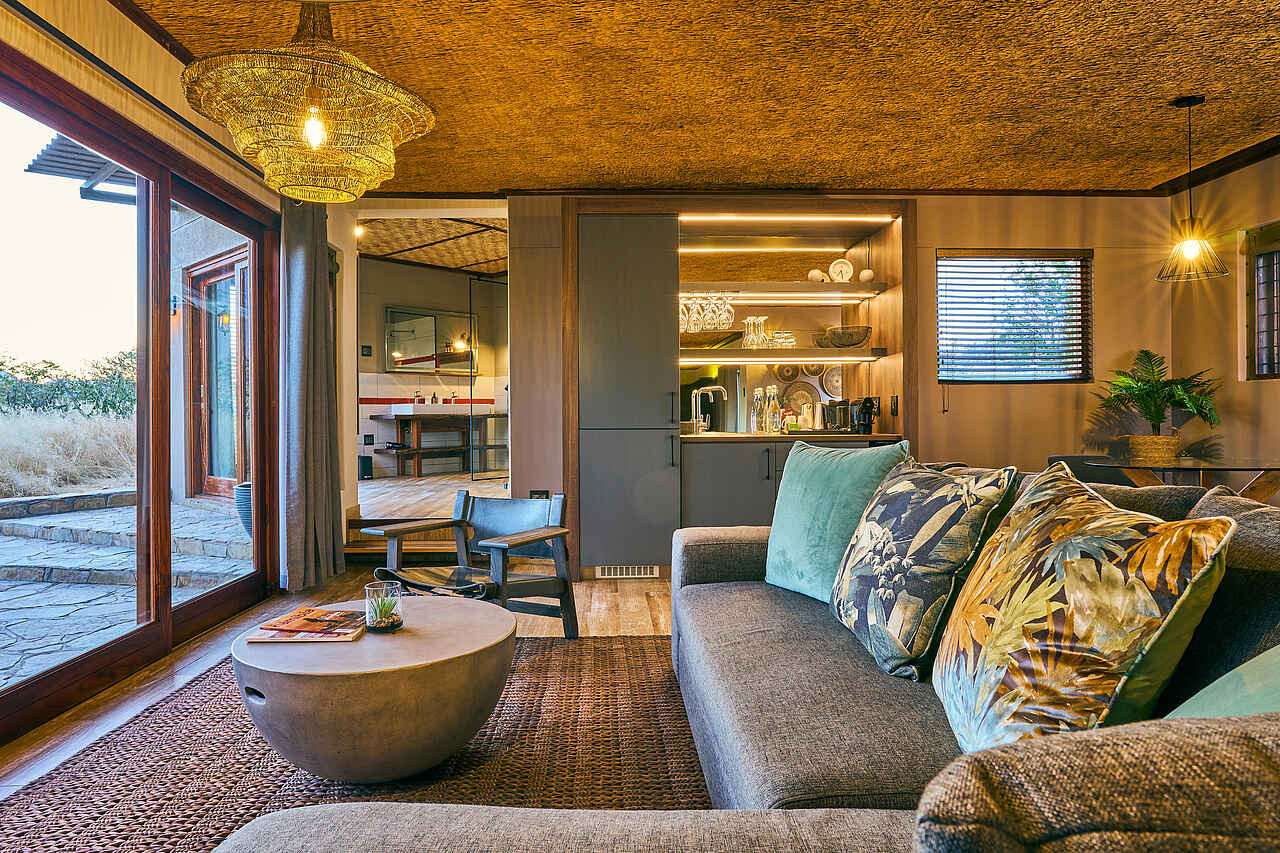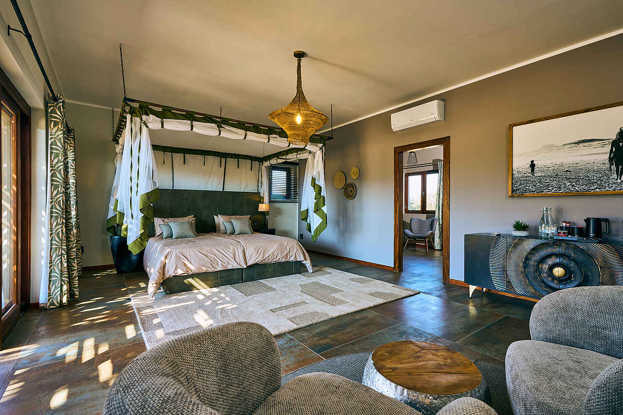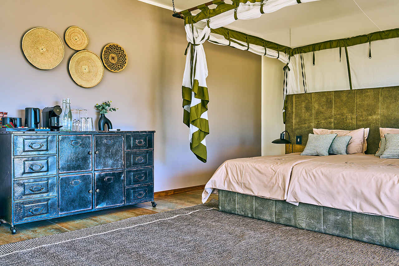 Die Gästezimmer der Hohenstein Lodge befinden sich in freistehenden Bungalows, die sich locker entlang des Hangs verteilen. Jedes Zimmer bietet eine private Veranda mit Blick in die Ebene. Die Ausstattung umfasst Doppel- oder Einzelbetten mit Moskitonetzen, Sitzgelegenheiten, Ventilator, Stauraum sowie Kaffee- und Teezubereitungsmöglichkeiten. Die En-suite-Badezimmer verfügen über großzügige Regenduschen, Waschbecken, WC, Handtücher und Pflegeprodukte. Für Familien eignen sich zwei miteinander verbundene Bungalows. Das separate Chalet bietet zusätzlichen Komfort mit zwei Schlafzimmern, einem Wohnzimmer, Klimaanlage und einem Kühlschrank.