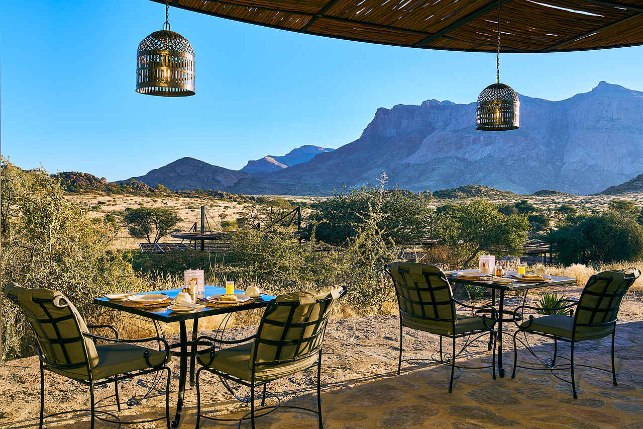 Die Mahlzeiten werden im offenen Restaurant mit Panoramablick oder bei gutem Wetter auf der Terrasse serviert. Morgens erwartet die Gäste ein reichhaltiges Frühstücksbuffet mit frischem Brot, Aufschnitt, Eierspeisen, Obst und Müsli. Mittags gibt es eine leichte Auswahl, abends ein mehrgängiges Menü mit namibischen und internationalen Gerichten. Auf individuelle Ernährungsbedürfnisse wird bei vorheriger Anmeldung gerne eingegangen. Trinkwasser, Tee und Kaffee sind inklusive, alkoholische und andere Getränke können separat bestellt werden.