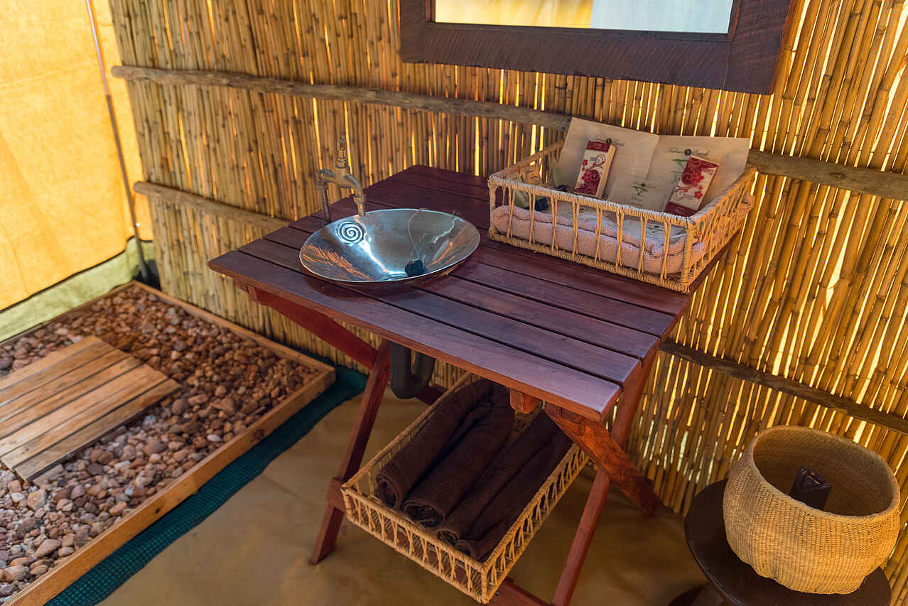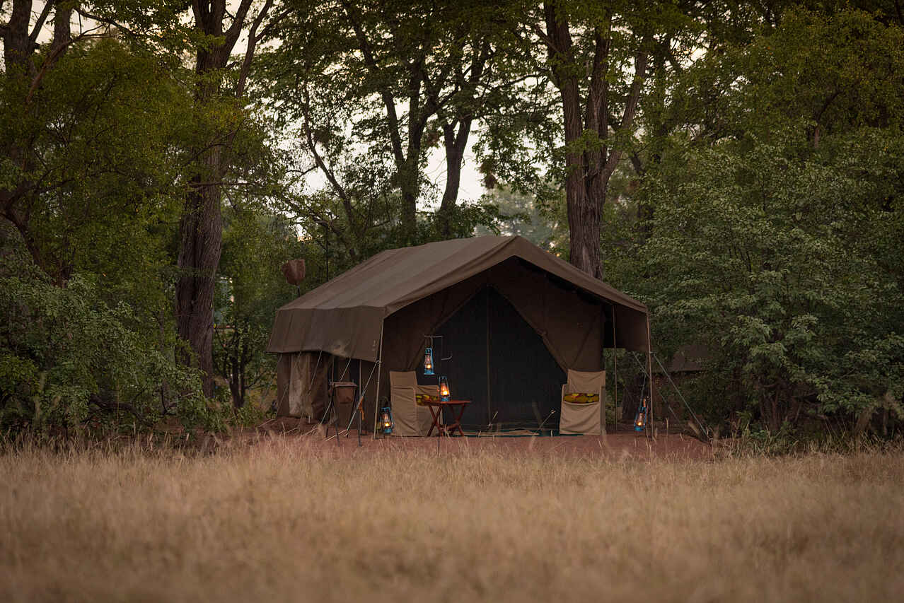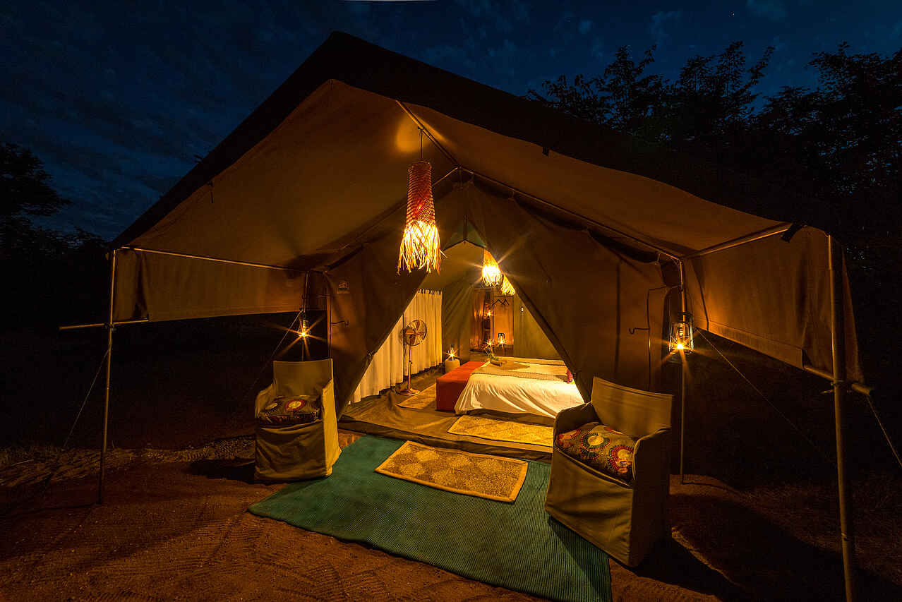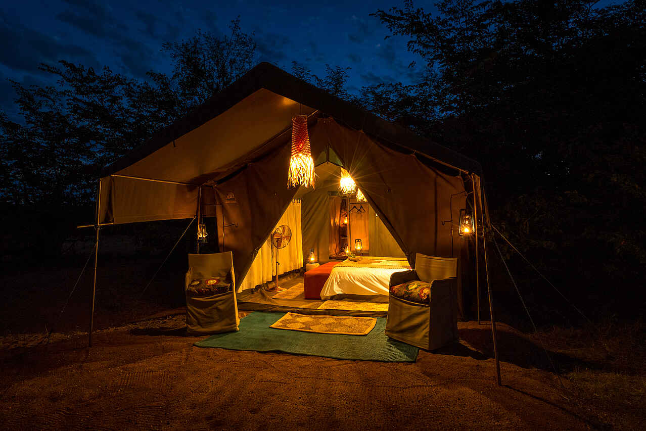 Sechs große, geräumige Meru-Zelte mit großen Gazefenstern. Es gibt Einzel- oder Kingsize-Betten, ein drittes Bett kann zu einem Zelt für Kinder hinzugefügt werden. Alle Zelte verfügen über eine en suite Bush-Toilette, eine Buschdusche auf der Rückseite mit heißem Wasser auf Anfrage und ein Handwaschbecken. Die Beleuchtung und der stehende Ventilator werden nachts mit Solarstrom betrieben. Es gibt KEINE Lademöglichkeiten in den Zelten. Wäscheservice und Zimmer-Service auf Anfrage