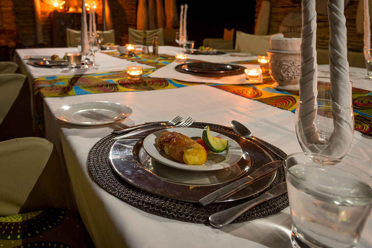 Eine gesunde Küche bietet eine gute Auswahl an Fleisch, Gemüse und Obst. Für Vegetarier und Lebensmittelallergiker ist gesorgt. Vormittags: Kontinentales Frühstück. Mittags: Essen im Camp. Nachmittags: süßer/pikanter High Tea. Abends: Drinks und 3-Gänge Menü. Lokale alkoholische und nicht-alkoholische Getränke sind inbegriffen. Import- und Premium-Spirituosen sind gegen Aufpreis erhältlich. Auf den Aktivitäten gibt es Tee, Snacks und Sundowner. Die Mahlzeiten werden gemeinschaftlich im Essbereich oder unter dem Sternenhimmel eingenommen.
