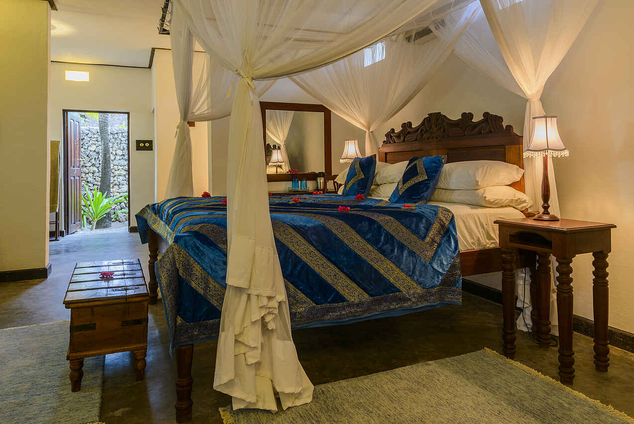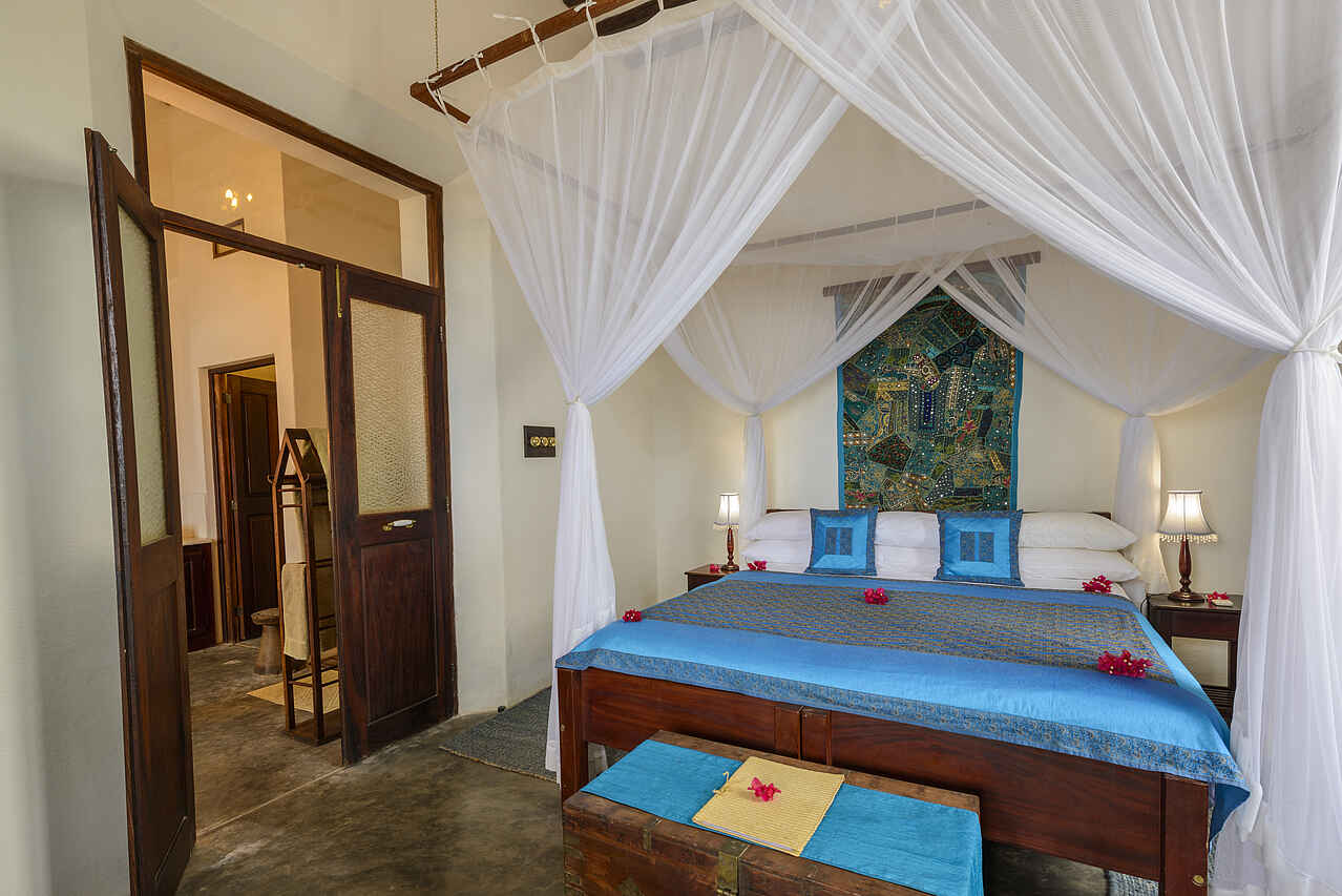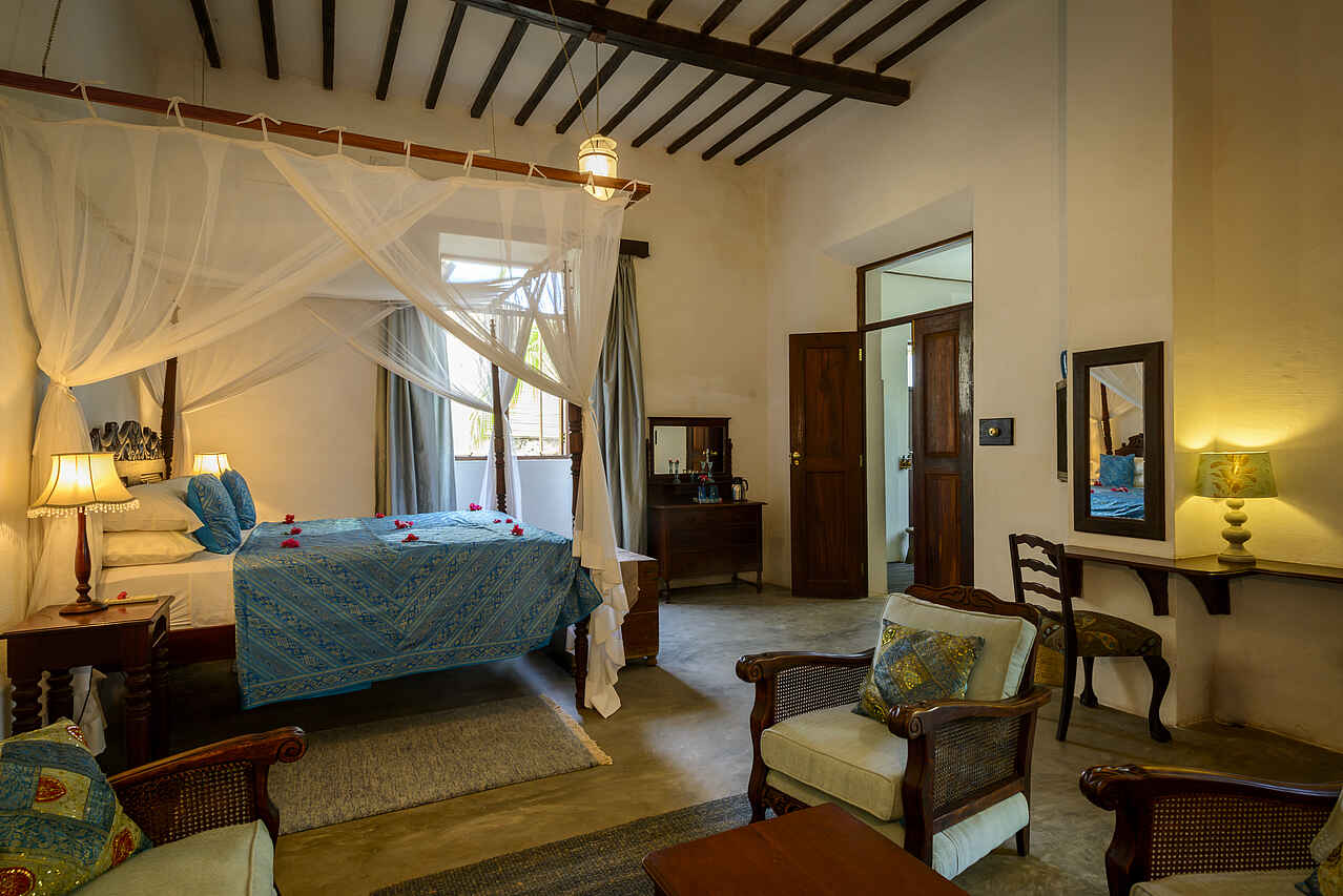Insgesamt gibt es 14 Zimmer von denen 5 über direkten Meerblick verfügen, 6 haben einen eigenen Zugang zu den Gärten und 3 sind sog. historische Zimmer mit Augenmerk auf die alte Architektur. Die individuell gestalteten Zimmer bieten Korallenmauern, edles Holz wie Teak und Mahagoni, opulente Details wie ein Safe im Piratenstil oder Kissen aus Seide. Neben dem Schlafraum mit großem King-Size oder Twin-Bett gibt es Lounges, eigene Veranden mit Echtholz-Möbeln, en-suite Badezimmer mit Waschbecken, Dusche, Badewanne, Spültoilette und fließend Kalt- und Warmwasser sowie Klimaanlage, Ventilator, Moskitonetz und ein morgendlicher Tee- und Kaffeeservice. Die Paradiso-Villa umfasst 5 Schlafzimmer mit 5 en-suite Badezimmern, einem eigenen Pool, Garten, großer Lounge, Chef, Butler und eigener Dhau mit vollständiger Crew. Wäscheservice inklusive.