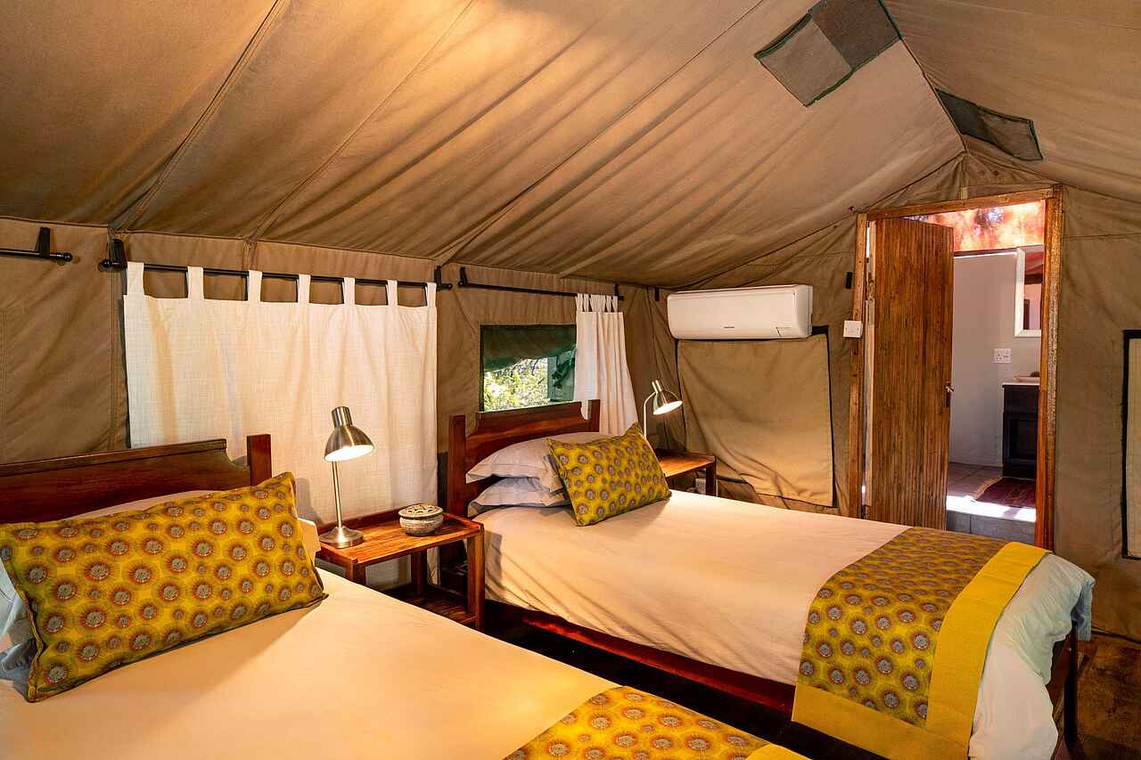 Die acht Meru-Zelte der Ichingo Chobe River Lodge stehen auf erhöhten Holzplattformen und bieten einen komfortablen Rückzugsort mit Blick auf den Fluss. Ausgestattet mit gemütlichen Kingsize-Betten oder zwei Einzelbetten, jeweils von Moskitonetzen umgeben, schaffen sie eine ruhige und geschützte Atmosphäre. Zur weiteren Ausstattung gehören Nachttische, Ventilatoren, eine kleine Sitzecke sowie eine Klimaanlage für warme Tage.