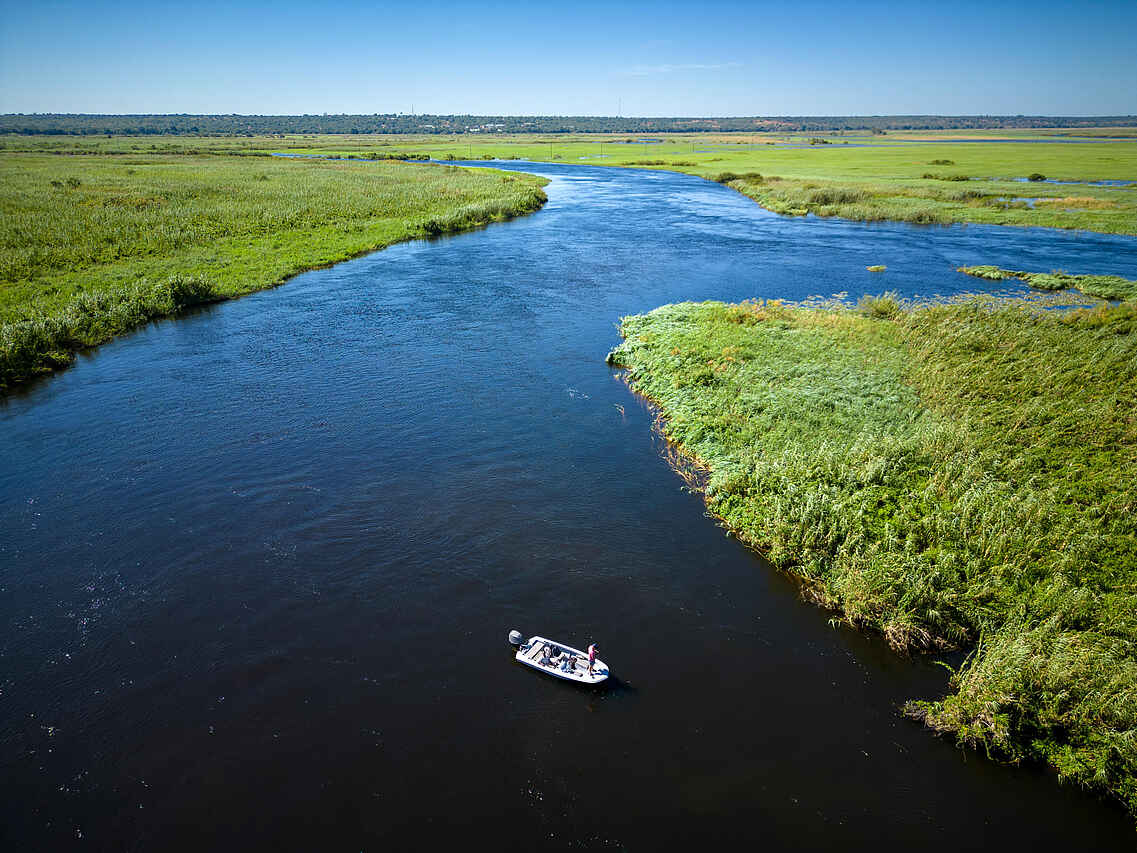 Die Ichingo Chobe River Lodge befindet sich auf der namibischen Seite des Chobe River, auf der Insel Impalila im äußersten Nordosten Namibias. Hier erleben Gäste das Safariabenteuer nicht im Geländewagen, sondern vom Boot aus - inmitten einer Landschaft, die für ihre großen Elefantenherden, Flusspferde, Krokodile und eine beeindruckende Vogelvielfalt bekannt ist. Als spezialisiertes Wasser- und Angelcamp legt die Lodge den Fokus auf Flusssafaris und das Fangen von Tigerfischen, einem der bekanntesten Raubfische Afrikas. Die abgeschiedene Lage auf Impalila Island - weit entfernt vom Trubel der größeren Lodges auf der botswanischen Seite - schafft beste Voraussetzungen für ein naturnahes, ruhiges und sehr persönliches Safari-Erlebnis.