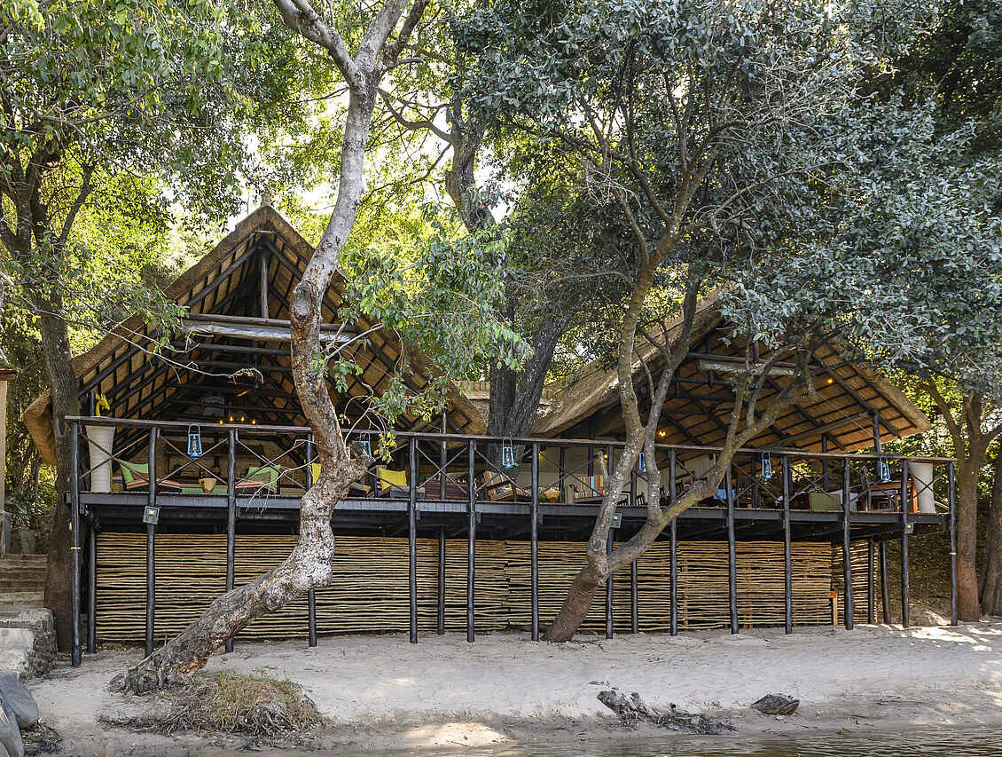 Die zentralen Einrichtungen der Ichingo Chobe River Lodge verteilen sich inmitten gepflegter Gärten direkt am Ufer des Chobe River. Das strohgedeckte Hauptgebäude beherbergt eine offene Lounge mit Bar sowie einen überdachten Speisebereich mit schönem Blick auf den Fluss. Ein kleiner Swimmingpool sorgt an warmen Tagen für angenehme Erfrischung. Die Atmosphäre ist entspannt und rustikal-elegant - mit Holzmöbeln, leichten Stoffen in Naturtönen und liebevollen Details. Auf dem Holzdeck vor der Lodge lassen sich ruhige Stunden und stimmungsvolle Sonnenuntergänge genießen. WLAN ist im Hauptbereich kostenfrei verfügbar. Ein besonderes Merkmal ist der eigene Bootsanleger, der als Ausgangspunkt für alle Wasseraktivitäten dient.