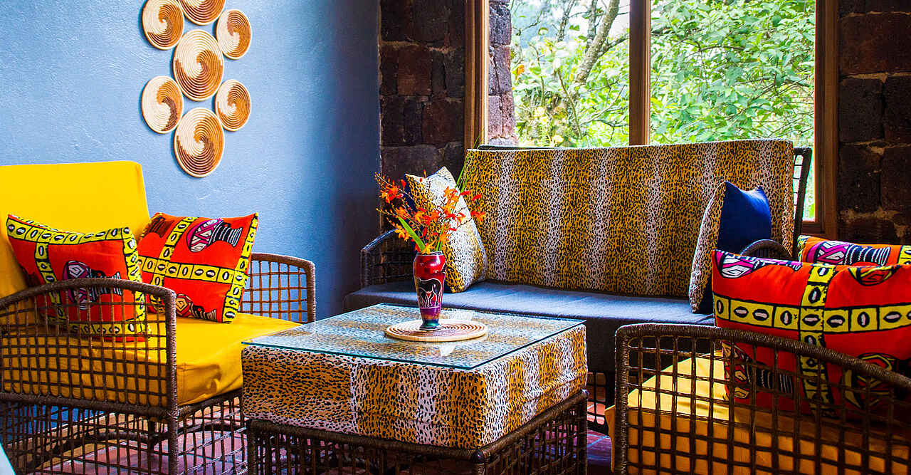 Es gibt sowohl Doppel- als auch Einzelbetten, immer mit Moskitonetzen. Wandspiegel sind vorhanden. Von den Veranden der Zimmer schaut man auf die landwirtschaftlich genutzte, steilhügelige Landschaft, in einigen der Zimmer auch auf den Bwindi-Waldrand. Auf den TVernden stehen Klappstühle mit Sitzkissen. Das Mobiliar ist sehr rustikal. Zu den Zimmern gelangt man über gepflasterte, steile Wege, teilweise von Treppenstufen unterbrochen. Die Cottages stehen in den steileren Lagen auf Stelzen.