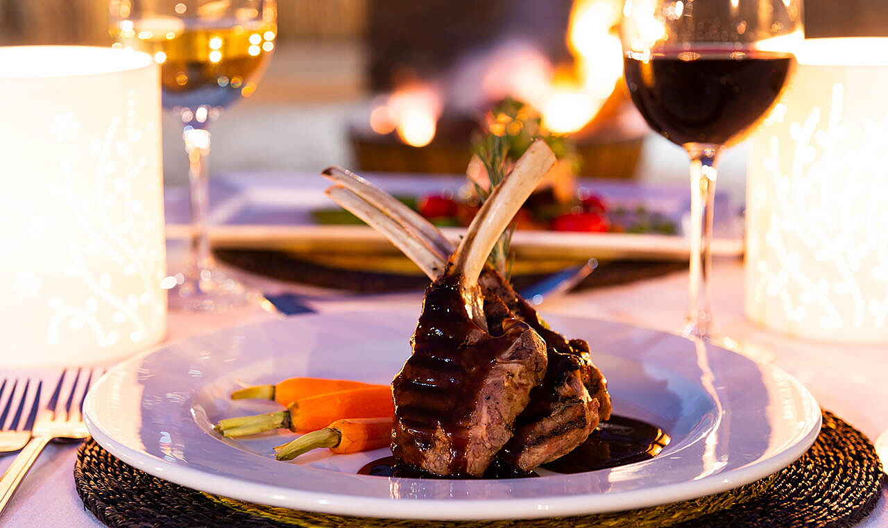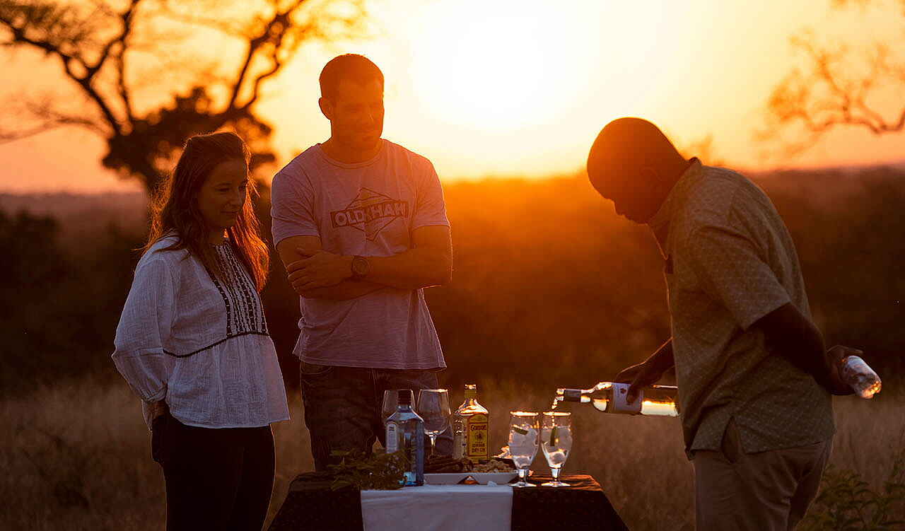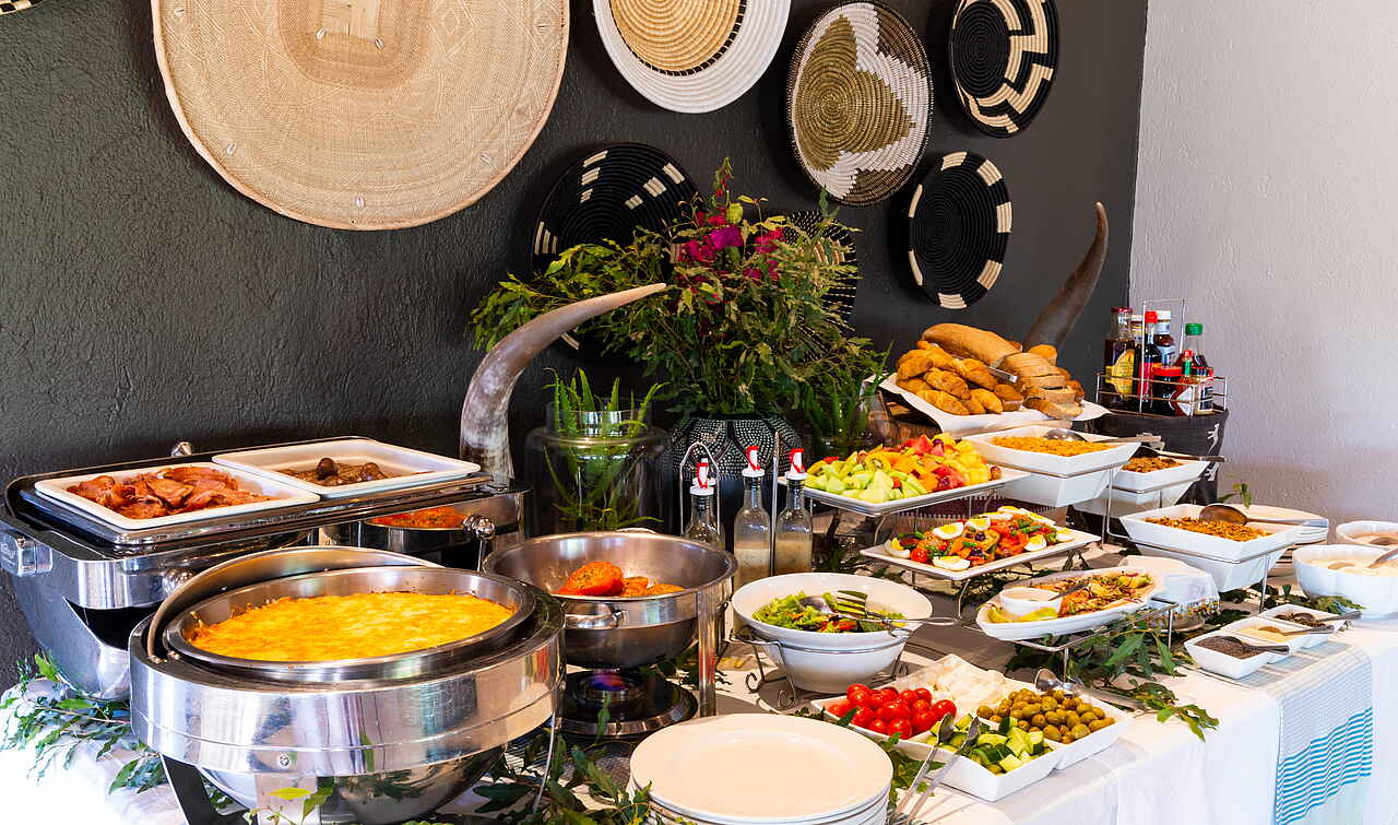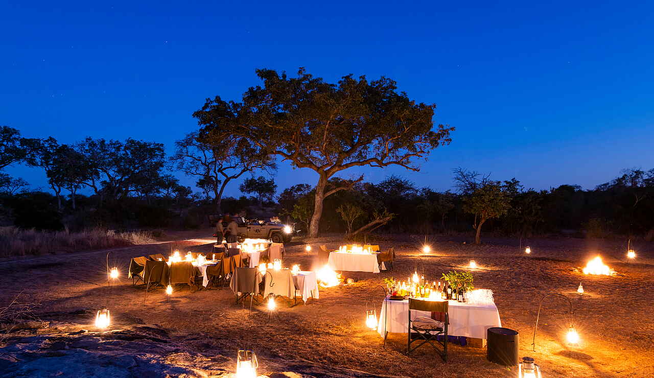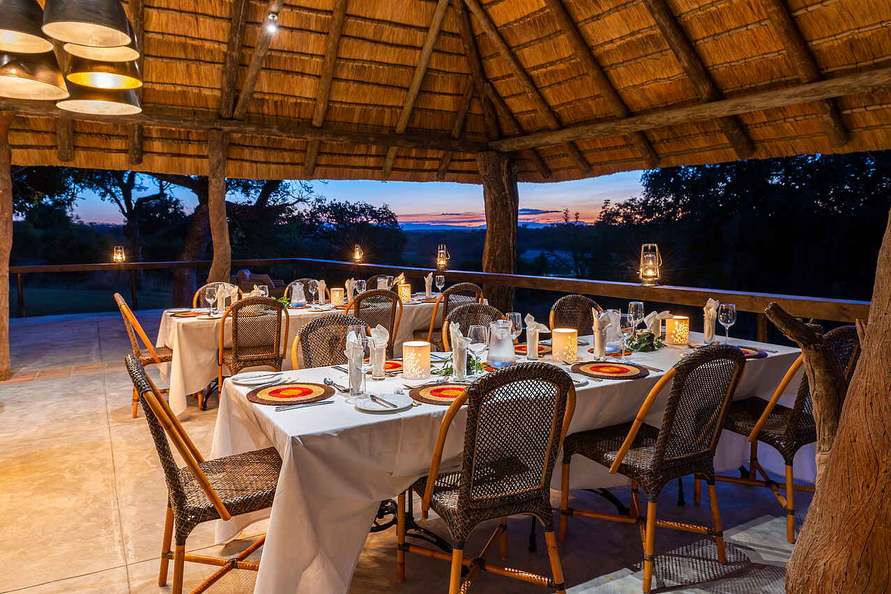 Kurzer Morgensnack, herzhaftes Brunch nach der Pirschfahrt, Lunch, Dinner auch im Busch oder als Boma; Communal Dining; Zudem High Tea und Sundowners; südafrikanische und europäische Küche, alle Diäten werden berücksichtigt, bitte anmelden.