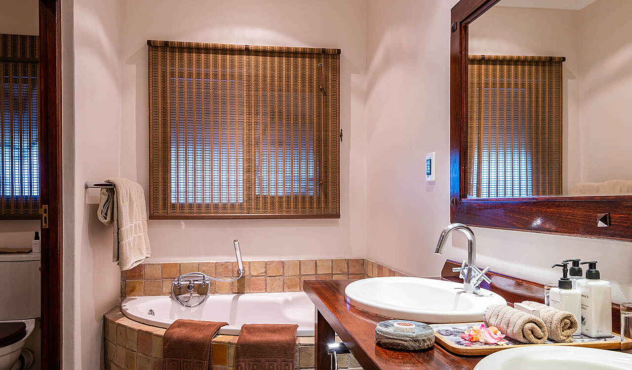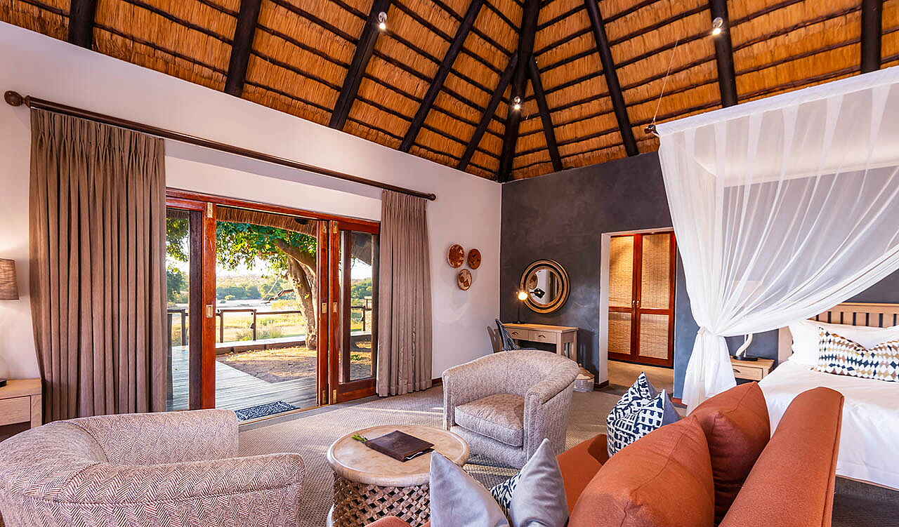 8 großzügige Chalets mit hohem Dachstuhl, strohgedeckt, mit Doppelbetten unter Moskitonetzen und Deckenventilatoren, zudem 3 Chalets für Familien mit zusätzlich 2 Einzelbetten; alle Chalets klimatisiert mit en-suite Bädern, mit zwei Waschbecken, Badewanne, Dusche und WC; Toilettenartikel, Handtücher, Fön, Moskitospray vorhanden. Jedes Chalet mit Telefon, Mini-Bar, Mini-Safe, kleiner Veranda.