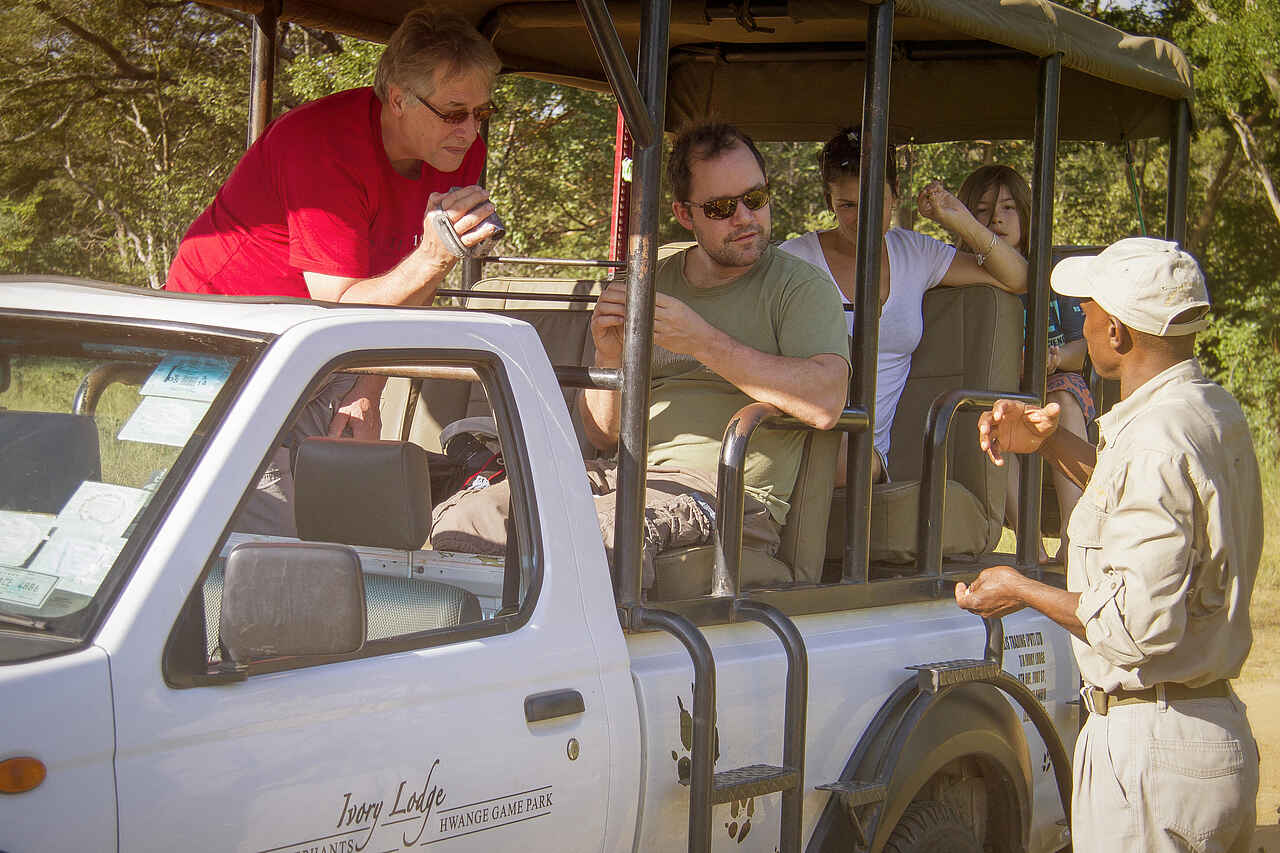 Das Safariangebot der Ivory Lodge ist abwechslungsreich und flexibel. Täglich werden geführte Pirschfahrten am frühen Morgen und am späten Nachmittag angeboten. Diese führen sowohl in das private Konzessionsgebiet als auch in den benachbarten Hwange Nationalpark, der für seine hohe Tierdichte bekannt ist. Besonders intensiv erleben Gäste die Natur bei geführten Buschwanderungen, bei denen die Fährtenlesekunst und kleinere Details im Mittelpunkt stehen. Wer lieber beobachten als suchen möchte, nimmt Platz im versteckten Beobachtungs-Deck am Wasserloch und lässt die Tiere zu sich kommen. Für Vogelliebhaber gibt es reichlich Gelegenheiten zur Beobachtung, denn über 300 Arten leben in der Umgebung. Außerdem organisiert die Lodge auf Wunsch kulturelle Ausflüge in benachbarte Dörfer oder Besuche von Naturschutzprojekten wie dem Painted Dog Conservation Center.