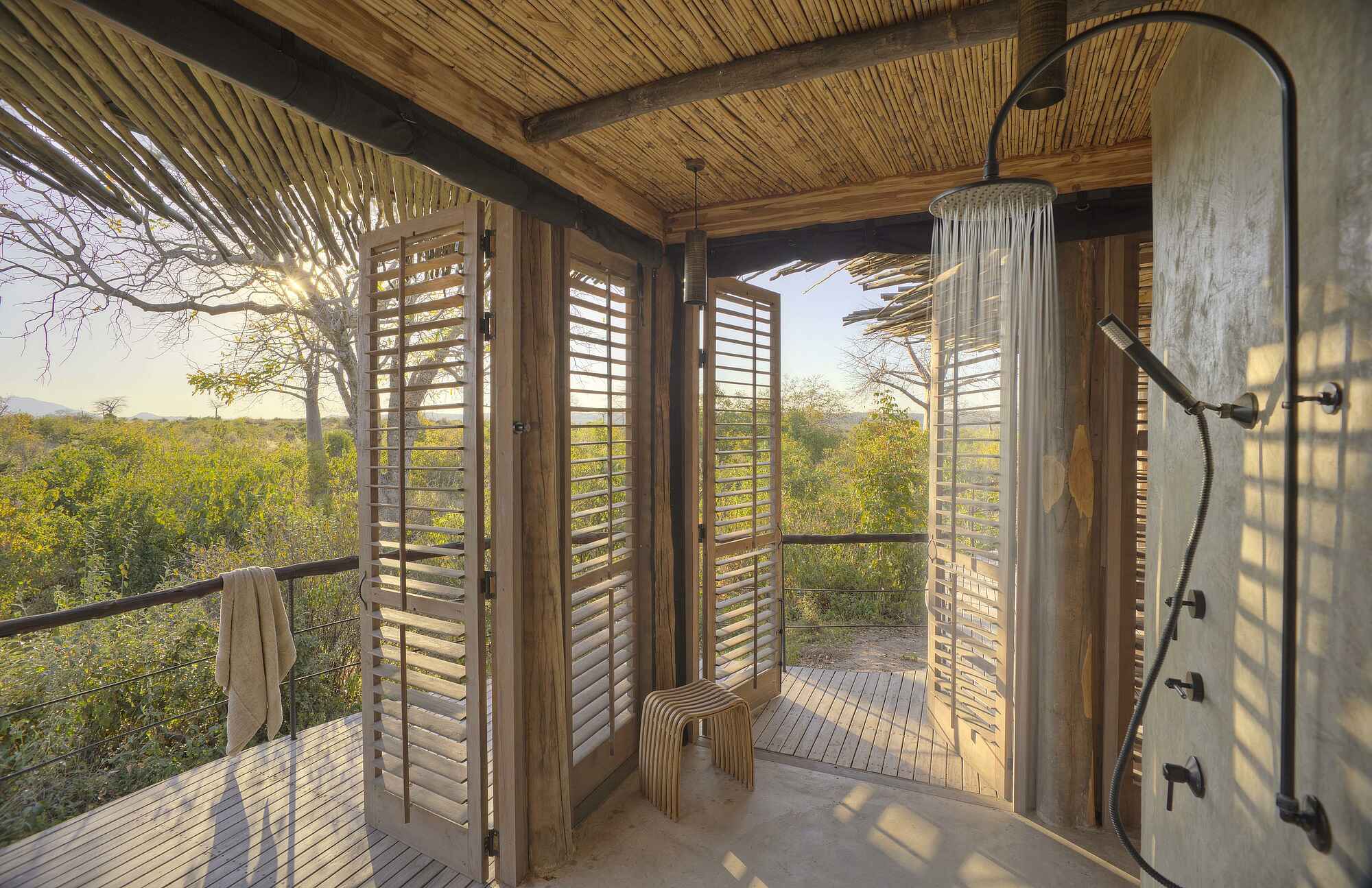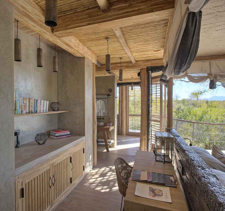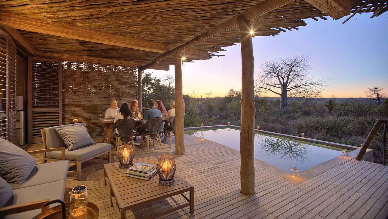 Der zentrale Wohnraum des Jabali Private House umfasst bequeme Sofas, Sessel, einen großen Esstisch und weit öffnende Fensterfronten, die viel Licht einlassen und den Blick auf die baumreichen Ebenen lenken. Eine offene Küche ermöglicht persönliche Menüabstimmungen mit dem Koch. Im Außenbereich befindet sich eine weitläufige Terrasse mit Loungeflächen sowie ein privater Swimmingpool, der direkt zwischen den Granitfelsen eingebettet ist. Eine schattige Sitzecke und Ruhezonen bieten Platz für Erholung zwischen den Aktivitäten. Gäste der Villa können zusätzlich die Einrichtungen des benachbarten Jabali Ridge Camp nutzen, darunter Spa, Boutique, Pool und weitere Loungebereiche. Die Gestaltung bleibt hochwertig, klar strukturiert und gezielt auf Privatsphäre und Komfort ausgelegt.