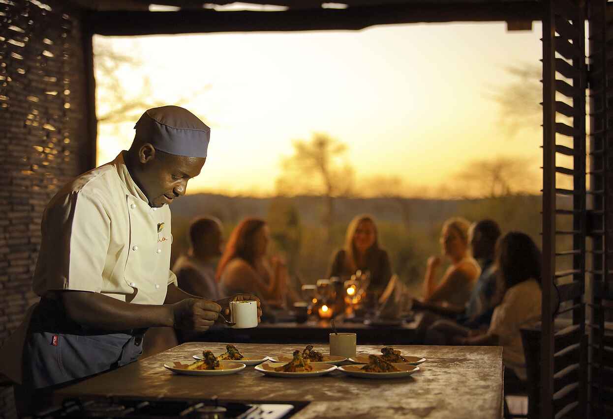 Alle Mahlzeiten werden exklusiv vom privaten Koch des Hauses zubereitet. Die Küche orientiert sich an frischen Zutaten und internationalen Gerichten, ergänzt durch leichte afrikanische Einflüsse. Gäste entscheiden selbst, ob sie im Innenbereich, auf der Terrasse oder am Pool speisen möchten. Alle Mahlzeiten und Getränke wie Wasser, Softdrinks, Kaffee, Tee, ausgewählte Weine und Spirituosen sind inklusive. Auf besondere Ernährungswünsche wird gerne eingegangen, eine Voranmeldung wird empfohlen.
