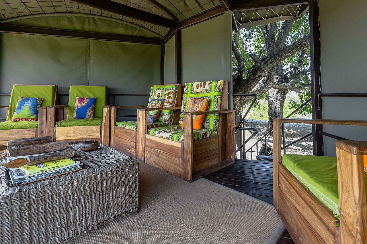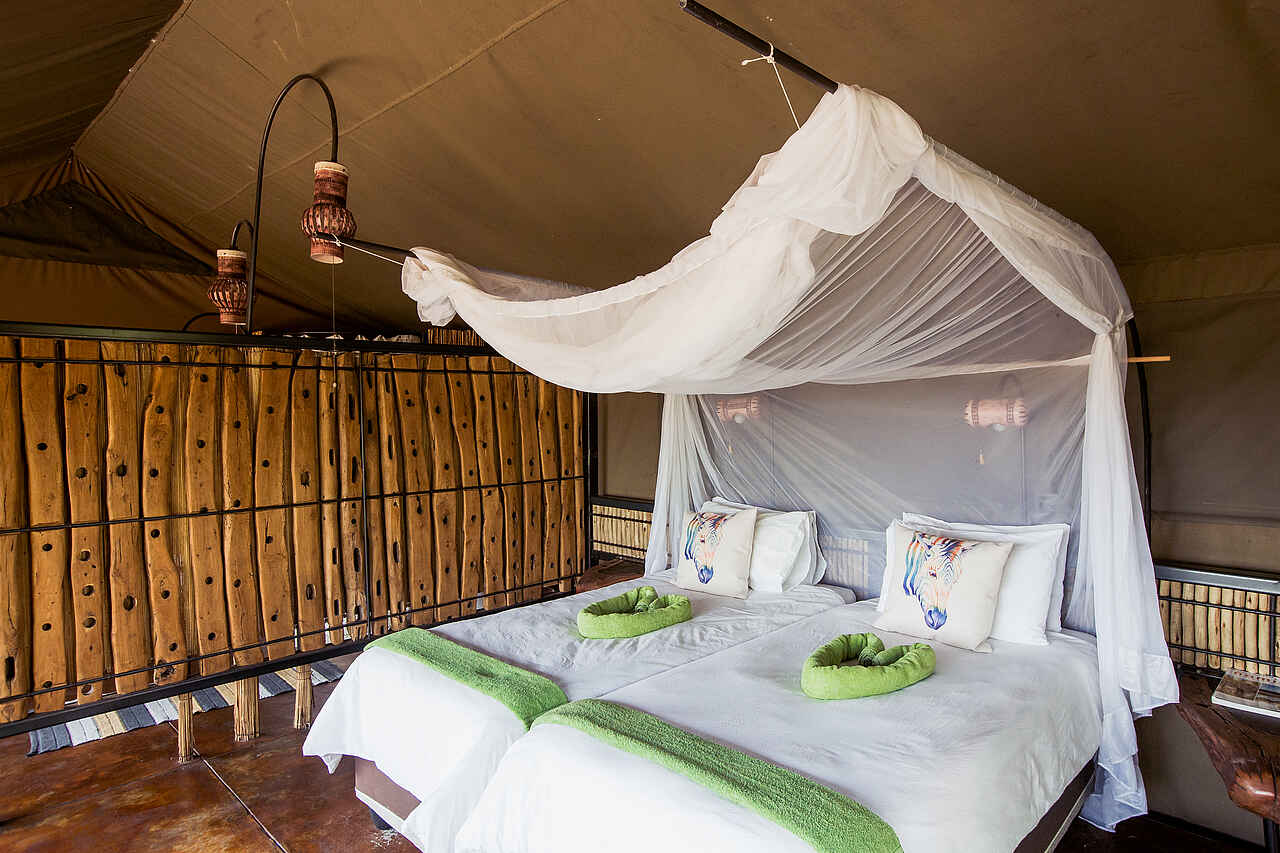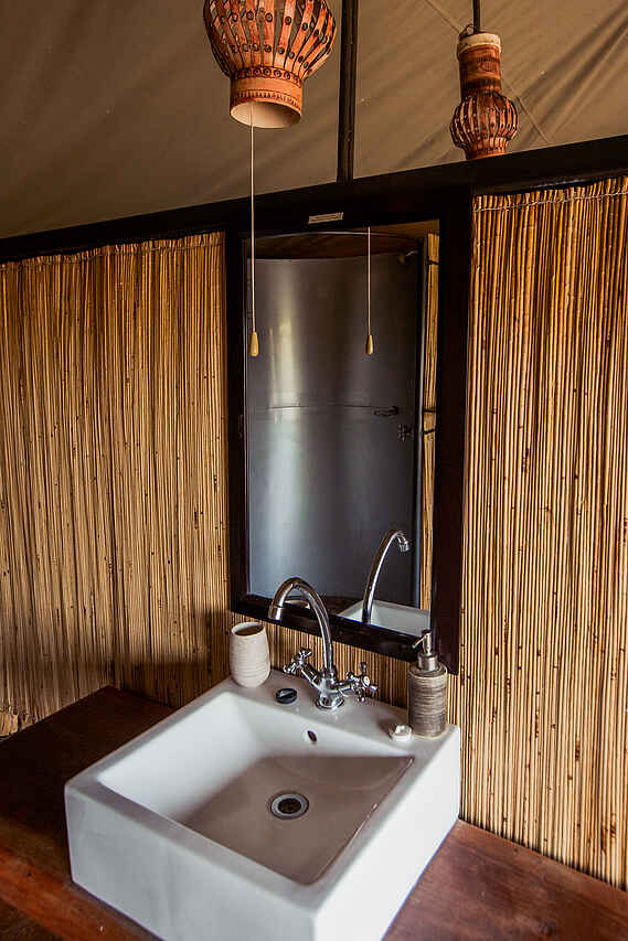 4 Gästezelte mit 32qm Fläche errichtet auf ca 50cm hohen Holzplattformen unter Bäumen. Vordächer für Sonnenschutz. Großes Doppelbett mit Moskitonetz, kleiner Schreibtisch. EInfache Teppiche. Liegestuhl unter dem Vordach. Private Bäder mit Dusche, einem Waschvbecken und WC. Fließend Kalt- und Warmwasser.