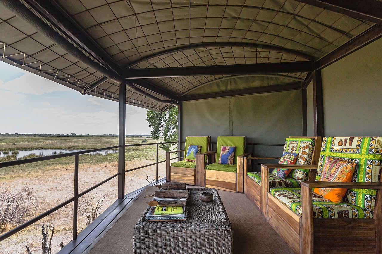 Das Hauptgebäude ist eine eigentümliche Konstruktion: Eine Art Turm mit 3 Etagen zieht sich im Halbrund um einen Jackalberry Tree nach oben. Ebenerdig die Rezeption, ein kleines Tauchbecken und Gästetoiletten. Über stählerne Außentreppen gelangt man nach oben, wo es zwei kleine Lounges mit Blick über die Wasserflächen gibt. Außerdem gibt es in der ersten Etage den kleinen Speisesaal mit Bar. Man hat viel Aufwand für ein Camp dieser Größe betrieben, aber das Ergebnis sind ungewöhnliche schöne Aussichten aus den oberen Etagen.