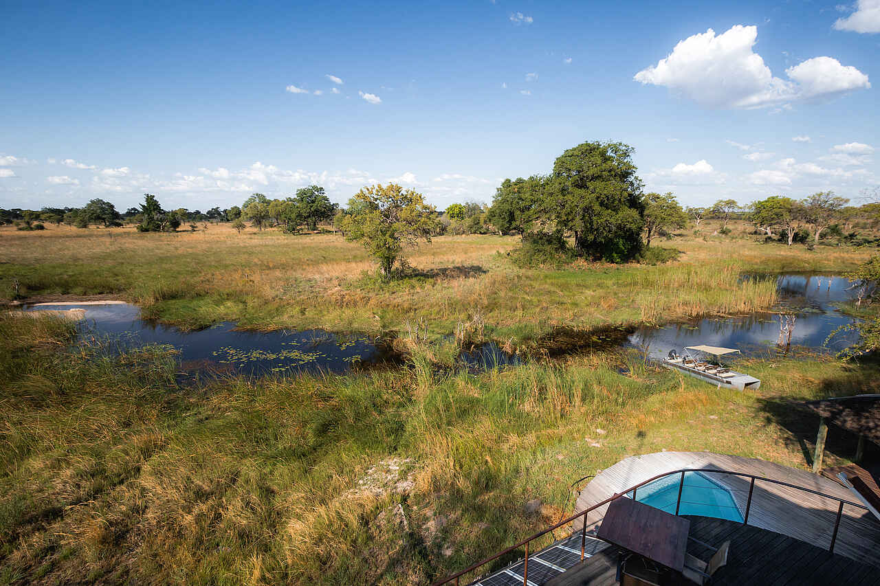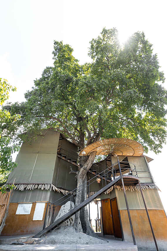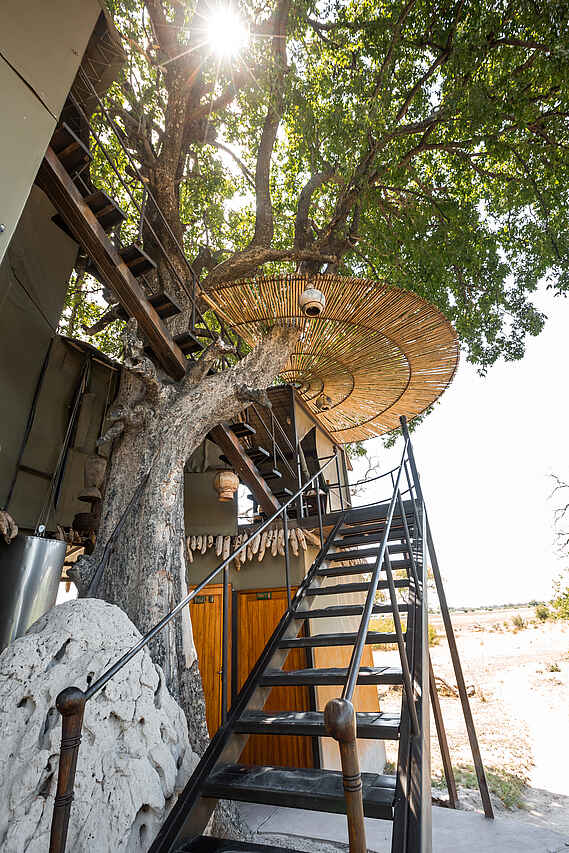 Kleines und einzigartig gestaltetes Camp in privater Konzession am Ufer des Linyanti River. Mit höchstens 8 Gästen ist ein intensives Erlebnis gewiss. Schöner Blick aus den oberen Etagen.
