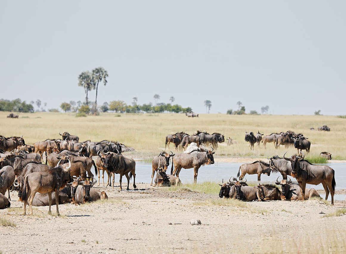 Während der Regenzeit von November bis März ziehen große Herden von Zebras und Gnus durch die Makgadikgadi-Salzpfannen, was die zweitgrößte Migration in Afrika darstellt. Diese Herden werden von den berühmten schwarzmähnigen Kalahari-Löwen und Geparden verfolgt. Zudem können Braune Hyänen, Elefanten, Giraffen, Springböcke und Oryxantilopen beobachtet werden. Erdmännchen sind oft in Familiengruppen anzutreffen und bieten mit ihrem posierfreudigen Verhalten ein charmantes und unterhaltsames Erlebnis. Ein besonderes Highlight sind die Flamingoschwärme, die ab Ende Januar die Pfannen bevölkern und ein atemberaubendes Naturschauspiel bereiten. Auch andere Vogelarten sind besonders während der Grünen Saison in großer Zahl anzutreffen.
