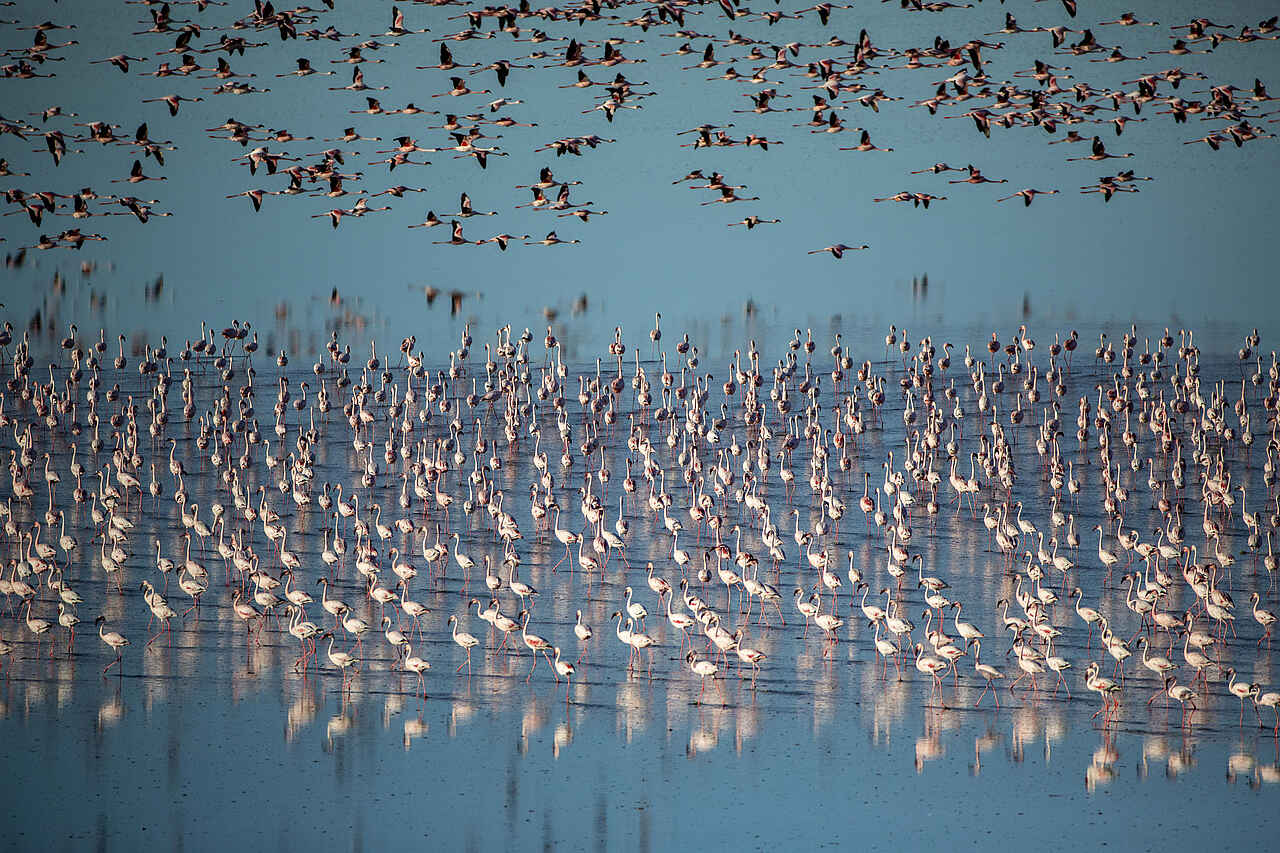 In der Regenzeit von November bis März findet die zweitgrößte Migration von Zebras und Gnus in Afrika statt, was ein spektakuläres Naturschauspiel verspricht. Die Landschaft wird grün und blüht auf, was besonders für Vogelbeobachtungen ideal ist. Ab Ende Januar bevölkern große Flamingoschwärme die Pfannen, und viele Jungtiere werden geboren, was zusätzliche interessante Beobachtungsmöglichkeiten bietet.