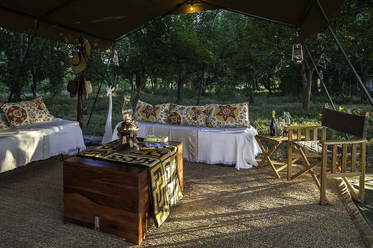 Das Camp umfasst in den zentralen Einrichtungen eine Lounge, eine Feuerstelle und einen wechselnden Speisebereich unter freiem Himmel. Die Einrichtung besteht aus Holzmöbeln wie Sofas, Tischen und Regiestühlen, die mit hellen, khakifarbenen oder farbenfroh gemusterten Textilien ergänzt werden. Die Lounge ist in einem an allen Seiten offenen Zelt mit einem dunklen Segeltuchdach untergebracht. In der Küche können elektrische Geräte aufgeladen werden. Es gibt zeitweise einen Aufstellpool.
