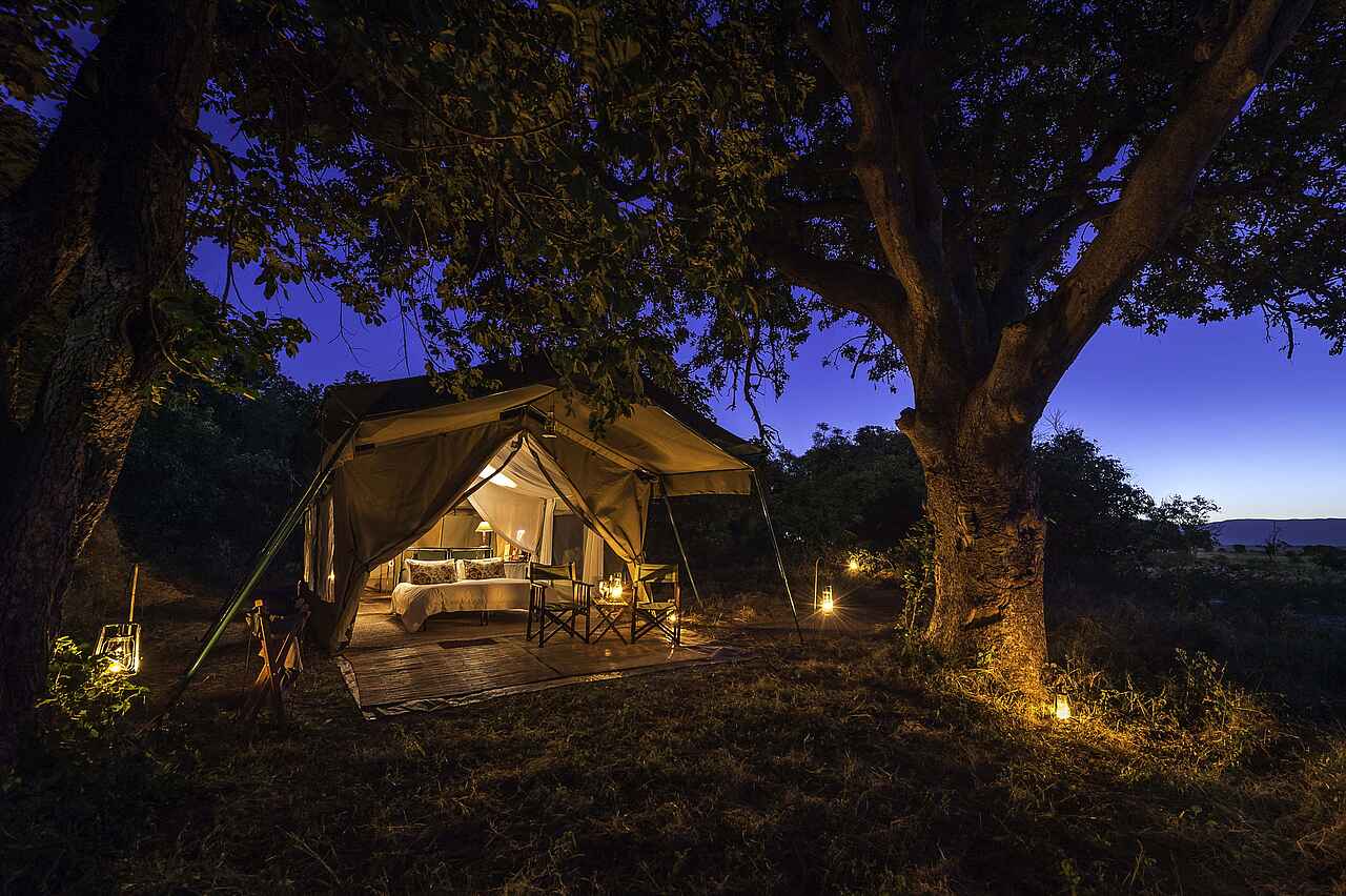 Alle Gästezelte sind im Merustil aus beigefarbenen Segeltuch erbaut, haben eine private Terrasse, große Fenster und einen großen Eingang, die mit Moskitonetzen und Segeltuchbahnen verschlossen werden können, sowie ein en-suite Bad mit Waschtisch, Spültoilette und einer Eimerdusche mit der Möglichkeit auf warmes Wasser. Fließendes Wasser ist vorhanden. Der Schlafraum ist mit einem Doppelbett oder zwei Einzelbetten, bei Bedarf kann ein drittes Bett für Kinder hinzugestellt werden, einem Klapphocker und auf der Terrasse mit einem Beistelltisch und zwei Regiestühlen ausgestattet. Die Möbel sind ebenfalls aus Holz oder aus Metall gefertigt. Es gibt eine Tee- und Kaffeeecke.