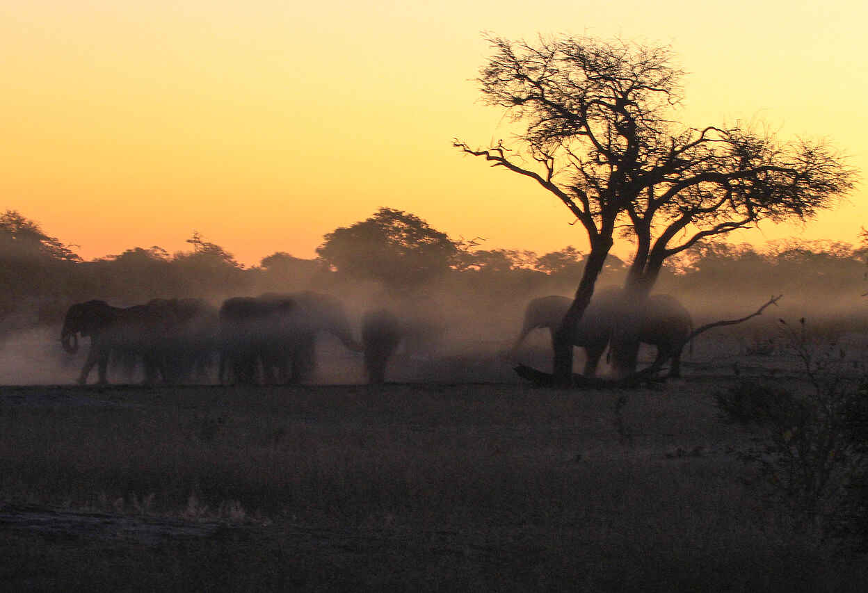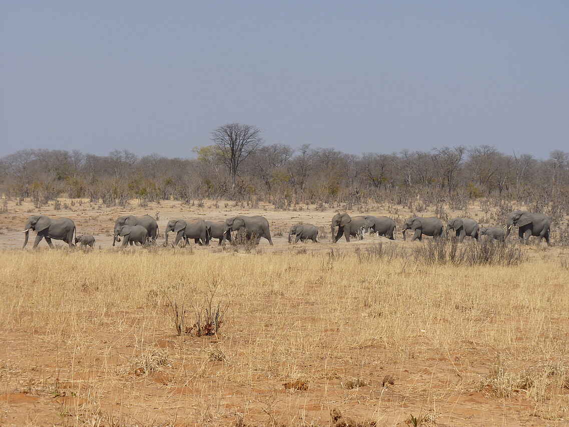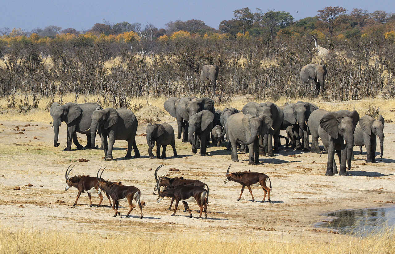 Hwange National Park ist bekannt für die Vielzahl an Elefanten und Vogelarten (über 400); außerdem: Löwen, Leoparden, Wildhunde, Tüpfelhyänen, selten Schabrackenhyänen, Büffel, Antilopen, Giraffen, Zebras