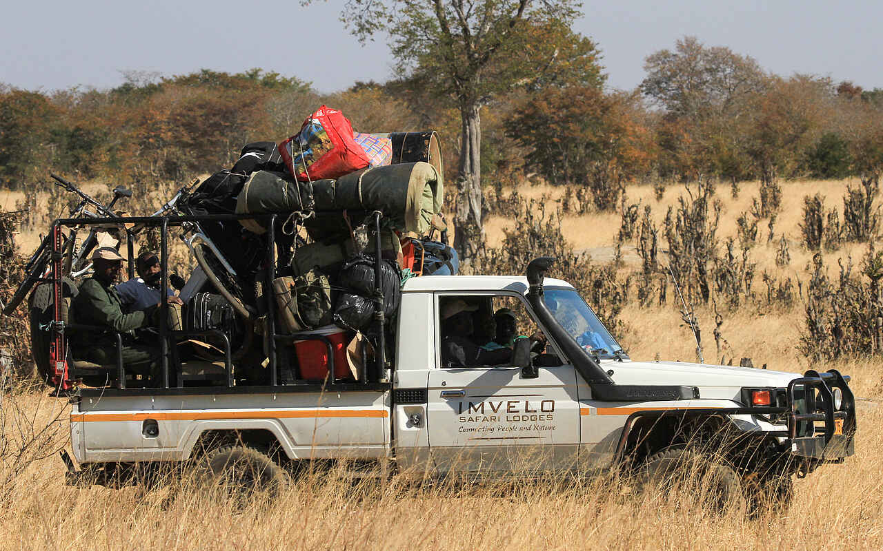 1. Möglichkeit: Game Drive ab der „Bomani Tented Lodge“ oder der „Camelthorn Lodge“ (je 6 Stunden Fahrt) mit Picknick 2. Möglichkeit: Flug (ca. 1 Stunde) von Victoria Falls zum Manga 3 Airstrip, von dort Transfer (3 Stunden) zum Camp; Victoria Falls wird hauptsächlich ab Johannesburg angeflogen