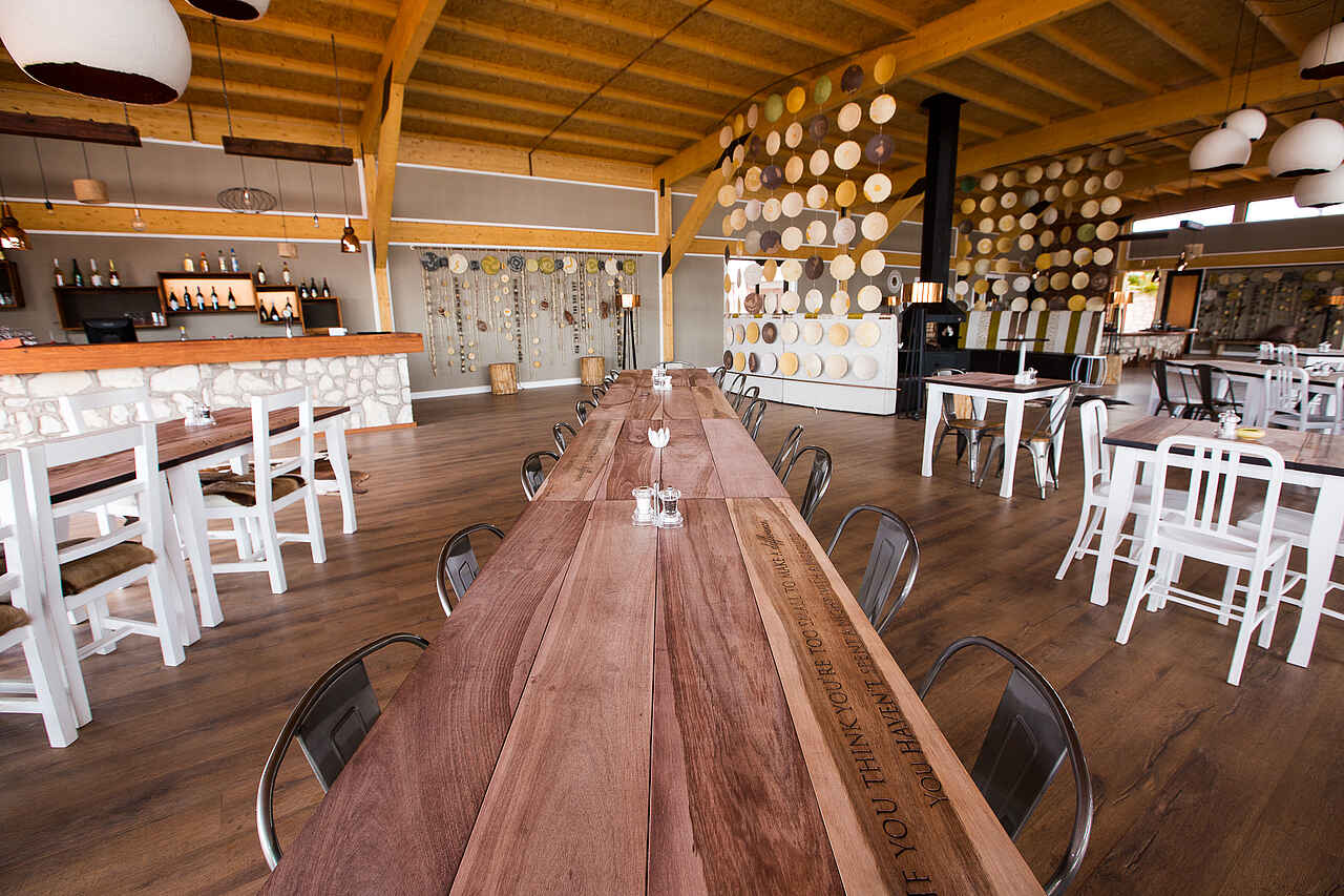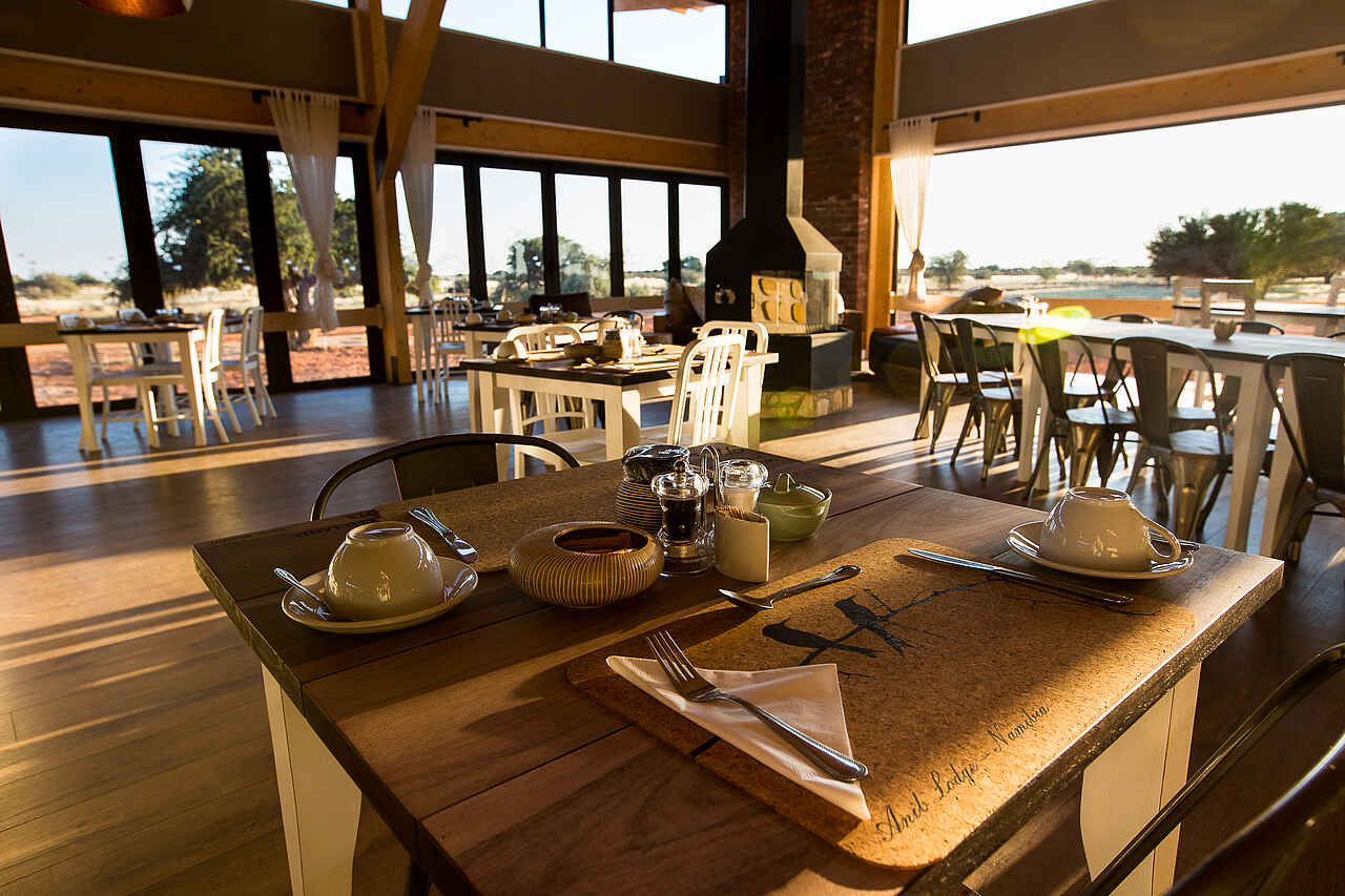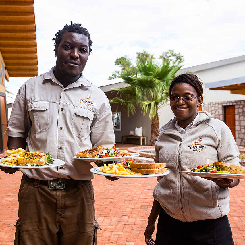 Gebucht wird die Kalahari Anib Lodge auf der Basis einer Halbpension. Das Frühstück steht in Form eines Buffets bereit, welches mit einer Auswahl an Früchten, Cerealien, Toast und auf Wunsch warmen Speisen und frisch gebackenem Brot aufwartet. Das Mittagessen besteht häufig aus Salaten oder Sandwiches, die von einer Speisekarte gegen Entgeld gewählt werden können. Das Abendessen wird oft in Buffetform gereicht.