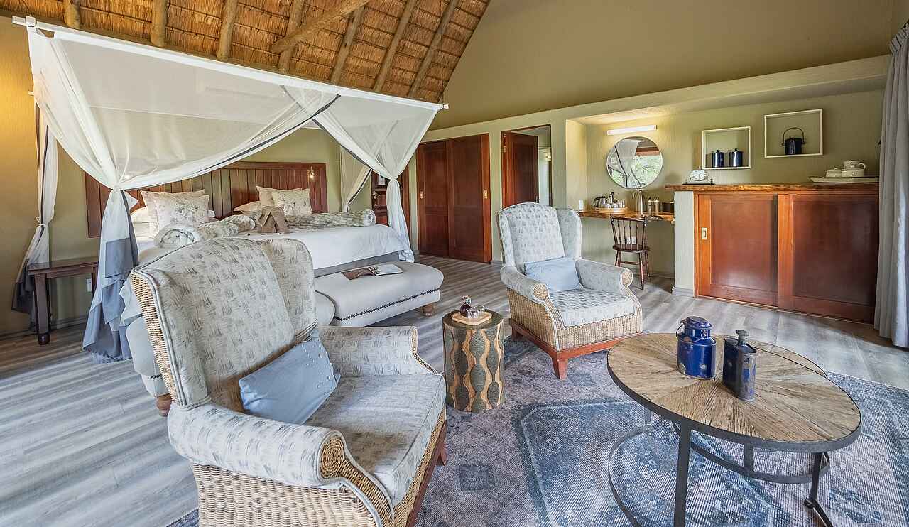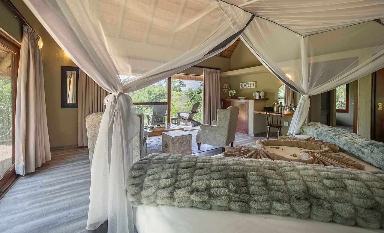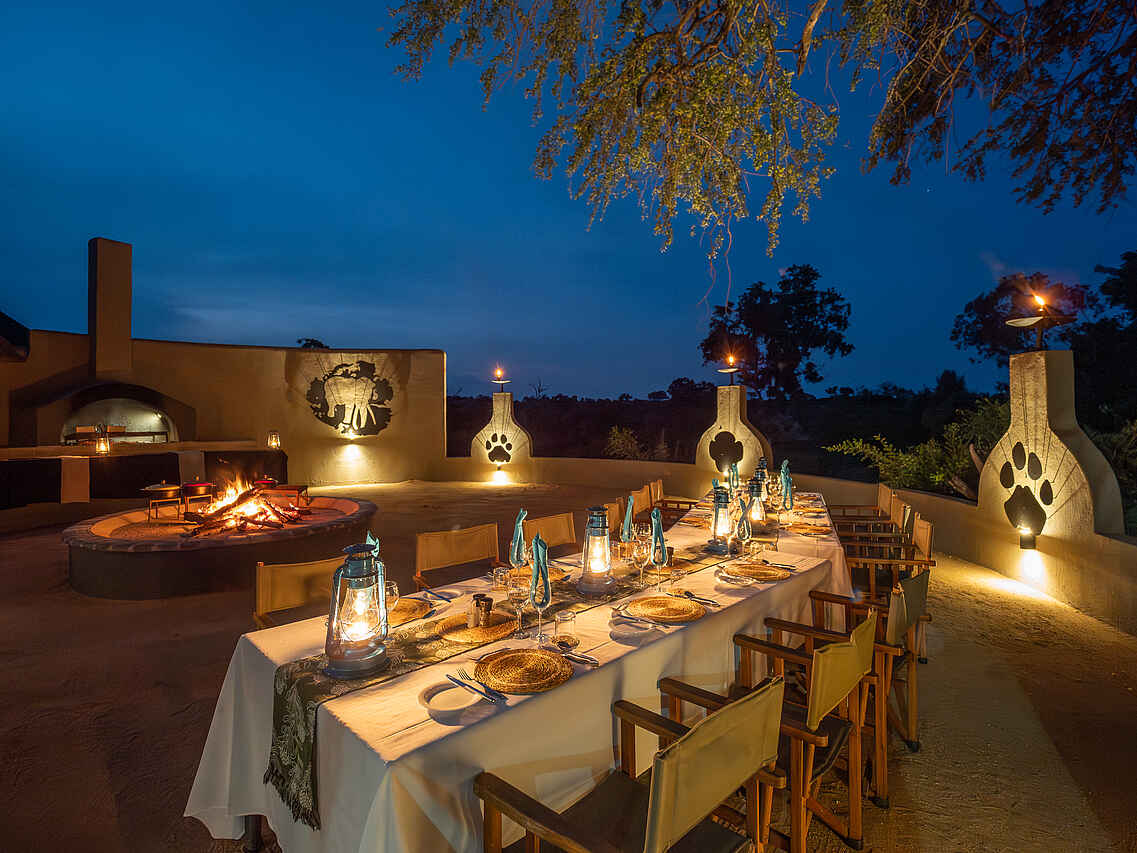 Diese luxuriöse Lodge bietet Gästen ein unvergleichliches Safari-Erlebnis inmitten unberührter Wildnis. Die Lodge ist bekannt für ihre erstklassige Lage entlang eines Flussbetts, das oft von Wildtieren besucht wird, sodass Gäste Tiere direkt von der Lodge aus beobachten können. Die intime Atmosphäre mit nur 10 Suiten garantiert ein persönliches und exklusives Erlebnis. Neben klassischen Pirschfahrten werden auch Buschwanderungen, Vogelbeobachtungstouren und entspannende Spa-Behandlungen angeboten.