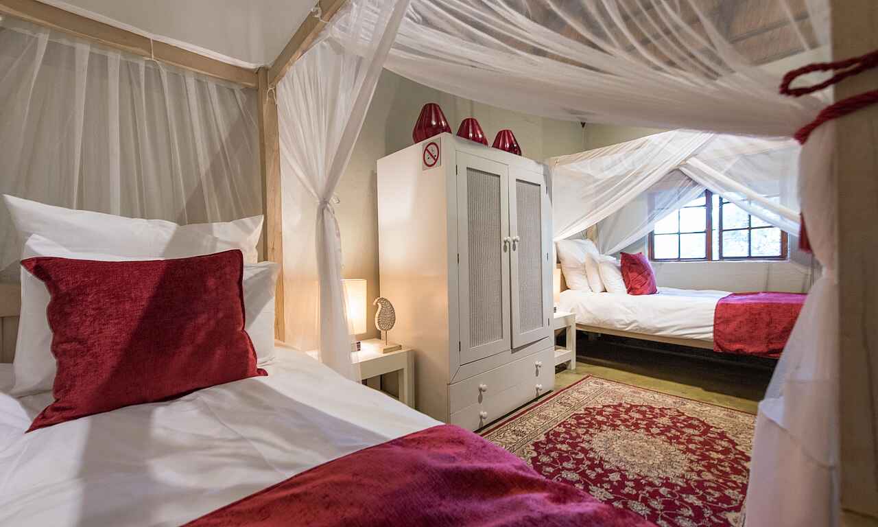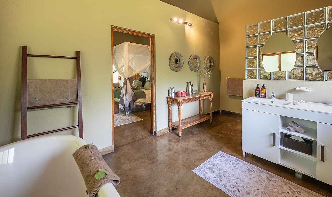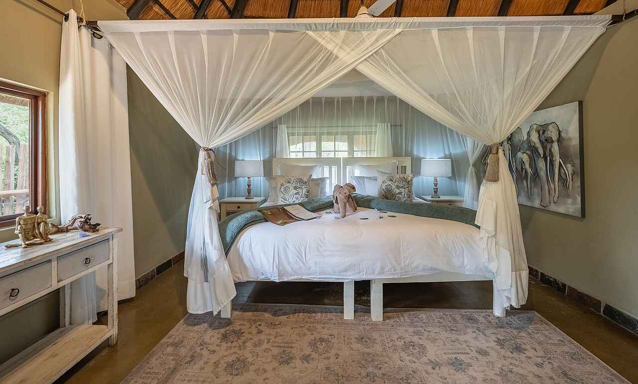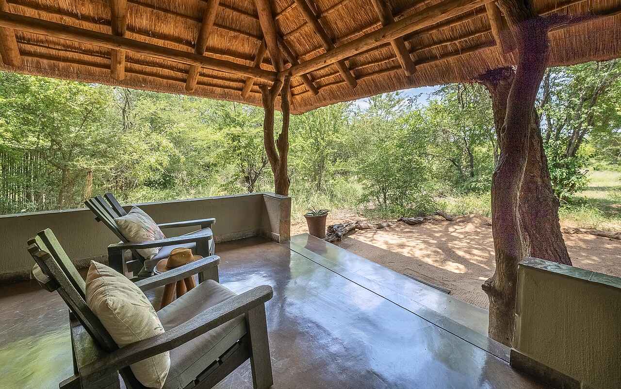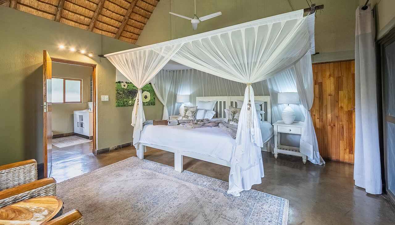 Die Chalets der Kambaku Safari Lodge bestehen aus Strohdach, Holz und Naturstein und versprühen authentisches Safari-Flair. Innen erwarten die Gäste bequeme Queensize- oder Twin-Betten mit Moskitonetz, Ventilatoren, Solarlampen und eine gemütliche Sitzecke. Die großzügigen En-suite-Bäder bieten eine freistehende Badewanne, eine Dusche, Doppelwaschbecken und ein WC. Familien können sich in geräumigen Chalets mit zwei Schlafzimmern und zwei Bädern einrichten. Auf der privaten Veranda lässt sich das Buschleben wunderbar beobachten. Kaffee und Tee stehen im Hauptbereich jederzeit bereit.