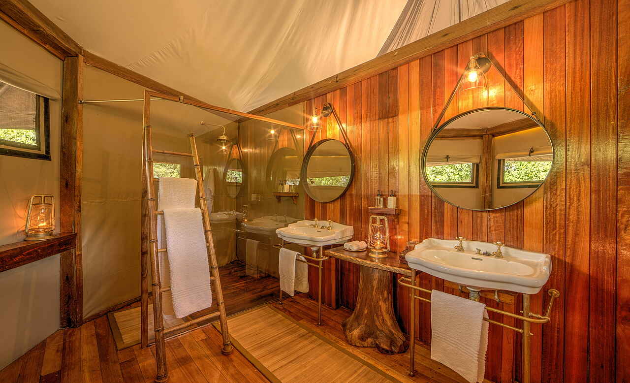 8 Safari-Zelte auf angehobenen Plattformen mit gutem Blick auf die Wasserwege rund um das Camp herum, davon ein neues Family Tent. Jedes Zelt mit eigenem Bad (fließend Kalt- und Warmwasser, WC), Sitzgelegenheiten, Tisch. 6 Zelte mit Doppelbetten, 1 Zelt mit französischen Betten, das Familienzelt mit einem zusätzlichen Schlafzimmer.