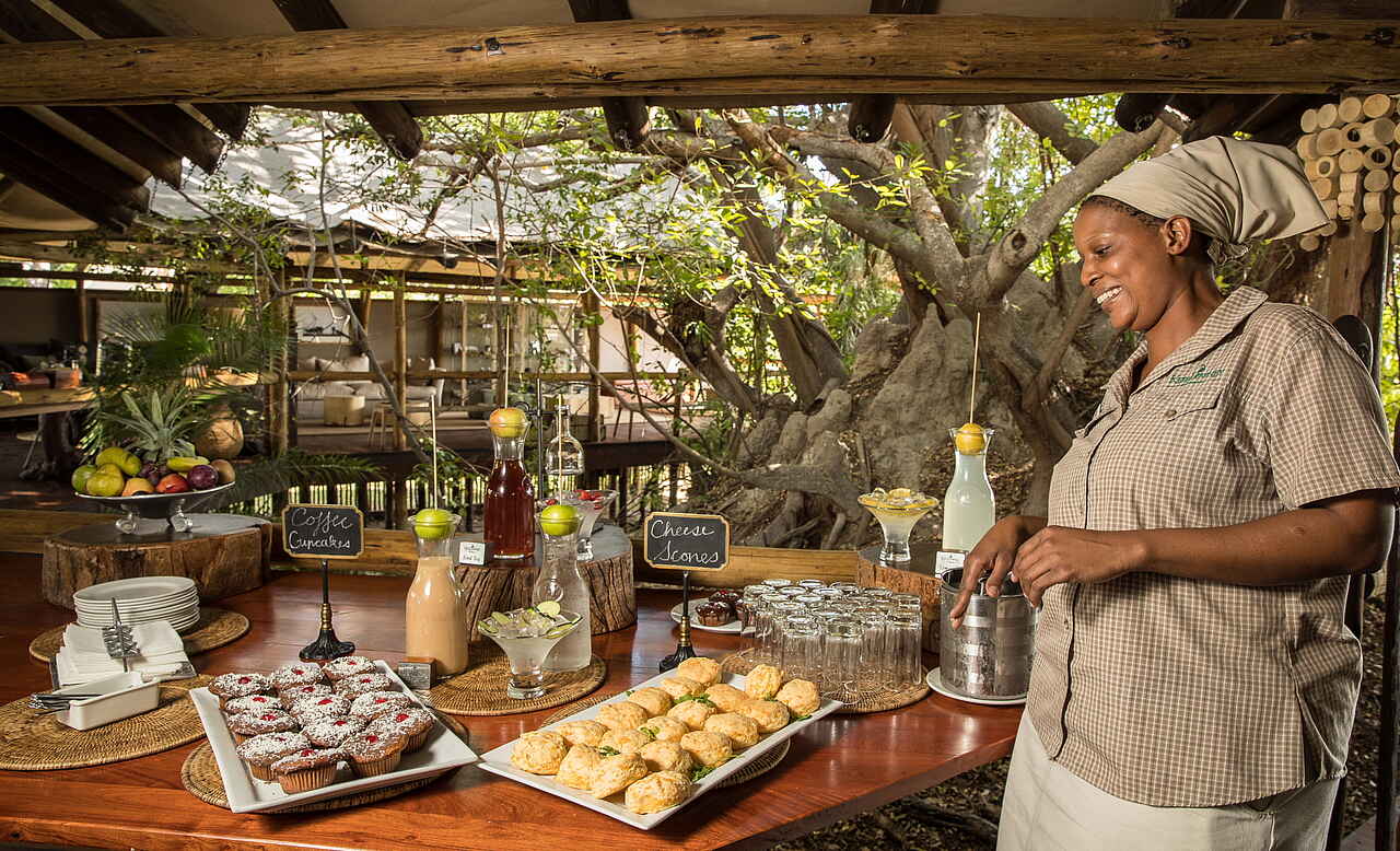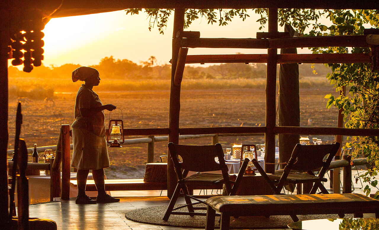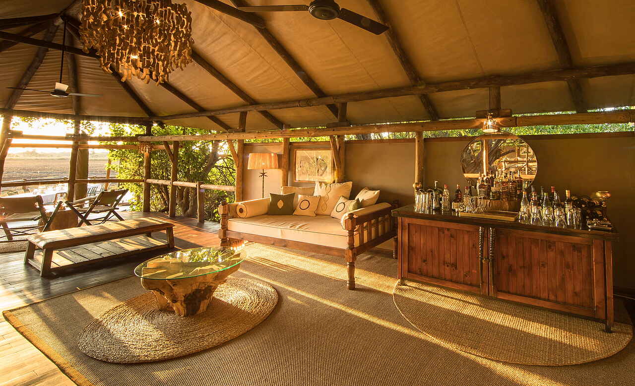 Gesamte Lodge im Safaristil, das zentrale Deck ist rund um einen riesigen Feigenbaum konstruiert, Lagerfeuer direkt am Ufer.
