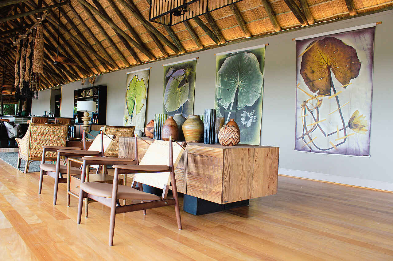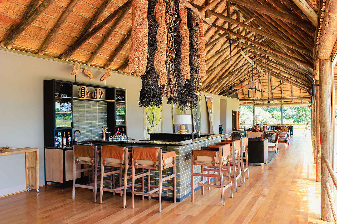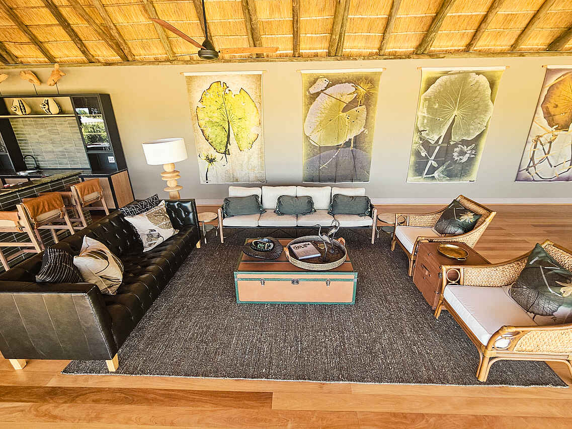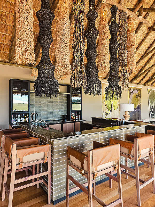 Der zentrale Bereich des Kanana Nyana Camp ist großzügig gestaltet und umfasst eine einladende Lounge, eine Bar sowie einen separaten Speiseraum. Großzügige Sitzgruppen bieten einen angenehmen Rückzugsort zwischen den Pirschfahrten. Die offene Bauweise schafft fließende Übergänge zur umliegenden Landschaft und lässt viel Licht in die Räume. An der Bar steht eine Auswahl an Weinen, Spirituosen und alkoholfreien Getränken bereit. Ein kleiner Fitnessraum ergänzt das Angebot, Wellnessanwendungen können in der eigenen Suite arrangiert werden. Die erhöhte Lage oberhalb des Xudum River eröffnet auch vom Hauptbereich aus weite Ausblicke über Wasserflächen und Ebenen.