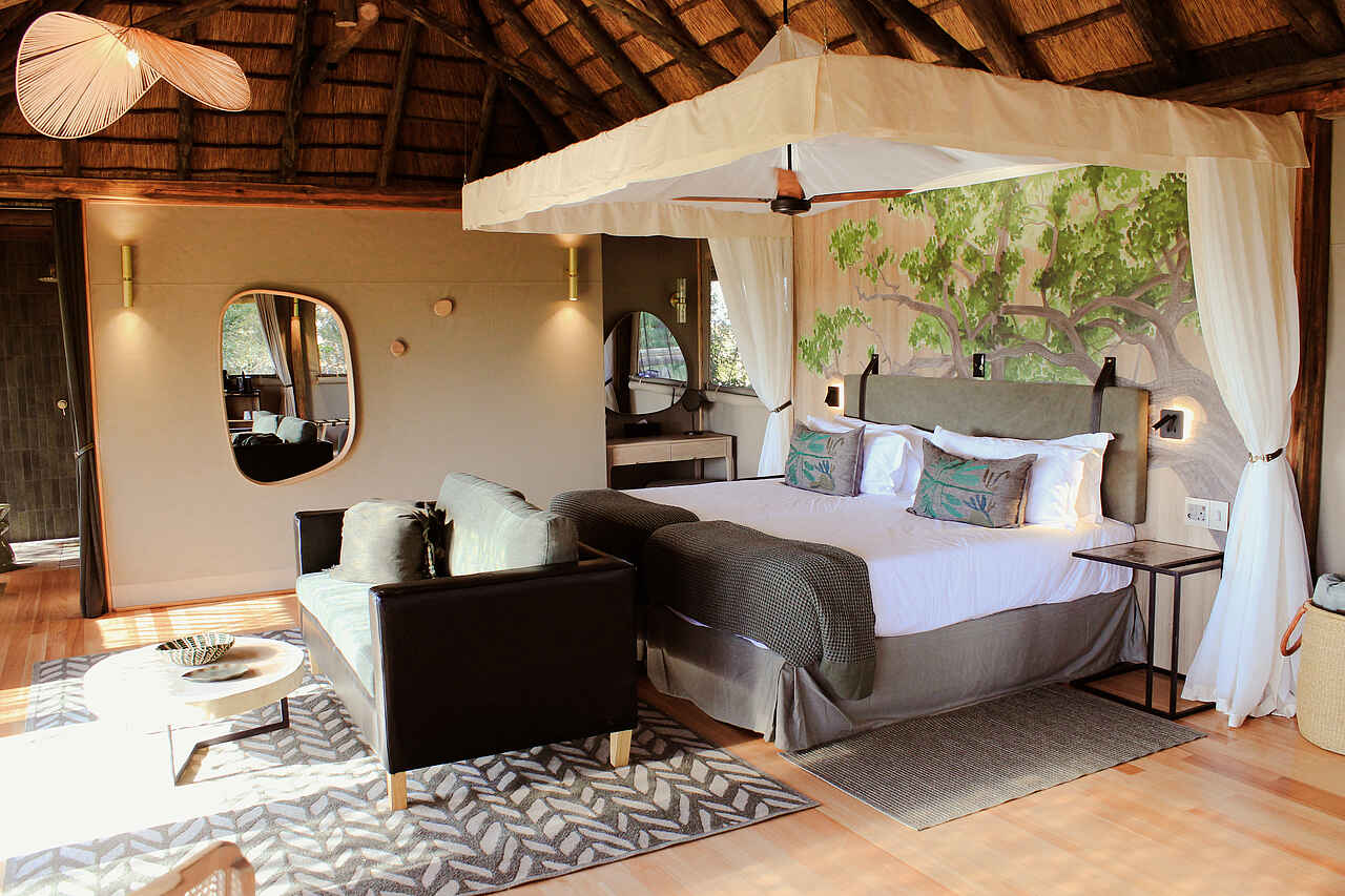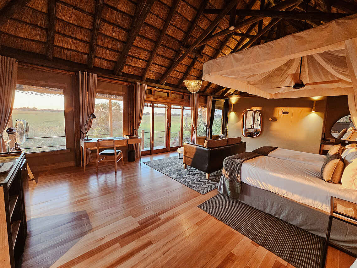 Das Kanana Nyana Camp verfügt über vier freistehende, reetgedeckte Safari-Suiten. Jede Suite ist individuell gestaltet und greift in Farben und Details charakteristische Baumarten des Deltas wie Marula, Ebenholz oder Mokolwane-Palmen auf. Großzügige Fensterflächen lassen viel Tageslicht einfallen und öffnen den Blick in die umliegende Landschaft. Im Inneren erwarten Gäste ein komfortables Schlafzimmer mit großem Bett und Moskitonetz, ein separater Wohnbereich sowie ein En-suite-Badezimmer. Jede Suite verfügt zudem über einen privaten Plunge Pool und eine großzügige Terrasse. Warme Holzelemente, natürliche Materialien und sorgfältig ausgewählte Textilien prägen das Interieur und unterstreichen den hochwertigen Anspruch des Camps.